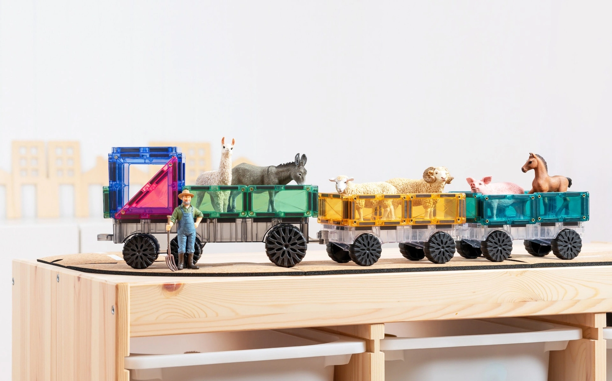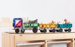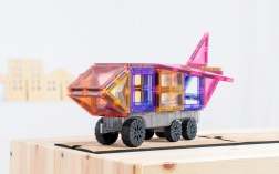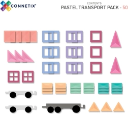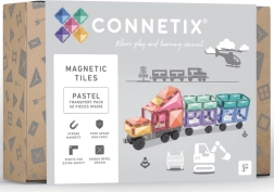 Пастелният CONNETIX Transport Pack предлага 50 издръжливи, прозрачни елемента със силни неодимови магнити и три шасита с колела. Децата лесно изграждат автомобили, влакове или футуристични машини, като естествено се запознават с геометрия 2D/3D, симетрия и принципи на физиката (равновесие, стабилност, причина–следствие). Елементите се свързват сигурно от всички страни, а „щрак“ при съединяване насърчава нови опити.