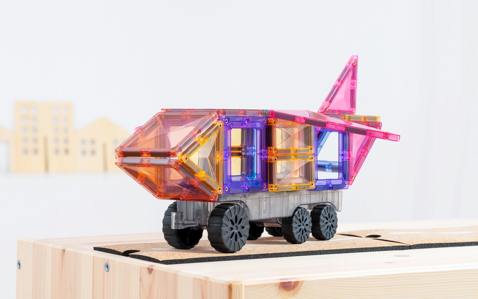 Три шасита с колела превръщат конструктора в автомобили, влакове или ракети. Децата строят, пренареждат и изследват движението и стабилността на конструкциите на практика.