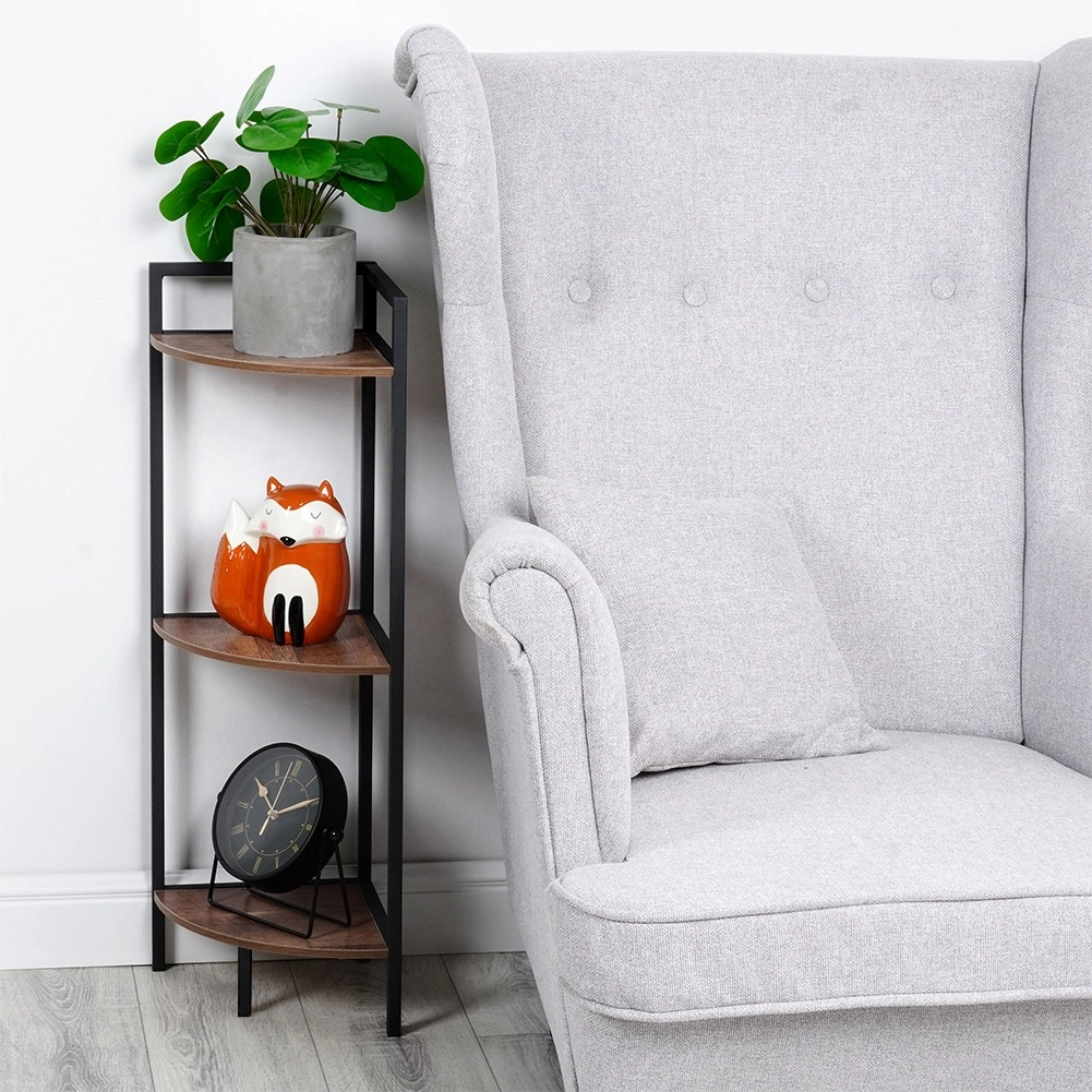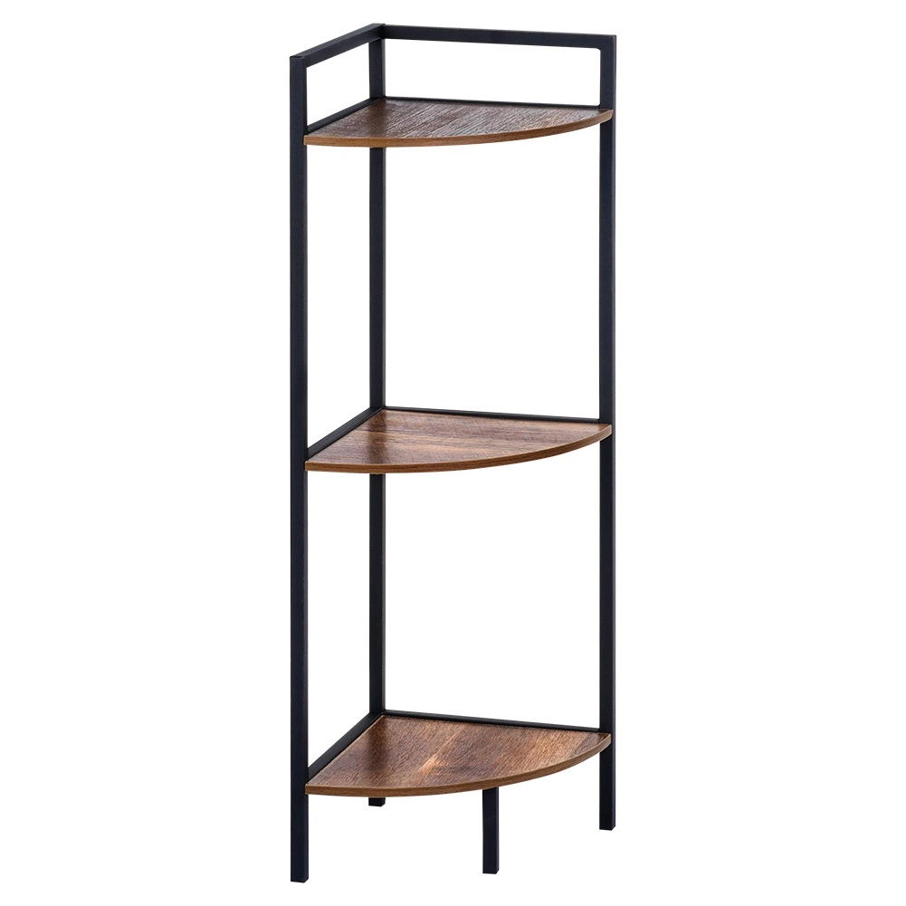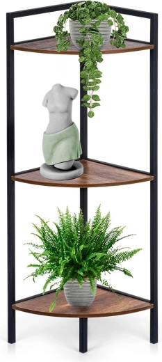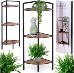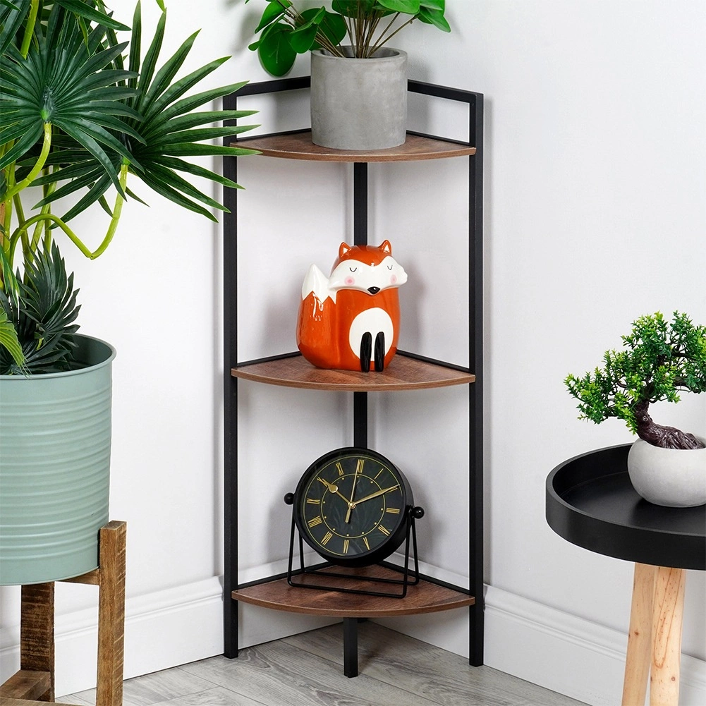 Ъгловият рафт с размери 23,5 × 23,5 × 76 см е умно решение за малки и по-големи пространства. Минималистичният дизайн в комбинация от черен метал и дървесен декор изглежда лек и модерен, докато трите просторни полици осигуряват подредено съхранение и стилна презентация на любимите ви предмети.