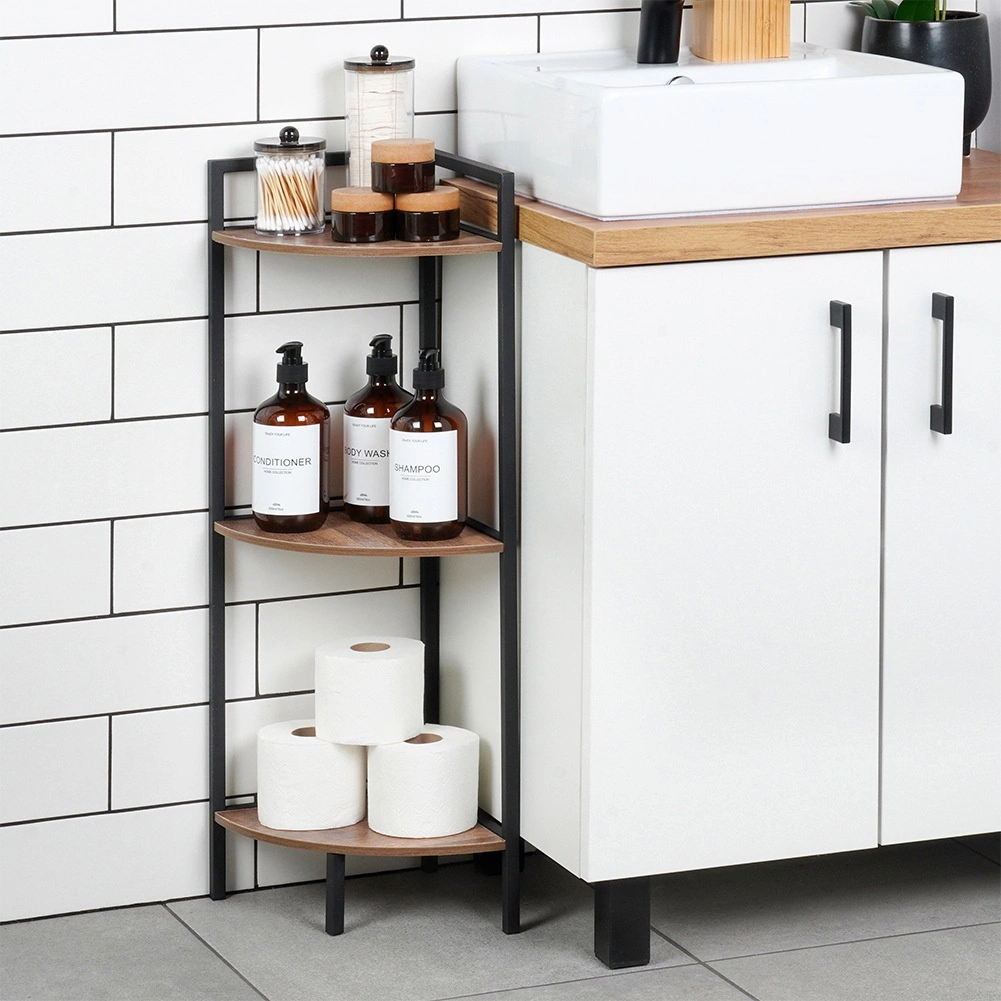 Елегантен ъглов рафт с три полици спестява място и предлага практично вертикално съхранение за декорации, книги или козметика. Стабилната метална конструкция в черно и полици от MDF с дървесен декор пасват на всеки интериор. Благодарение на правия ъгъл 90° прилепва идеално в ъгъла и намира универсално приложение в дневната, кухнята и банята.