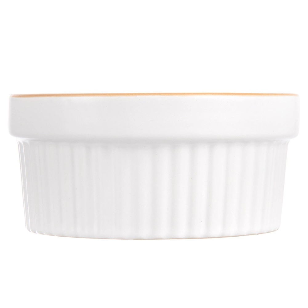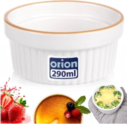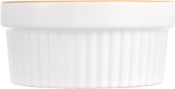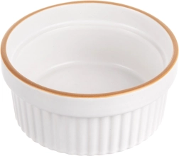 Практична керамична купичка за запичане с обем 290 мл и диаметър 11,5 см, идеална за crème brûlée, суфле, мини запечени ястия и десерти. Издръжливата керамика с бяла глазура и кафяв ръб осигурява равномерно изпичане и елегантно сервиране. Подходяща за фурна (до 200 °C), микровълнова и съдомиялна.