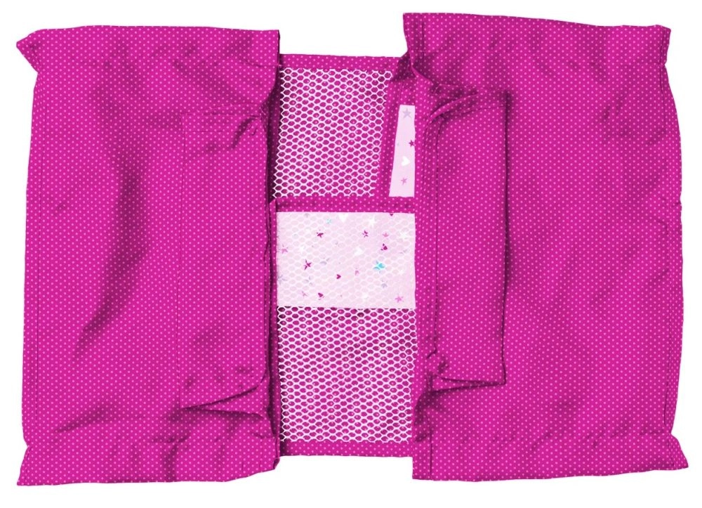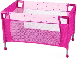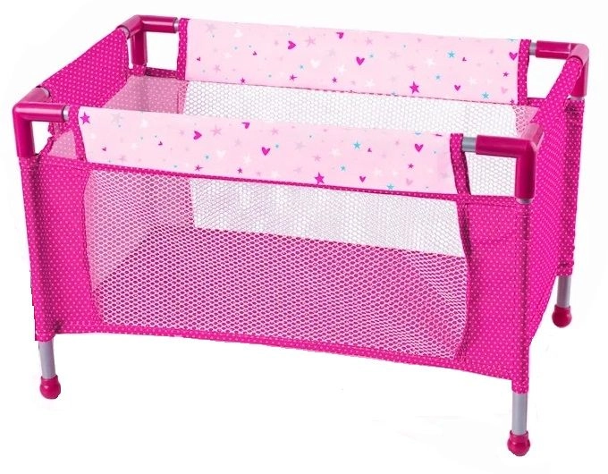 Розовото легълце с метална рамка е идеално за игра у дома и навън. То е преносимо и леко.