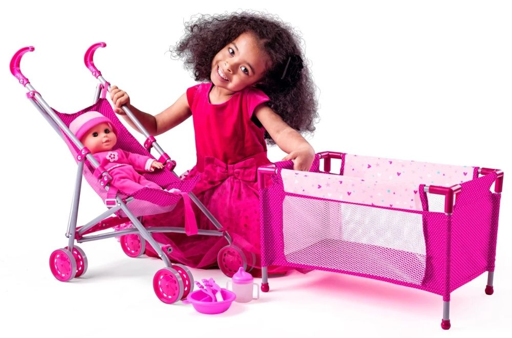 Този красив комплект включва всичко, от което вашето дете се нуждае, за да се грижи за любимата си кукла. Част от комплекта е спортна количка с метална конструкция, която е изключително практична благодарение на лесното боравене. Добавено е и пътно легълце, идеално за игра както у дома, така и навън.