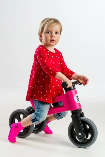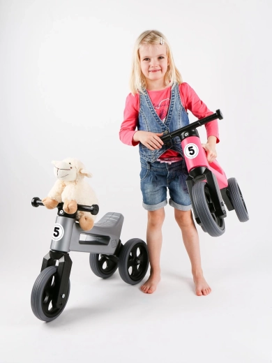 Започнете със стабилна триколка и когато е време за тренировка на равновесие, просто заменете двете задни колела с едно. Идеално за плавен преход към първото истинско колело.