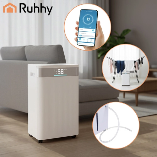 Мощният домашен обезвлажнител на въздух Brisoo 2000 от марката Ruhhy ефективно намалява влагата и защитава стените, мебелите и дрехите от плесен и застояла миризма. Предлага капацитет до 20 л/24 ч, голям резервоар 4,3 л, тиха работа 43 dB, режим Пране за по-бързо сушене и управление чрез Wi‑Fi и приложението Smart Life за максимално удобство.
