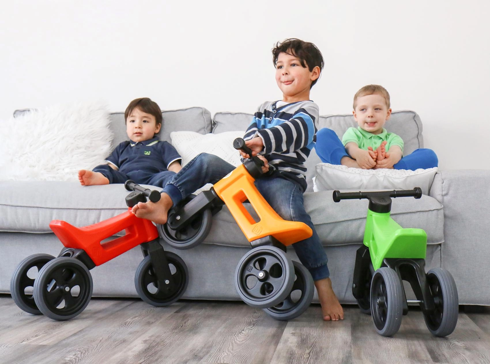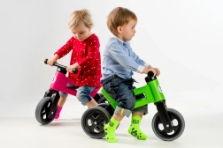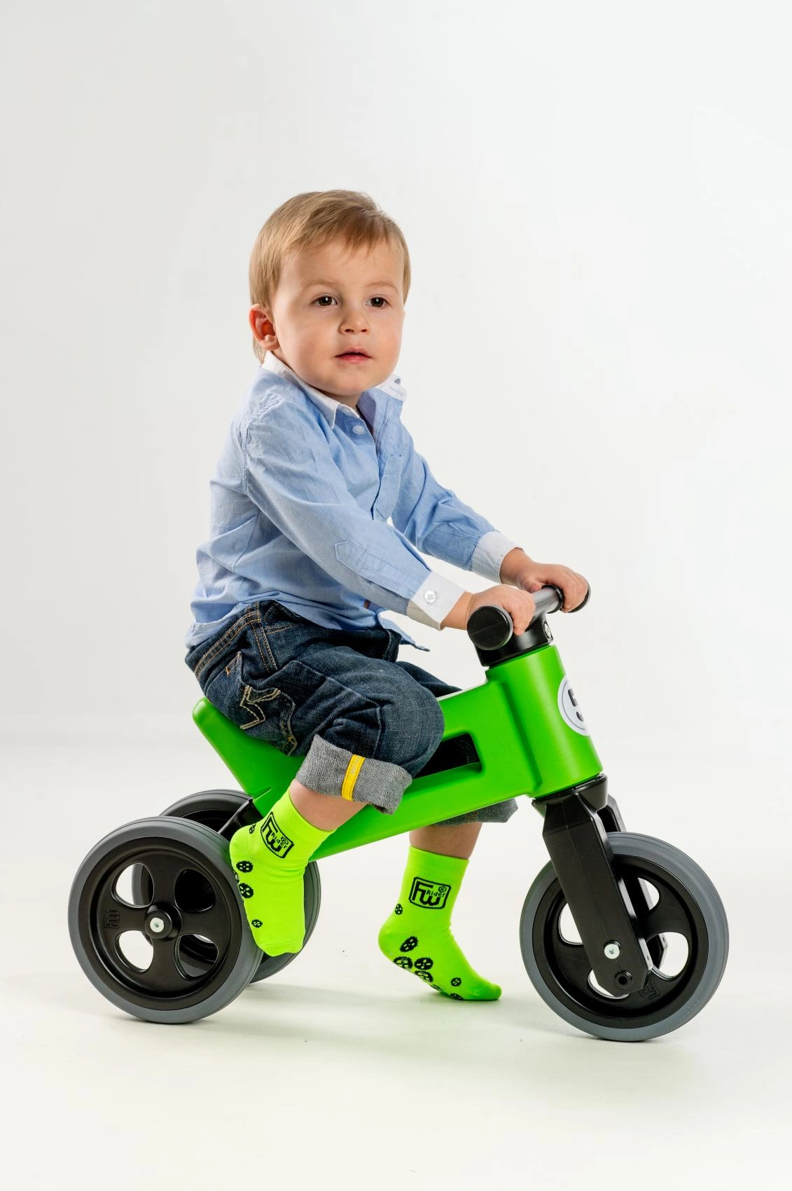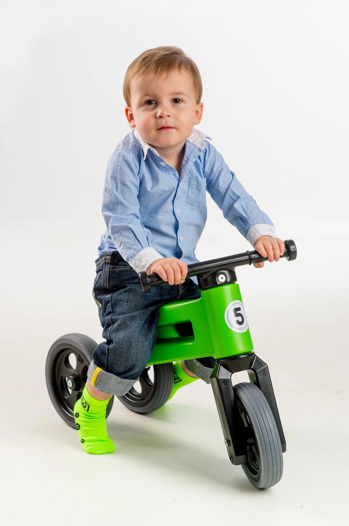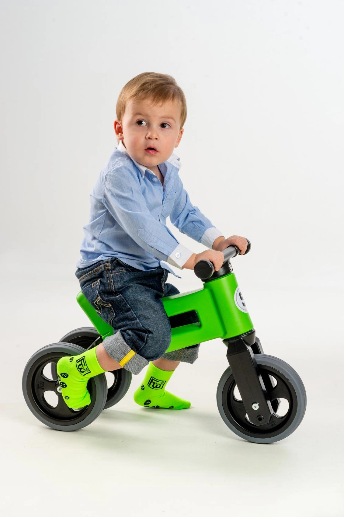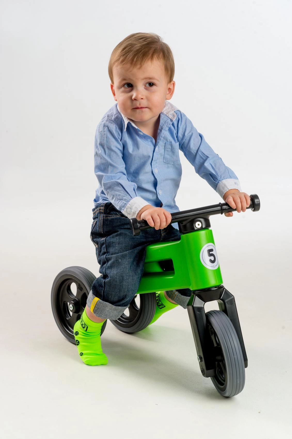 FUNNY WHEELS Rider Sport 2в1 носи радост от движението за децата и умно дългосрочно решение за родителите. Лесно го преобразувате за няколко минути от триколка в двуколка и настройвате две позиции на височината на седалката според растежа на детето. Тихите гуми не скърцат и не се пързалят, което ги прави идеални за гладки повърхности и външни тротоари.