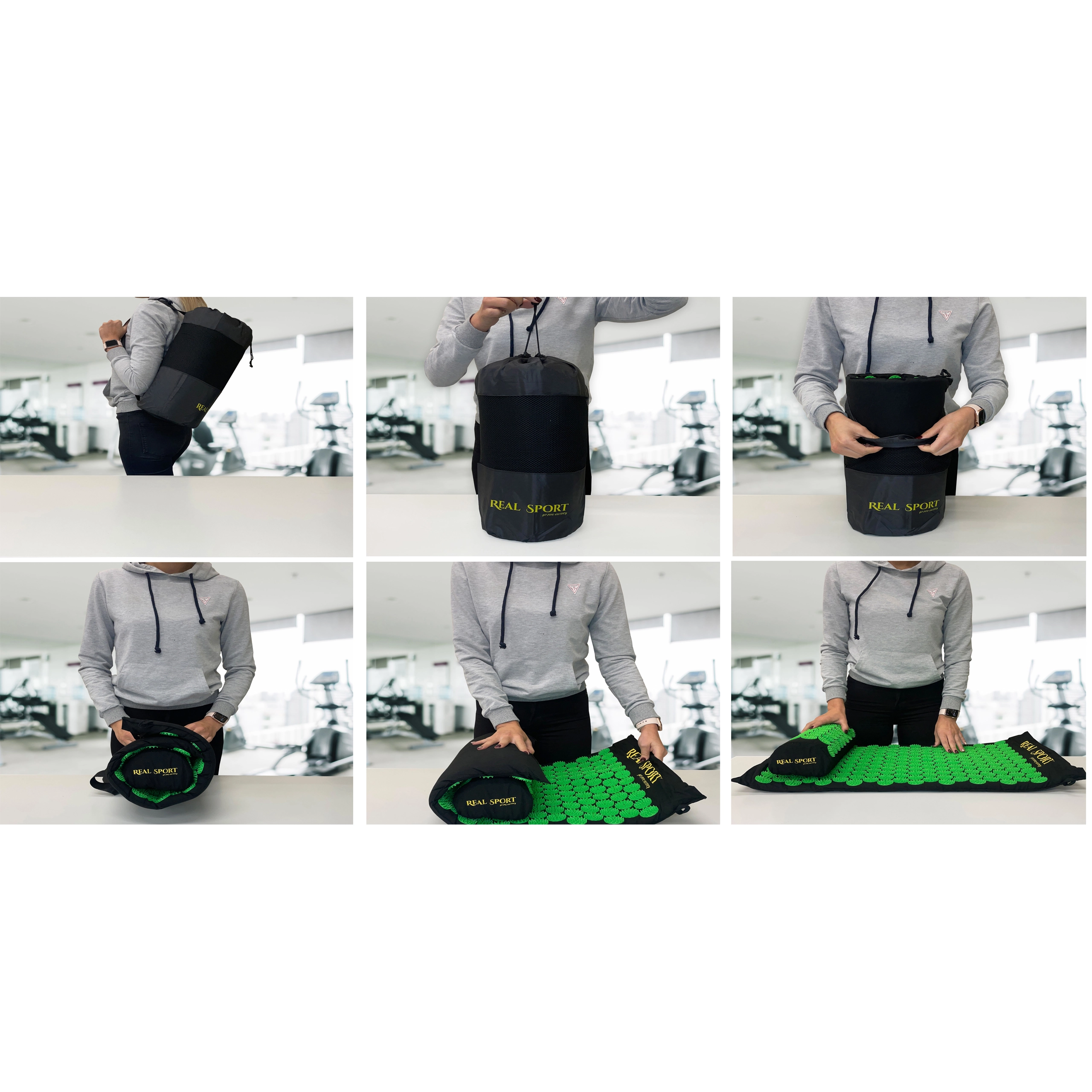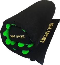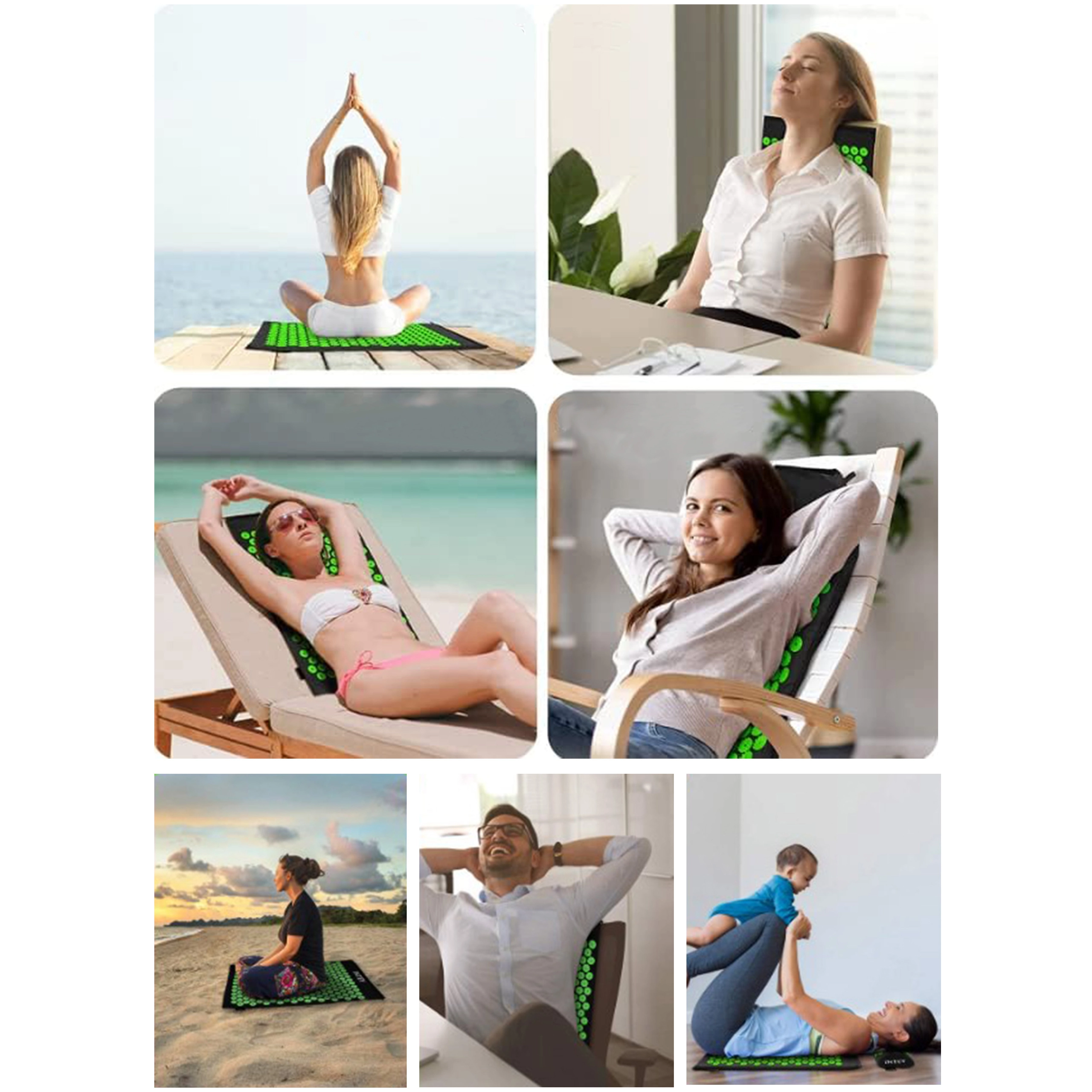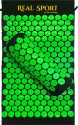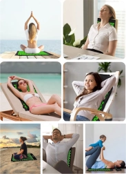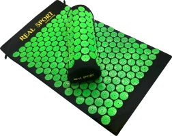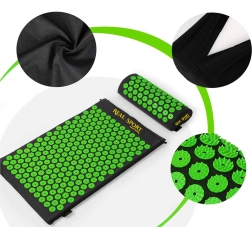 Акупресурният комплект (постелка + възглавничка) имитира ефекта на традиционната акупресура и помага за намаляване на напрежението в гърба, шията и раменете. Десетки зелени дискове с шипове въздействат върху точките на натиск, като подпомагат мускулната регенерация и естественото кръвообращение. Благодарение на леката конструкция и калъфа лесно го носите у дома, в офиса и по време на път.