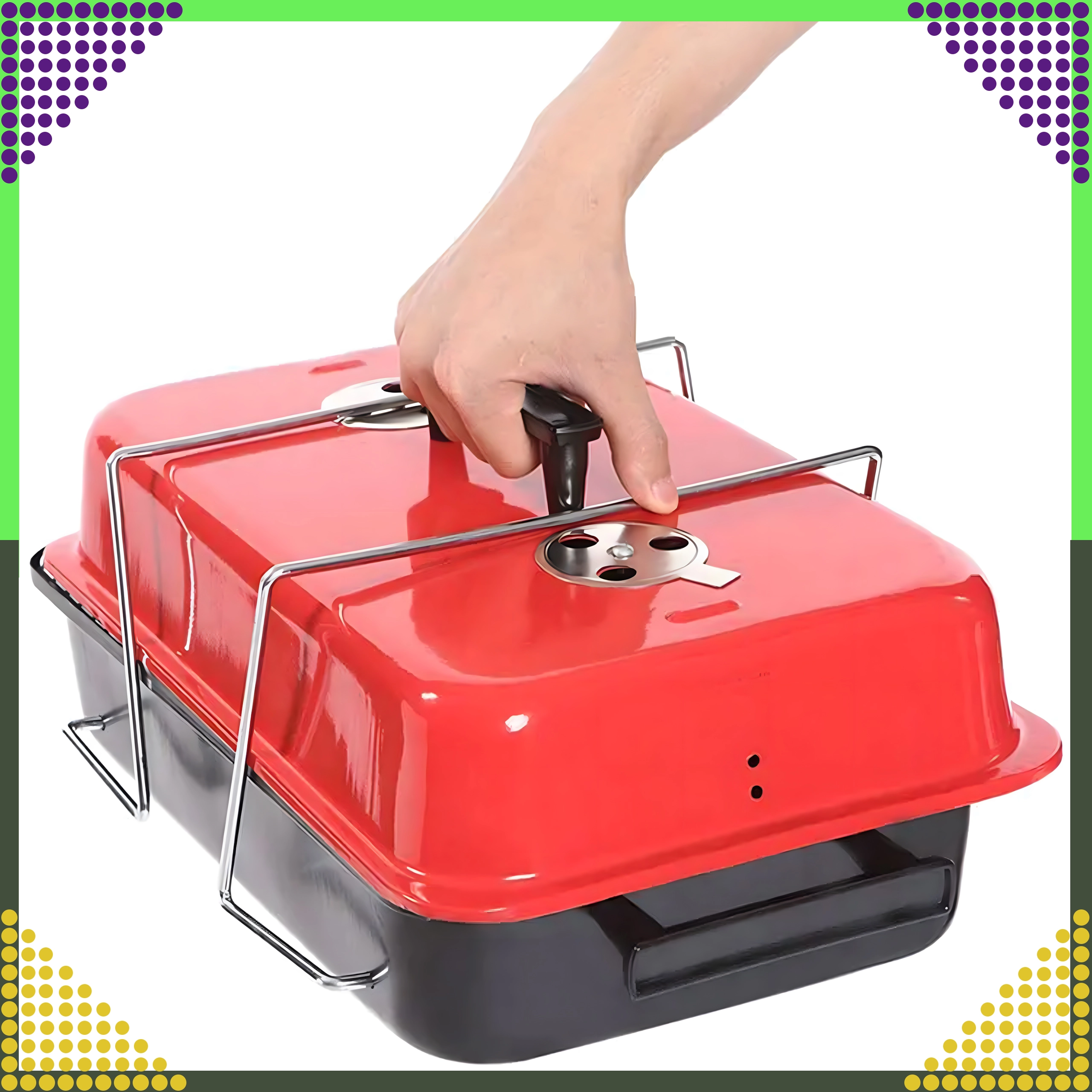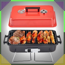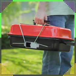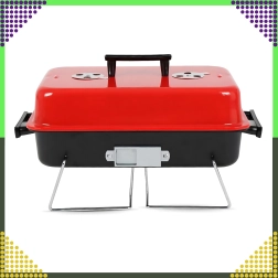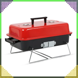 Компактен настолен грил на дървени въглища с капак, идеален за къмпинг, пикник, плаж и градина. Благодарение на сгъваемите крака и заключващия механизъм на капака се пренася лесно, побира се в багажника и предлага удобен контрол на температурата чрез вентилационни отвори. Хромираната скара осигурява равномерно печене, а компактните размери 43 × 28 × 26 cm улесняват съхранението.