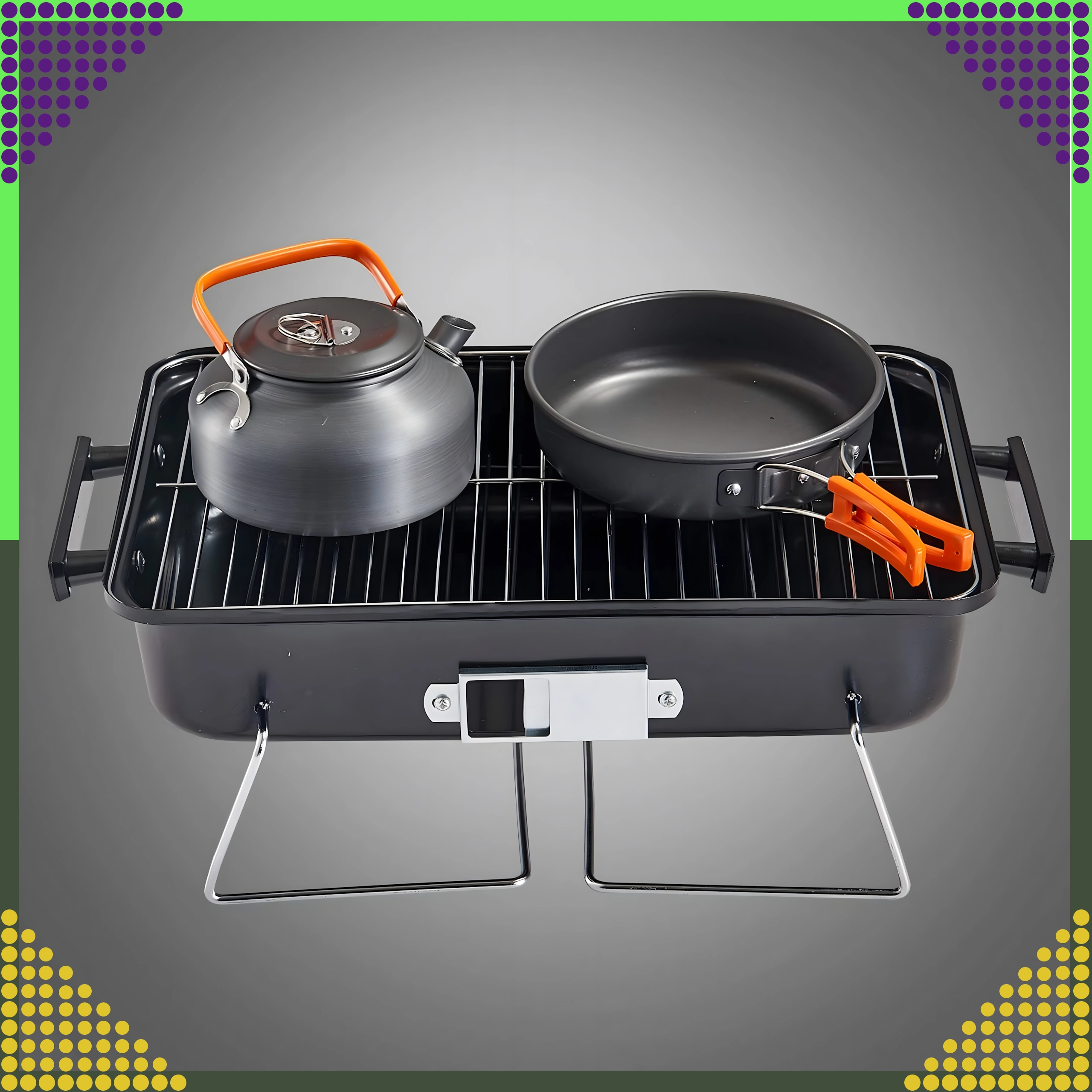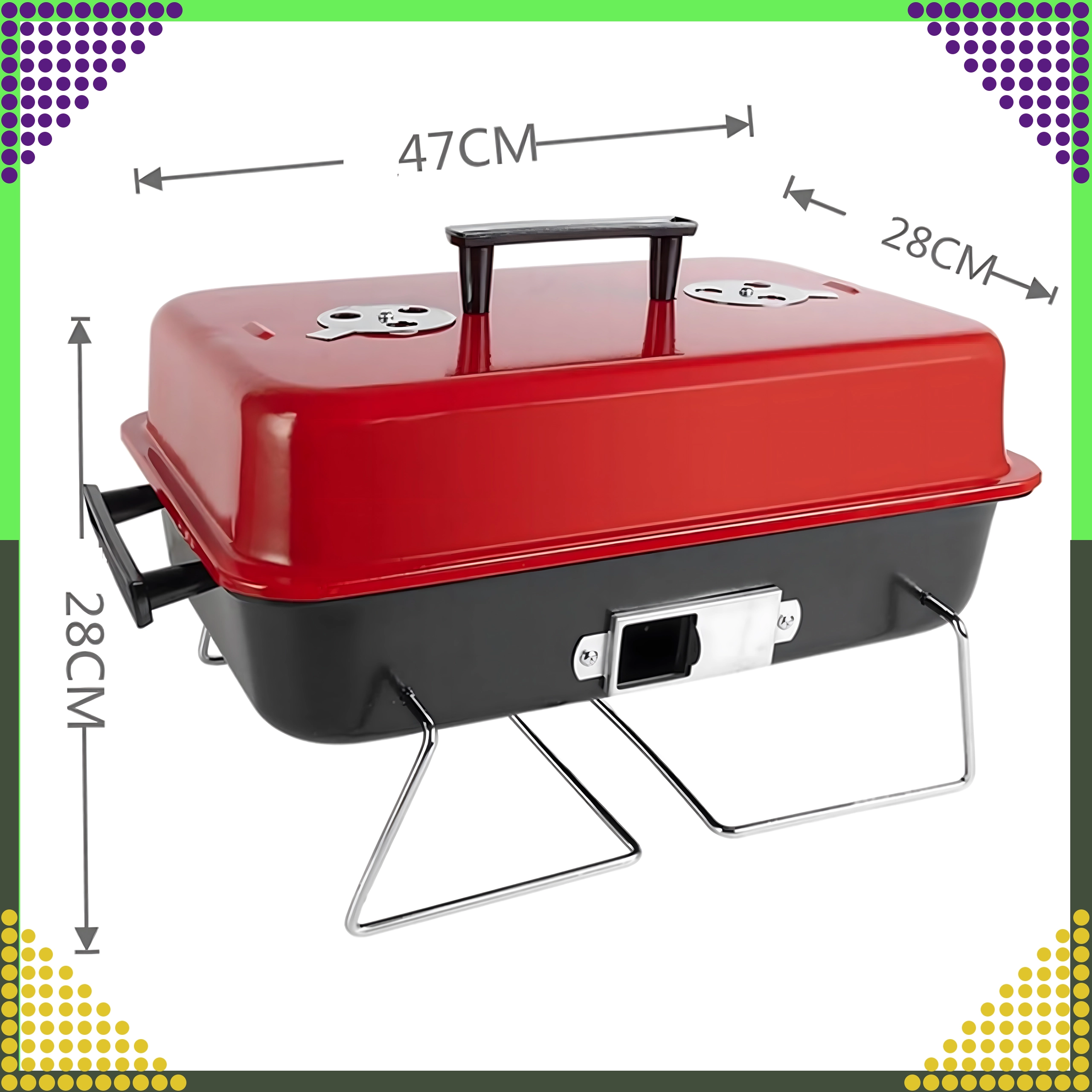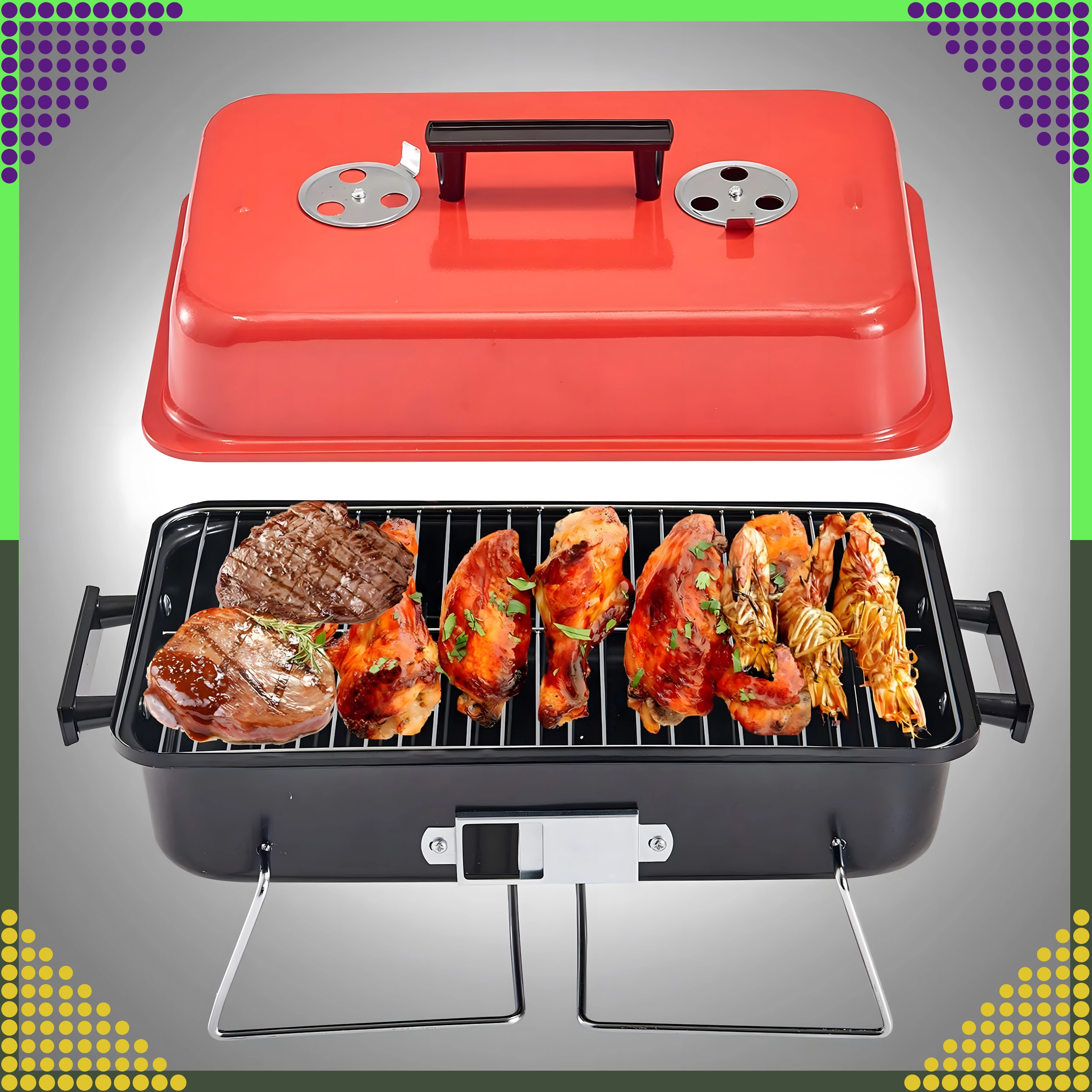 Сгъваемите крака и фиксираният капак позволяват удобно пренасяне и съхранение – идеално за къмпинг, пикник и пътуване с кола.