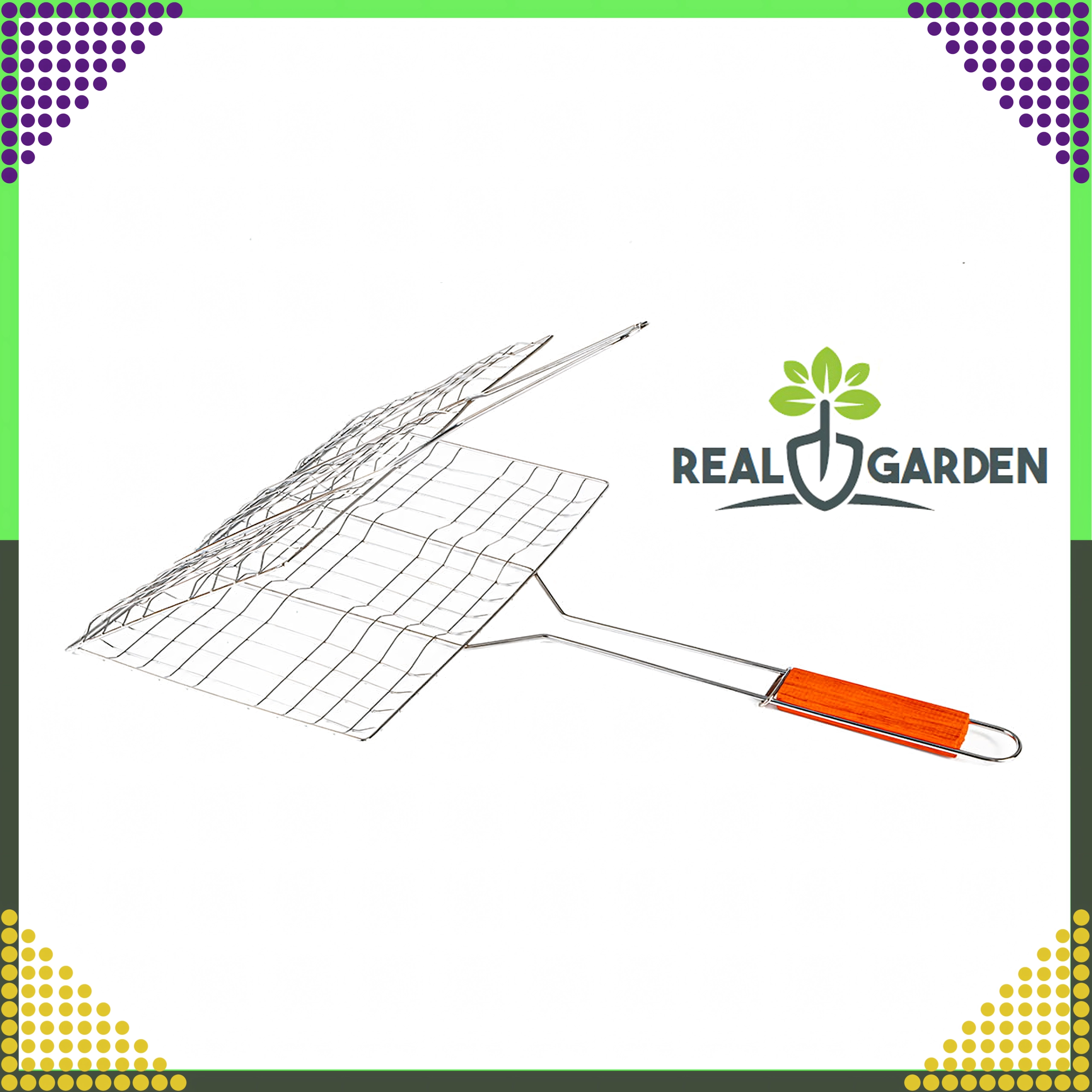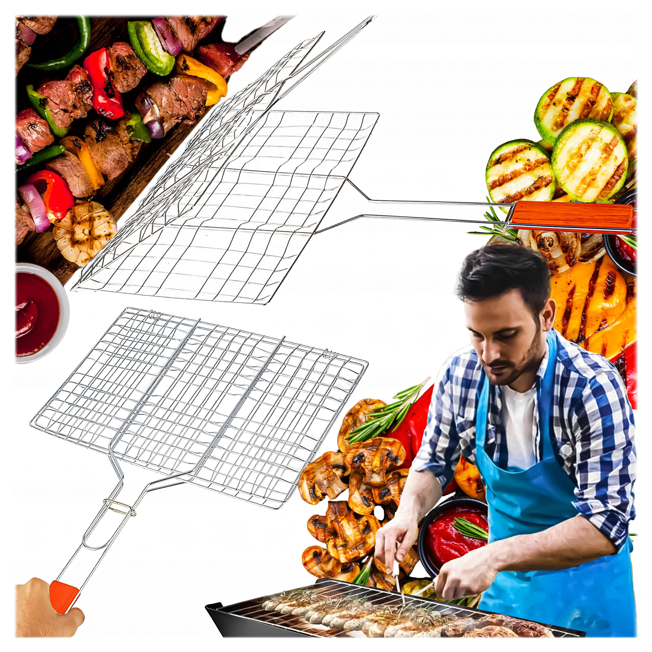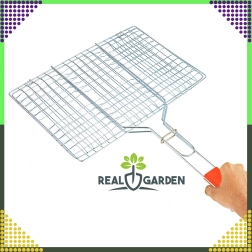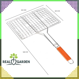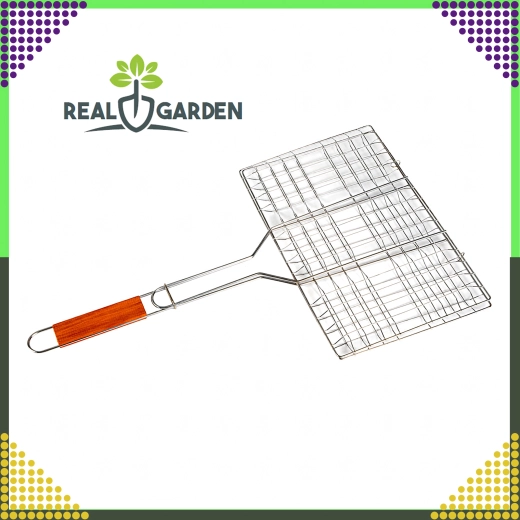 Практична двустранна скара с заключваща решетка и дървена дръжка за безопасно и удобно обръщане. Идеална за бургери, месо, риба и зеленчуци. Хромираното покритие улеснява почистването, а стабилното захващане предотвратява разпадането на храната при печене.