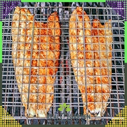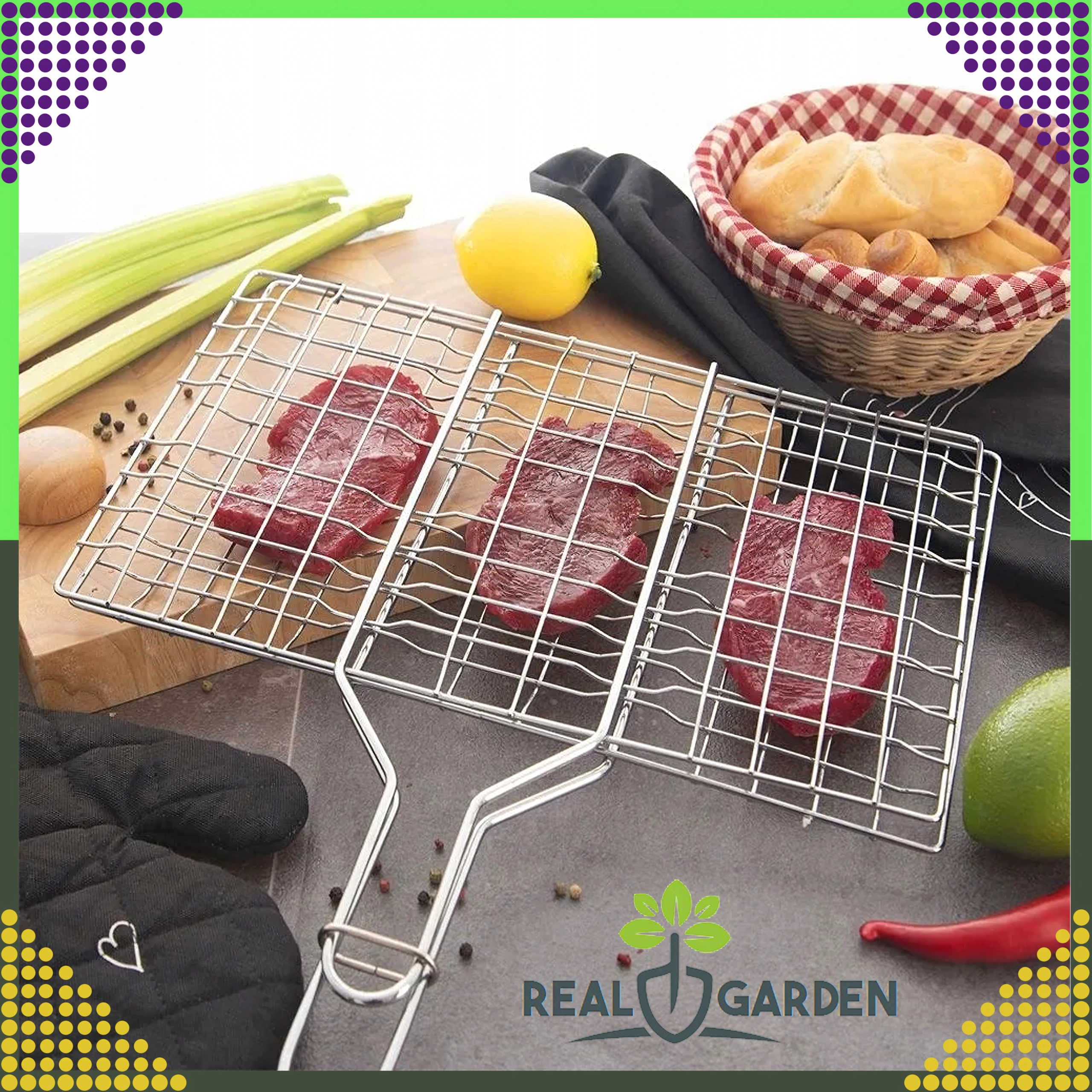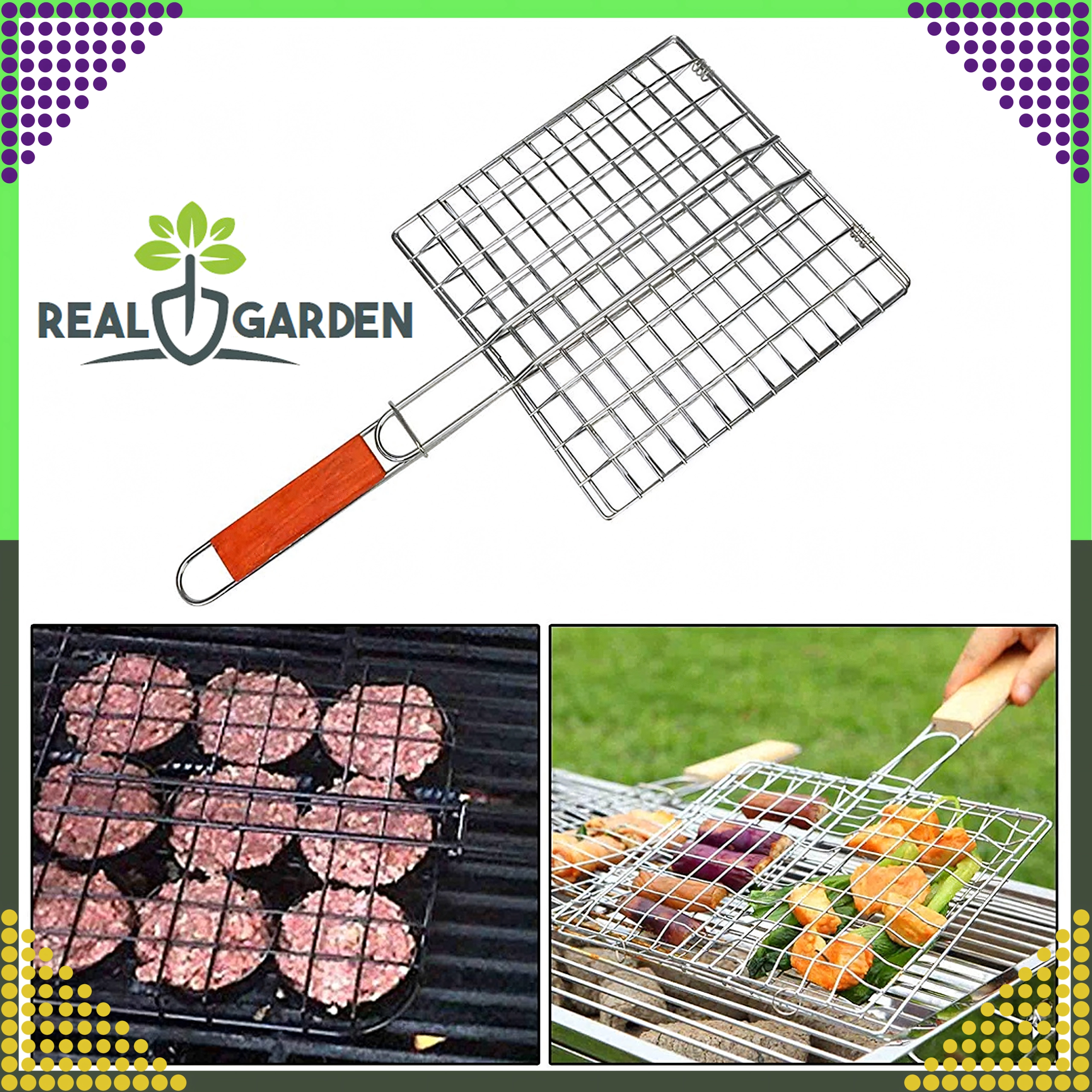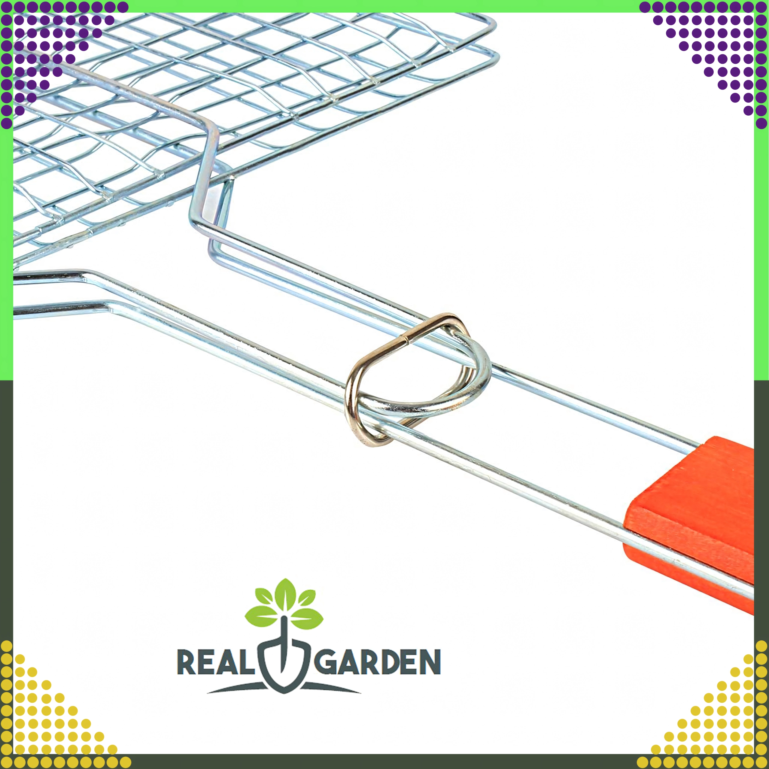 Практична двустранна скара с заключваща решетка и дървена дръжка за безопасно и удобно обръщане. Идеална за бургери, месо, риба и зеленчуци. Хромираното покритие улеснява почистването, а стабилното захващане предотвратява разпадането на храната при печене.