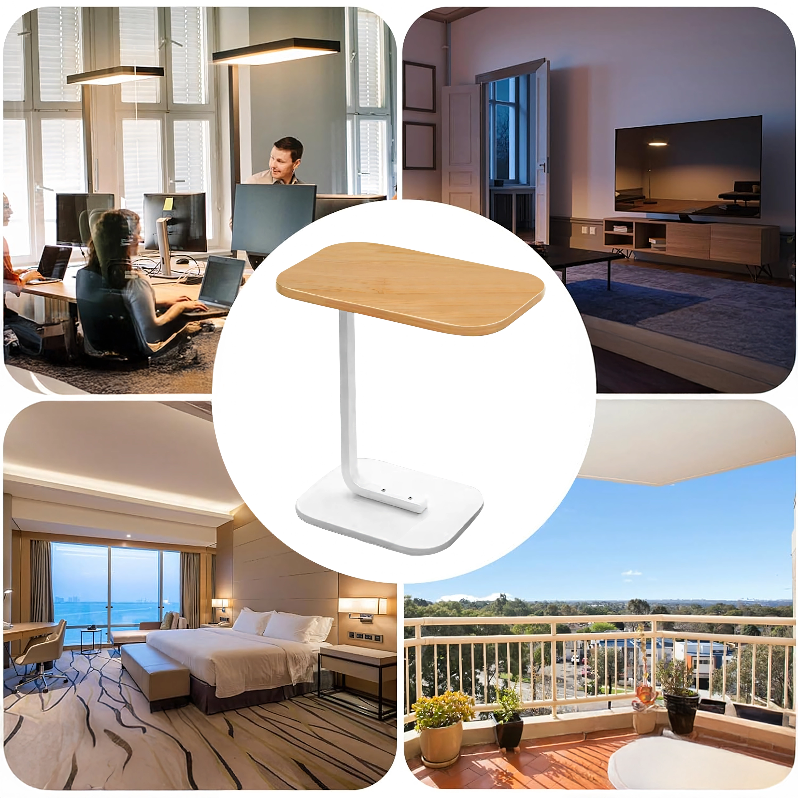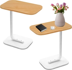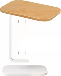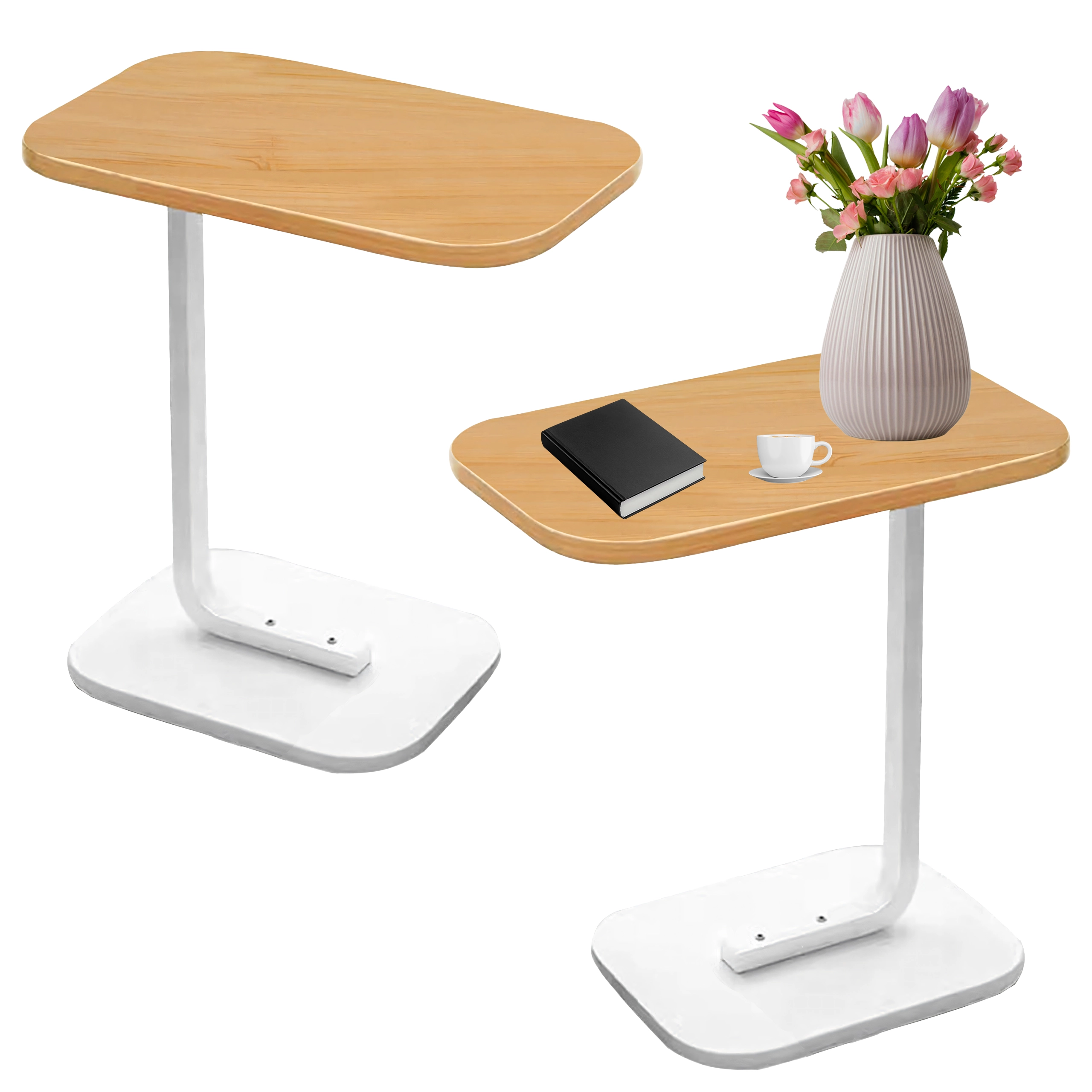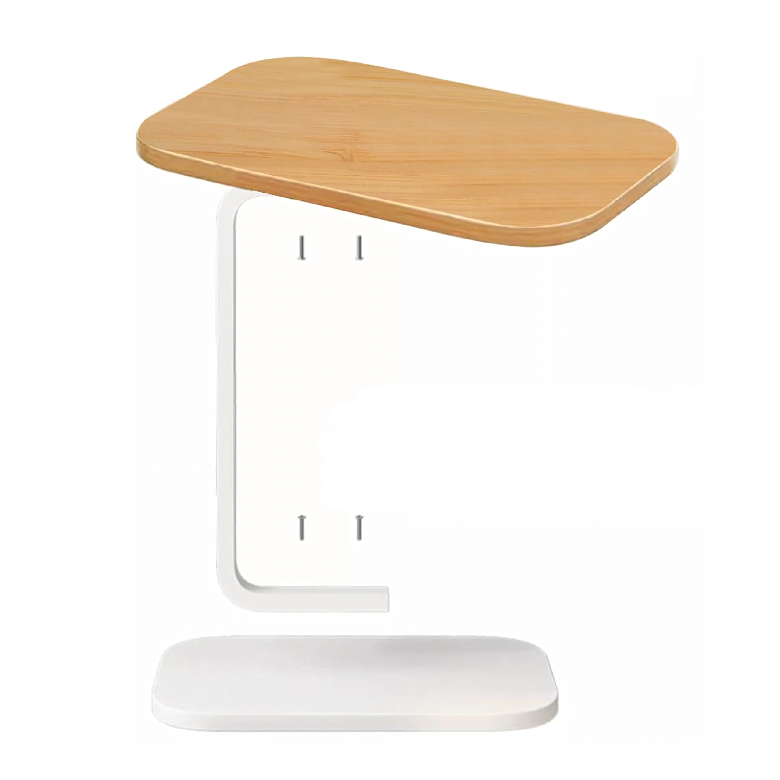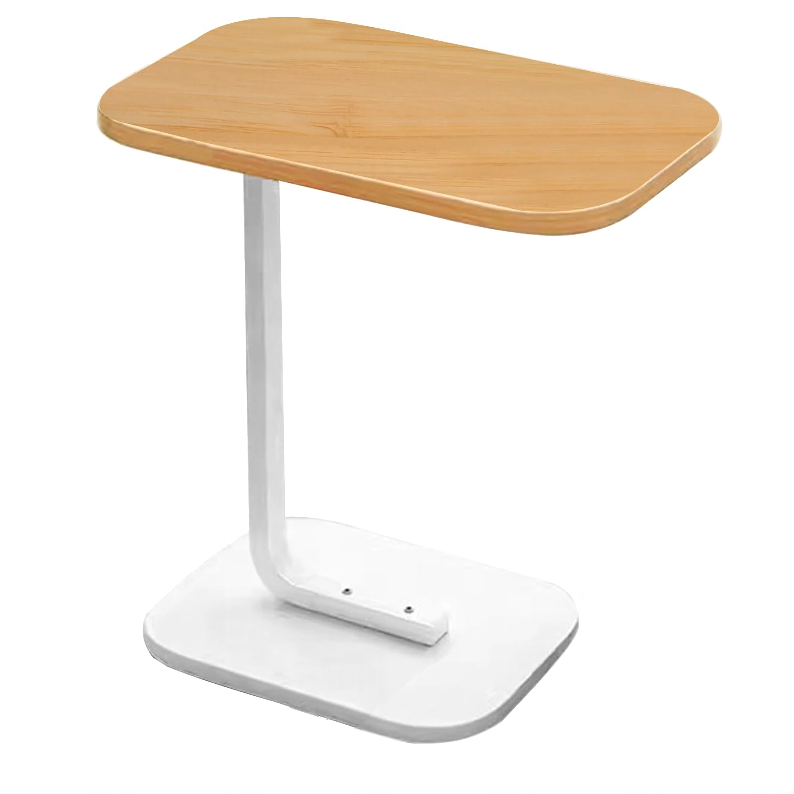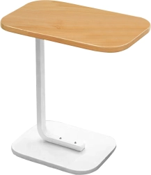 Пестяща място масичка с овален/закръглен плот в декор светло дърво и здрава бяла метална конструкция, която осигурява удобство до дивана или леглото. C‑формата позволява основата да се плъзне под мебел и да приближи плота точно там, където ви е нужен.