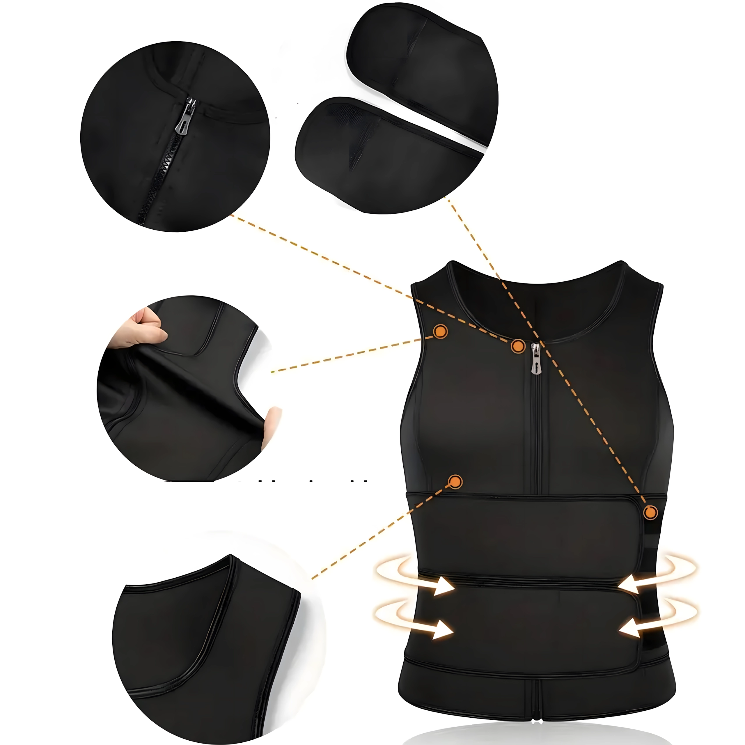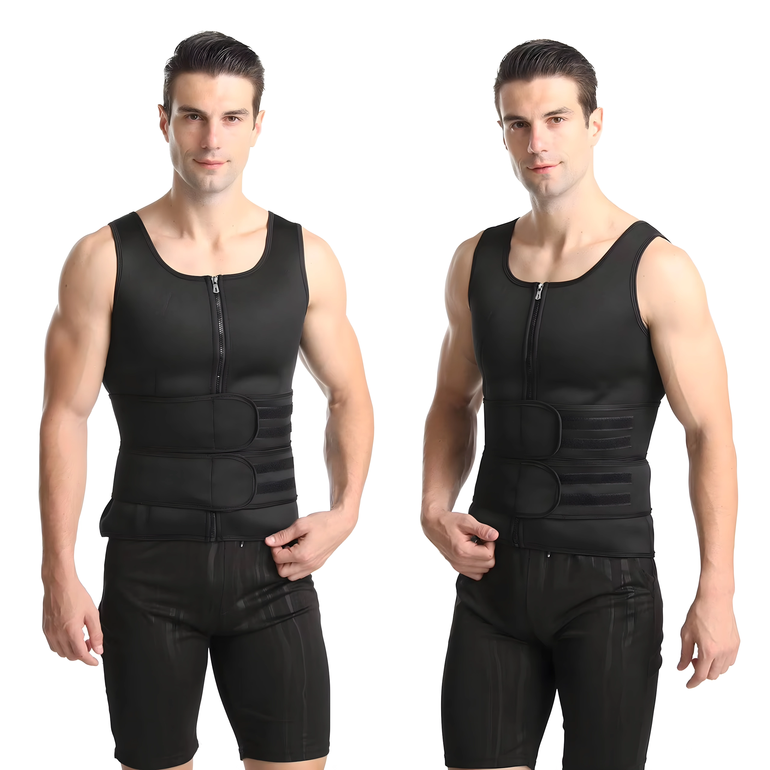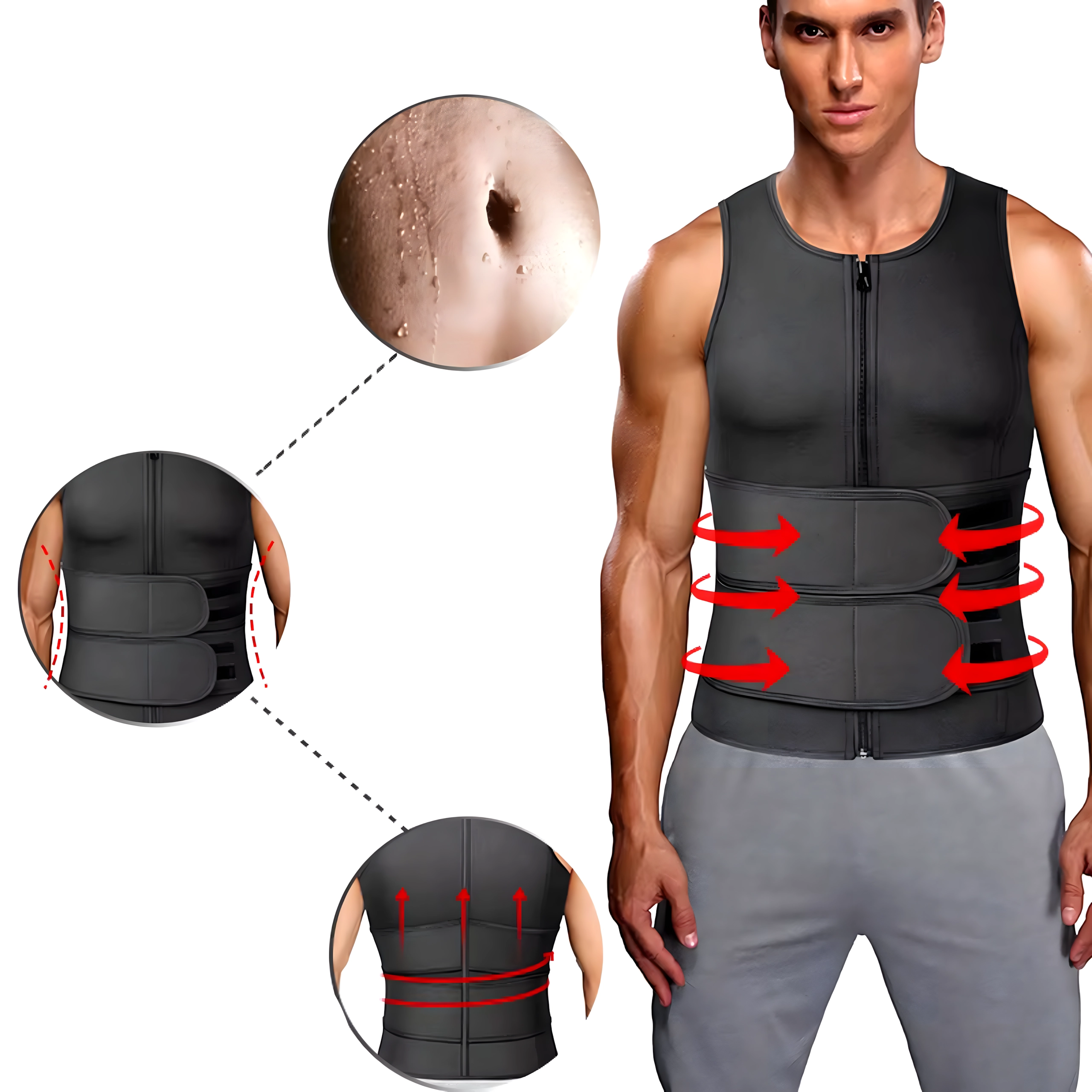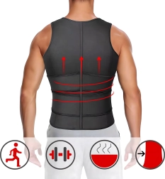 Този мъжки компресионен сауна елек от висококачествен неопрен повишава температурата в областта на торса, като по този начин стимулира изпотяването и по-ефективното изгаряне на калории. Едновременно стабилизира центъра на тялото, подобрява стойката и намалява умората в гърба при силови тренировки, бягане и кардио. Предният цип и широките регулируеми колани позволяват бързо обличане и прецизно пристягане според нуждите.
