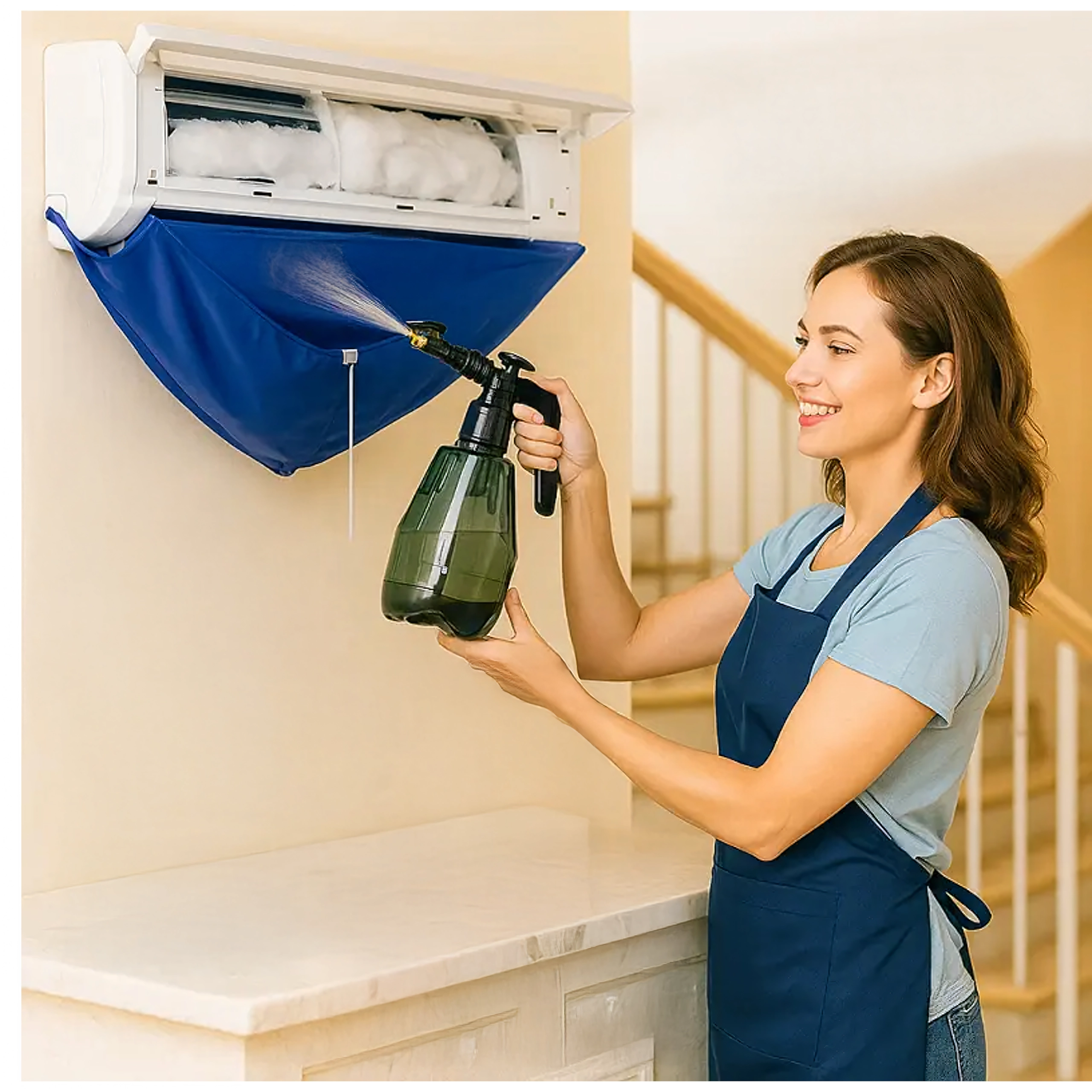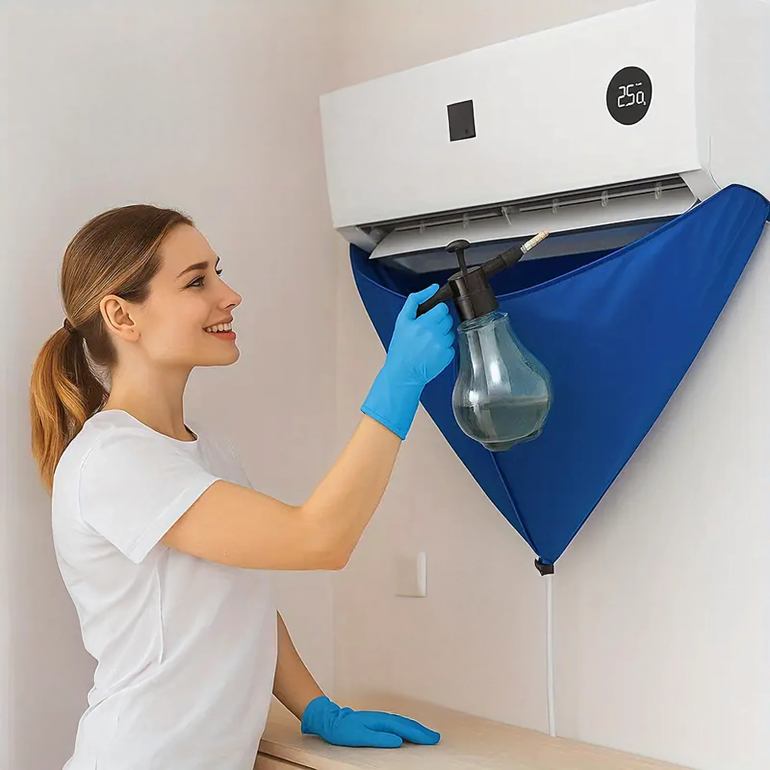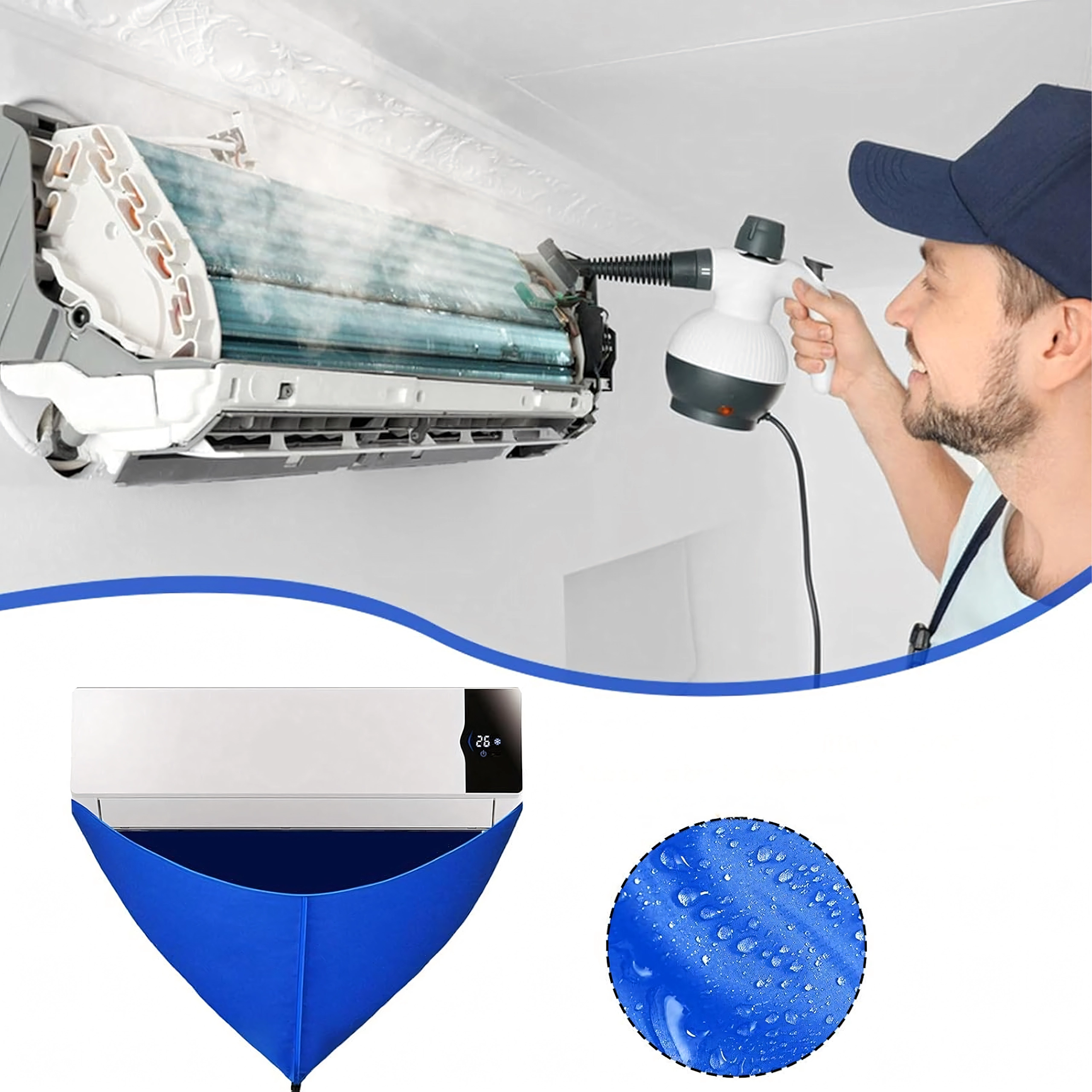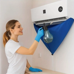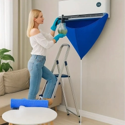Улеснете поддръжката на стенни климатици с водоустойчив предпазен сак, който надеждно улавя мръсната вода, почистващия разтвор и замърсяванията. Интегрираният 2 м отводнителен маркуч безопасно отвежда течността в кофа или канал, а еластичната пристягаща връзка помага да се уплътни пространството около модула за чиста и бърза работа.