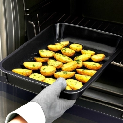 Благодарение на високите ръбове е идеална за сочно месо, запеканки, пайове с плънка и картофи – без риск от изтичане. Универсалният размер пасва отлично на повечето домашни фурни и осигурява надеждна работа за ежедневното печене.