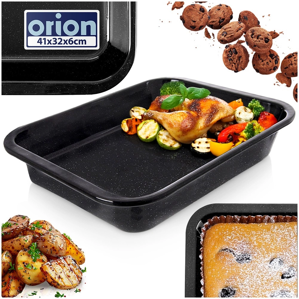 Практична и издръжлива тава за печене от емайлирана стомана с размери 41 × 32 × 6 cm, предлага равномерно печене, лесно почистване и високи ръбове за безопасна подготовка на сладки и солени ястия. Подходяща за газови и електрически фурни и може да се мие в съдомиялна.