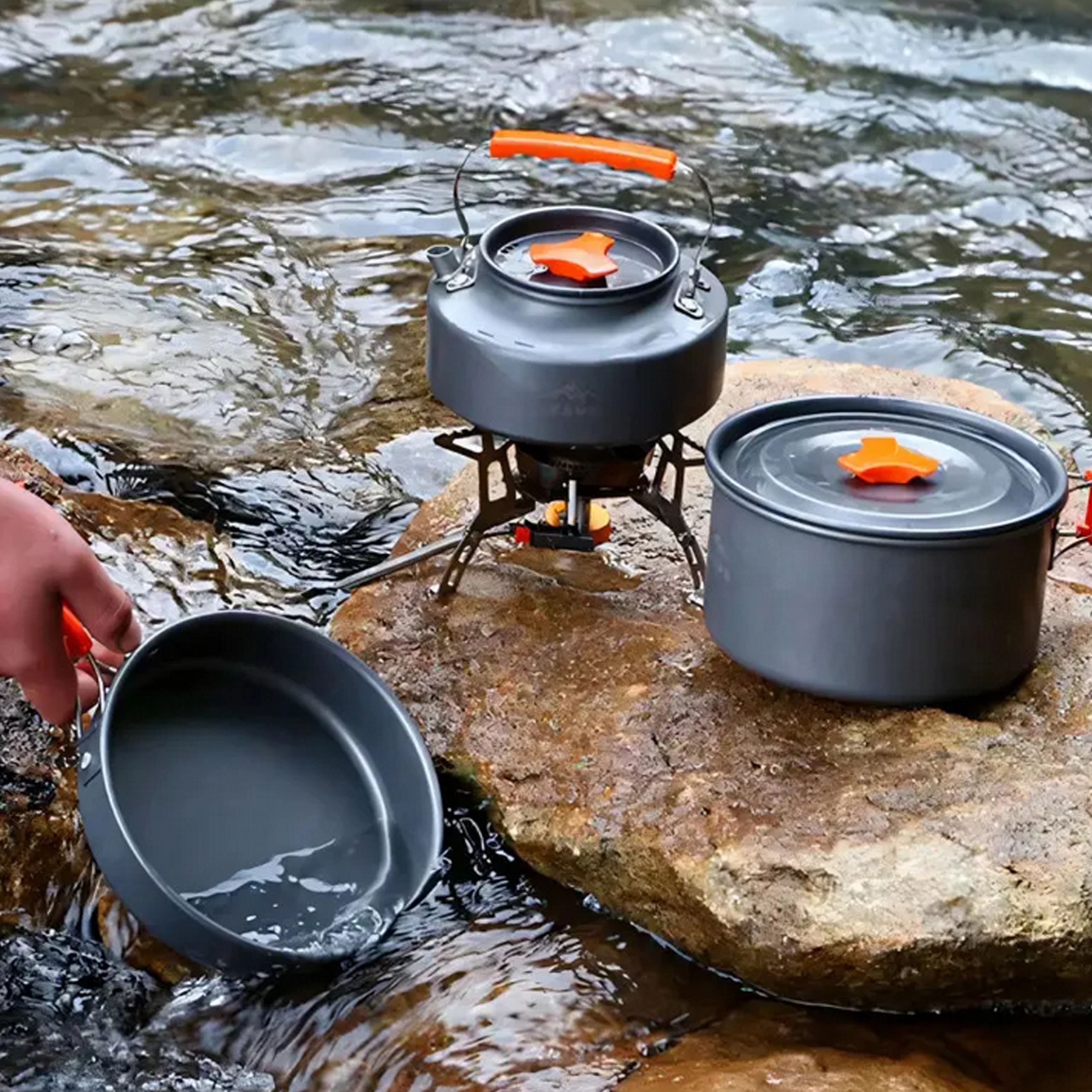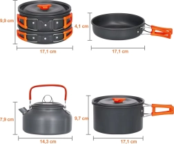 Този универсален комплект къмпинг съдове предлага всичко необходимо за удобно готвене сред природата. Тенджера с капак, тиган и малка кана осигуряват надеждна основа за готвене, пържене и затопляне на вода. Благодарение на сгъваемите термоустойчиви дръжки и умната система за подреждане една в друга (nesting) целият комплект лесно се побира в раницата.
