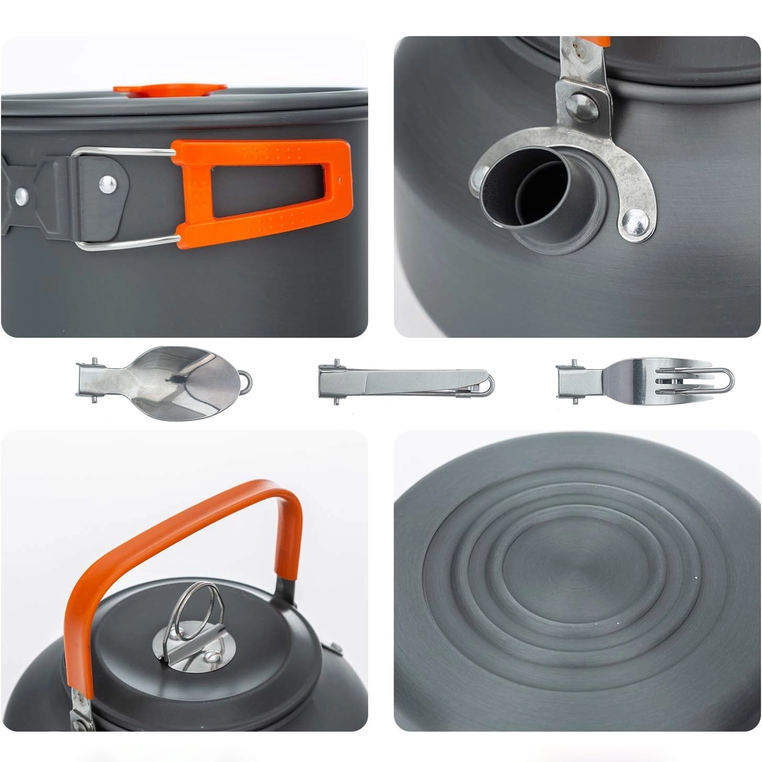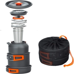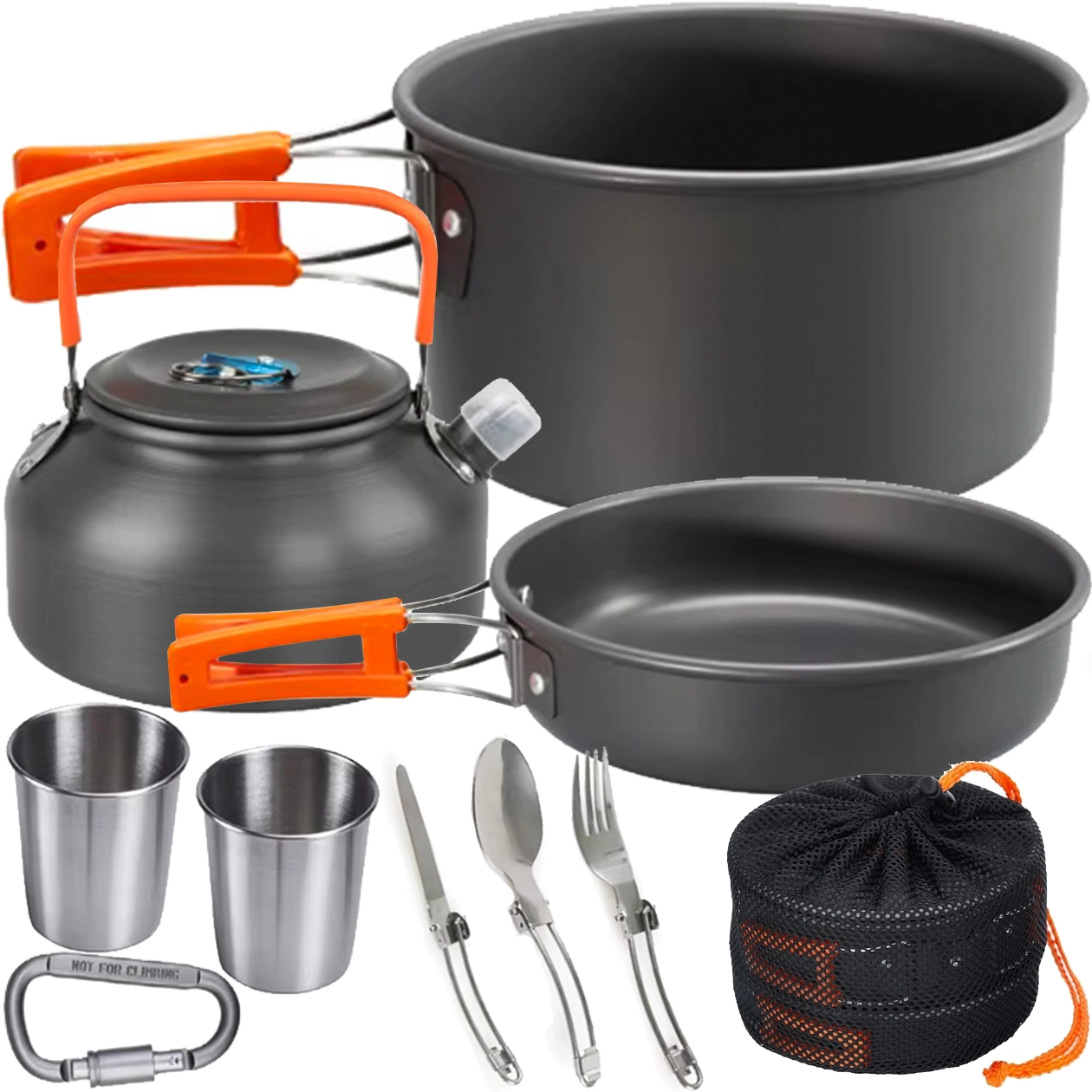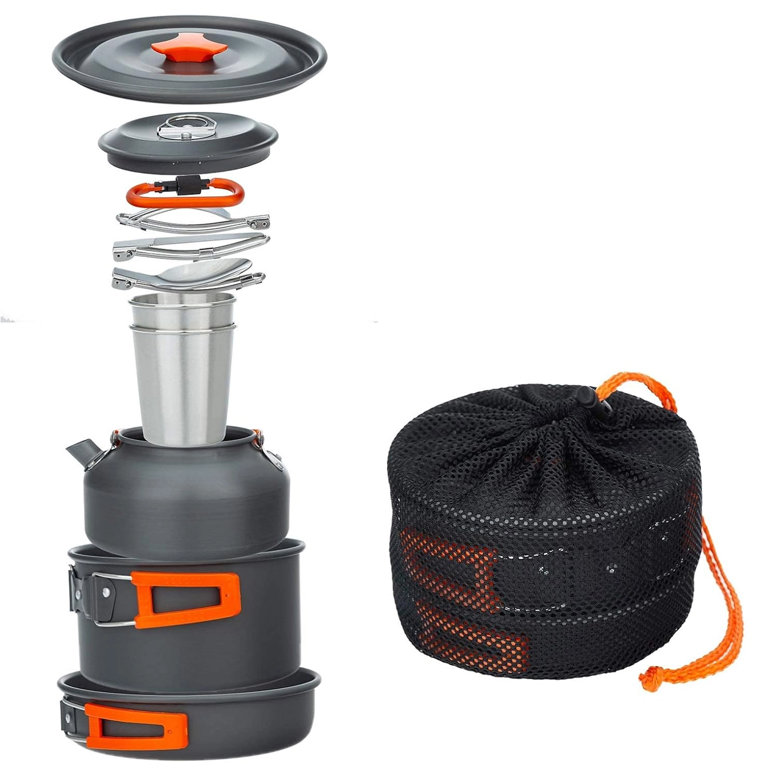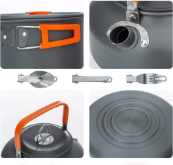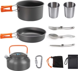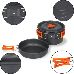 Практичен и лек комплект къмпинг съдове за 2 души с тенджера, тиган, кана и аксесоари. Благодарение на сгъваемите дръжки, компактното подреждане една в друга и здравата неръждаема/метална конструкция е идеален за къмпинг, туризъм и пътуване. Включени са също чашки и мрежест калъф за лесно пренасяне.