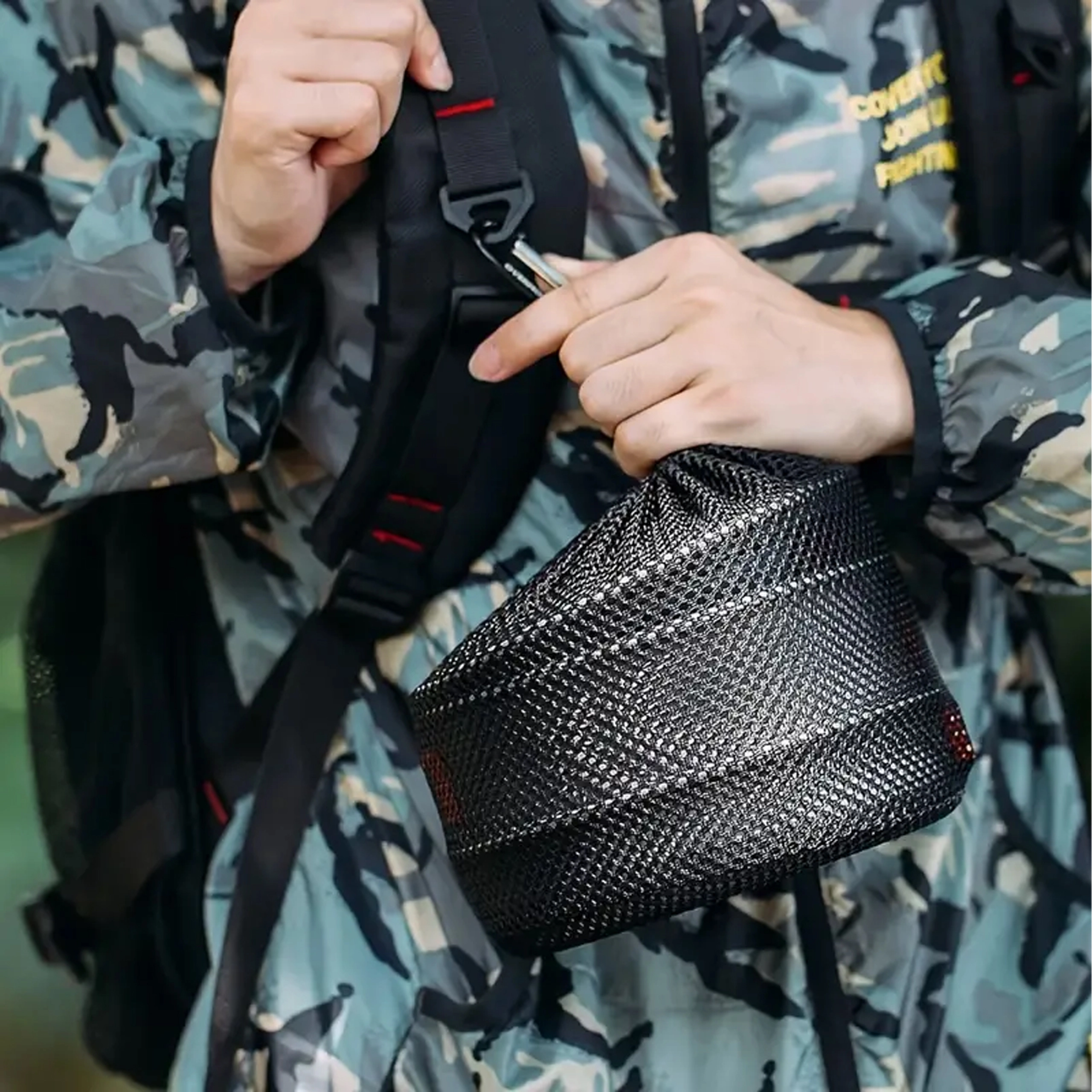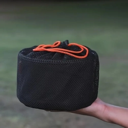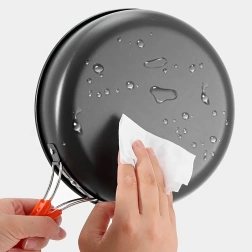Лекото метално тяло с незалепващо покритие (PTFE) улеснява готвенето и почистването, докато мрежестият калъф държи всичко компактно и съхне бързо. Комплектът е проектиран за 2 души и благодарение на универсалните си размери може да се използва на газов котлон и над огън (според условията и указанията за употреба).