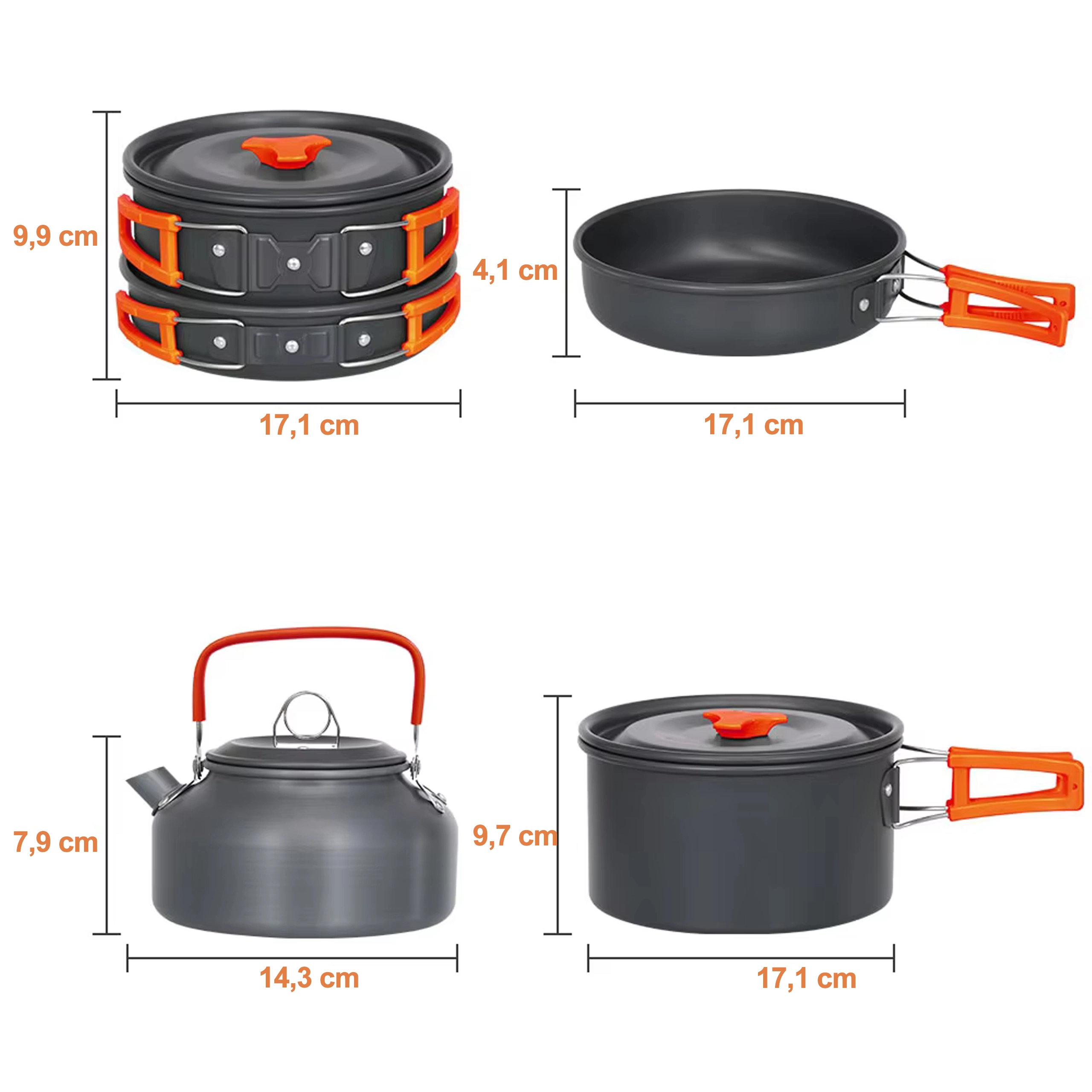 Тенджера с капак, тиган и кана се подреждат лесно една в друга. Идеален размер и тегло за туризъм и къмпинг за двама.