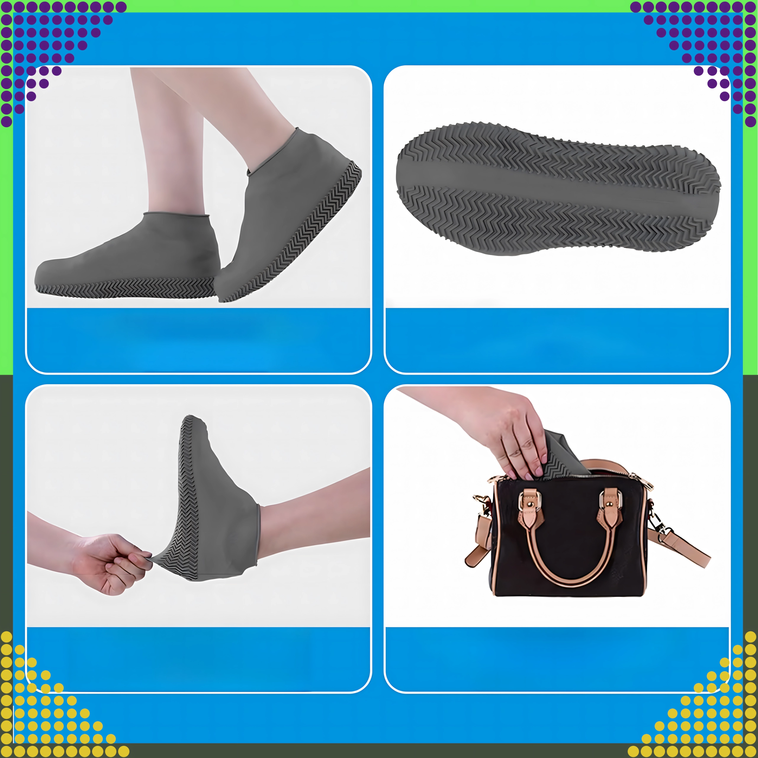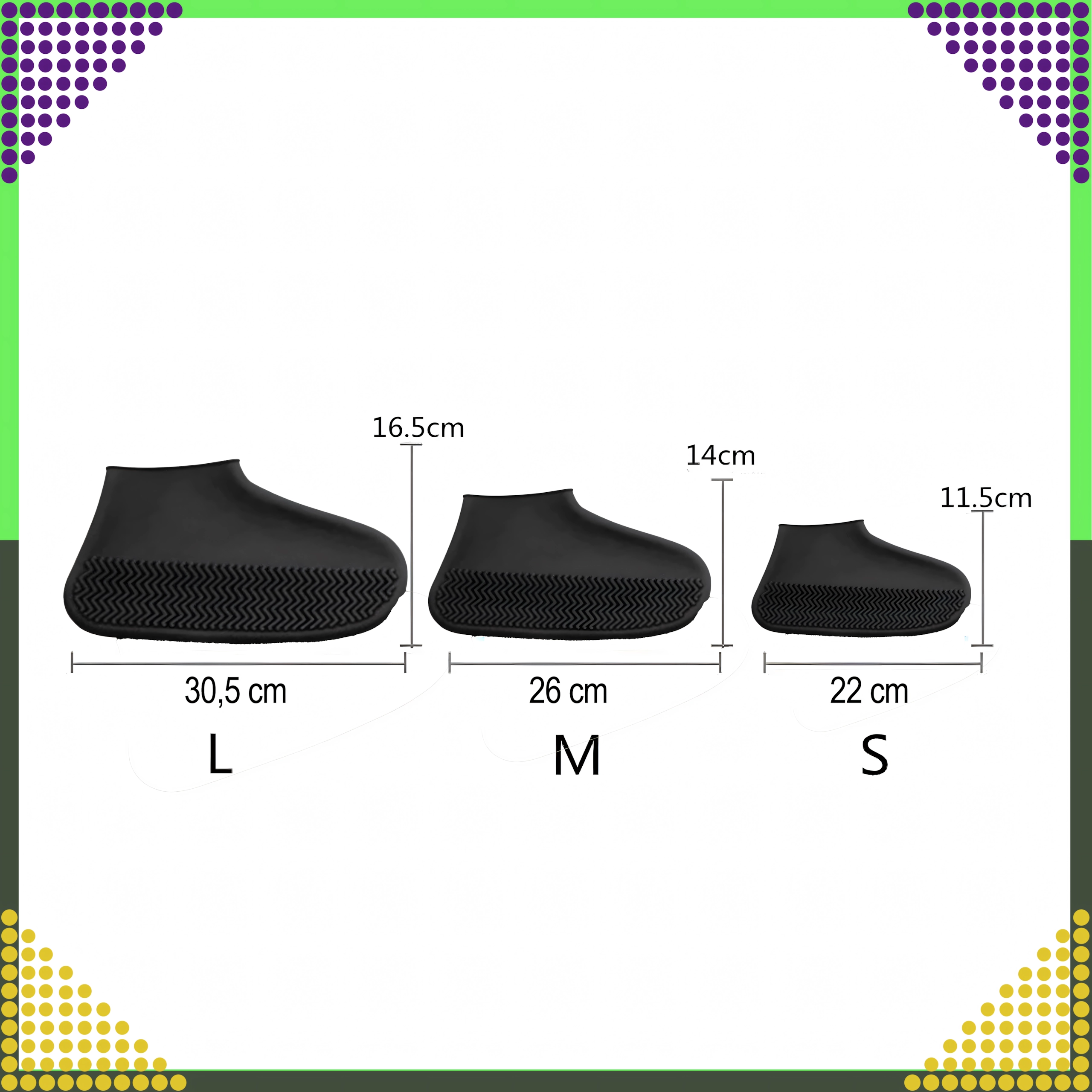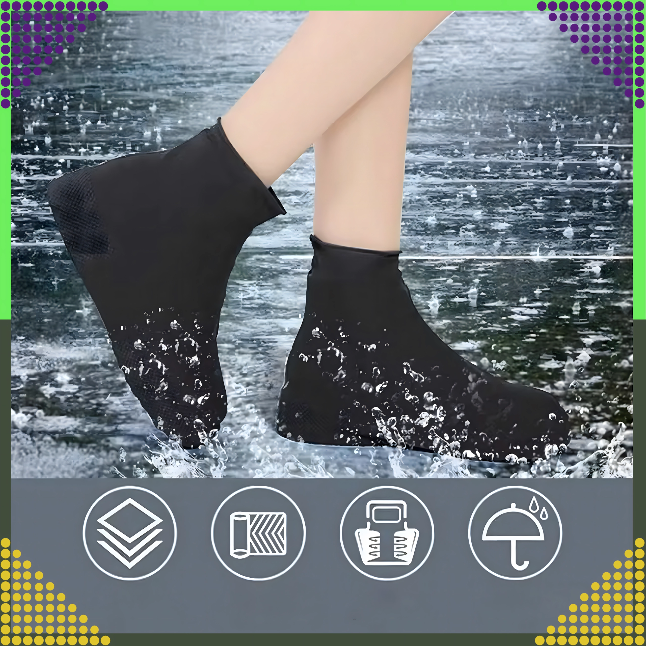 Практични силиконови калъфи за обувки, които ще поддържат обувките ви сухи и чисти дори в дъжд, сняг и кал. Изработени са от качествен еластичен и водоустойчив материал и имат противоплъзгаща подметка за безопасно ходене. Леки, многократно използваеми и лесни за поставяне и почистване.