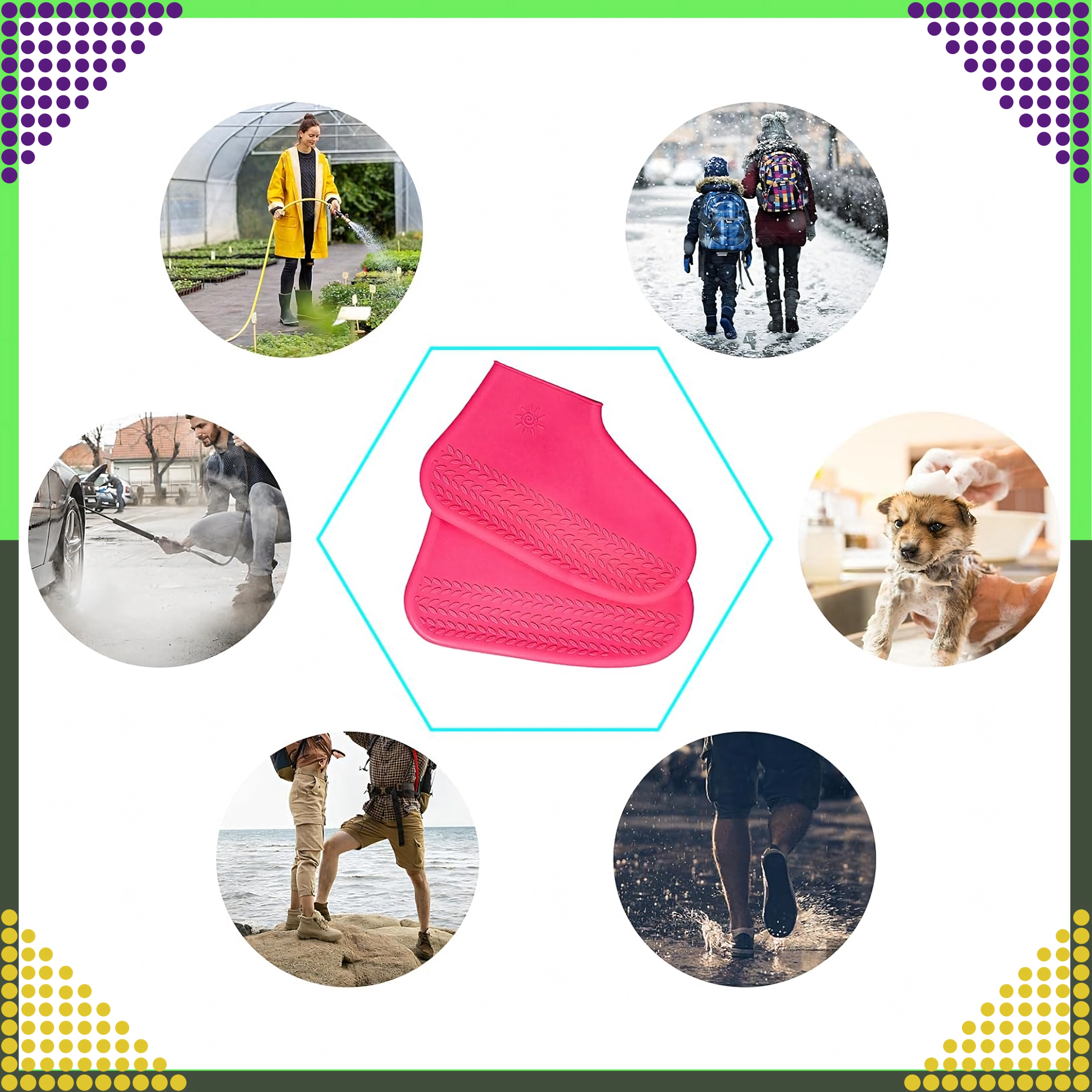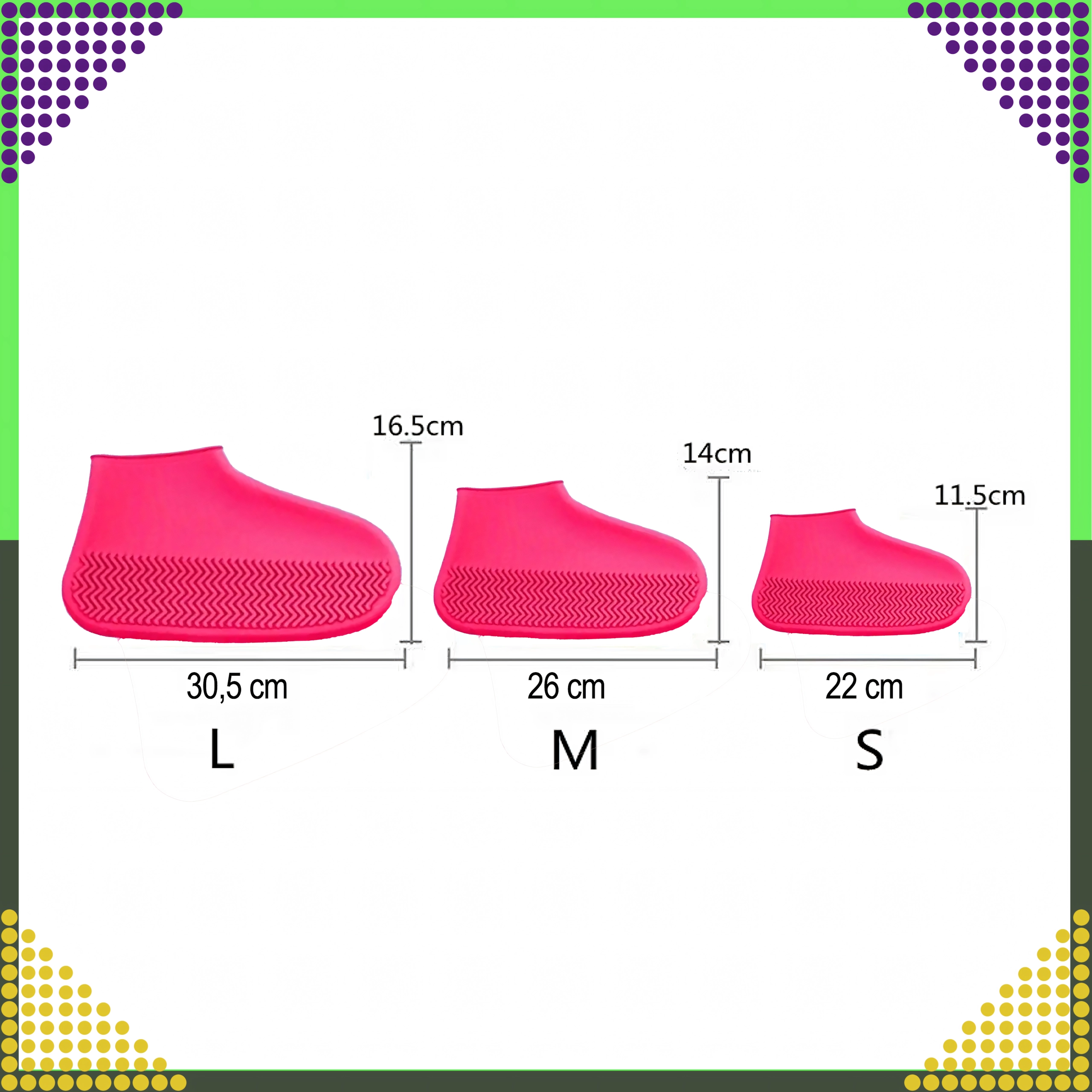 Водоустойчивите силиконови калъфи за обувки са умно решение за дъждовни дни, локви и киша. Здравият и в същото време еластичен материал приляга идеално към повечето видове обувки и осигурява надеждна защита от вода и замърсявания. Противоплъзгащата структура на подметката повишава стабилността и комфорта при ходене по мокра повърхност.