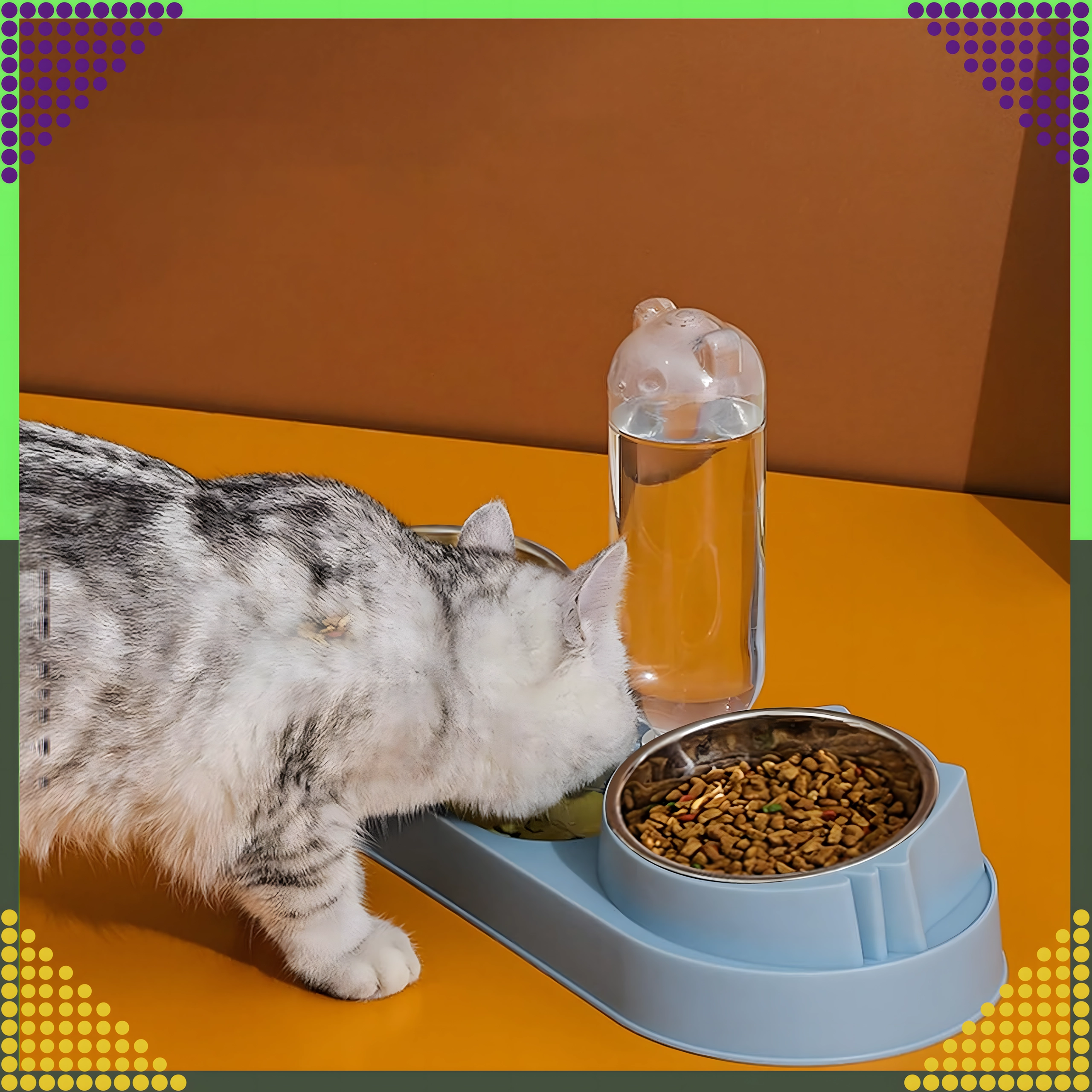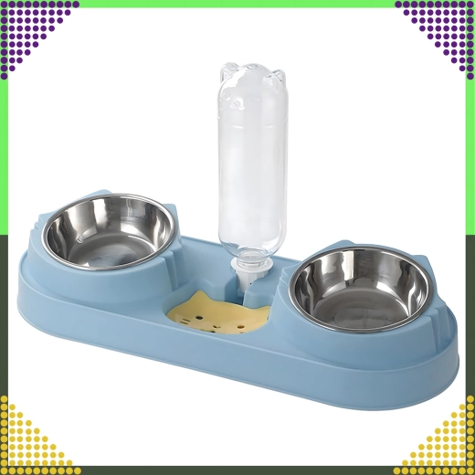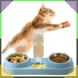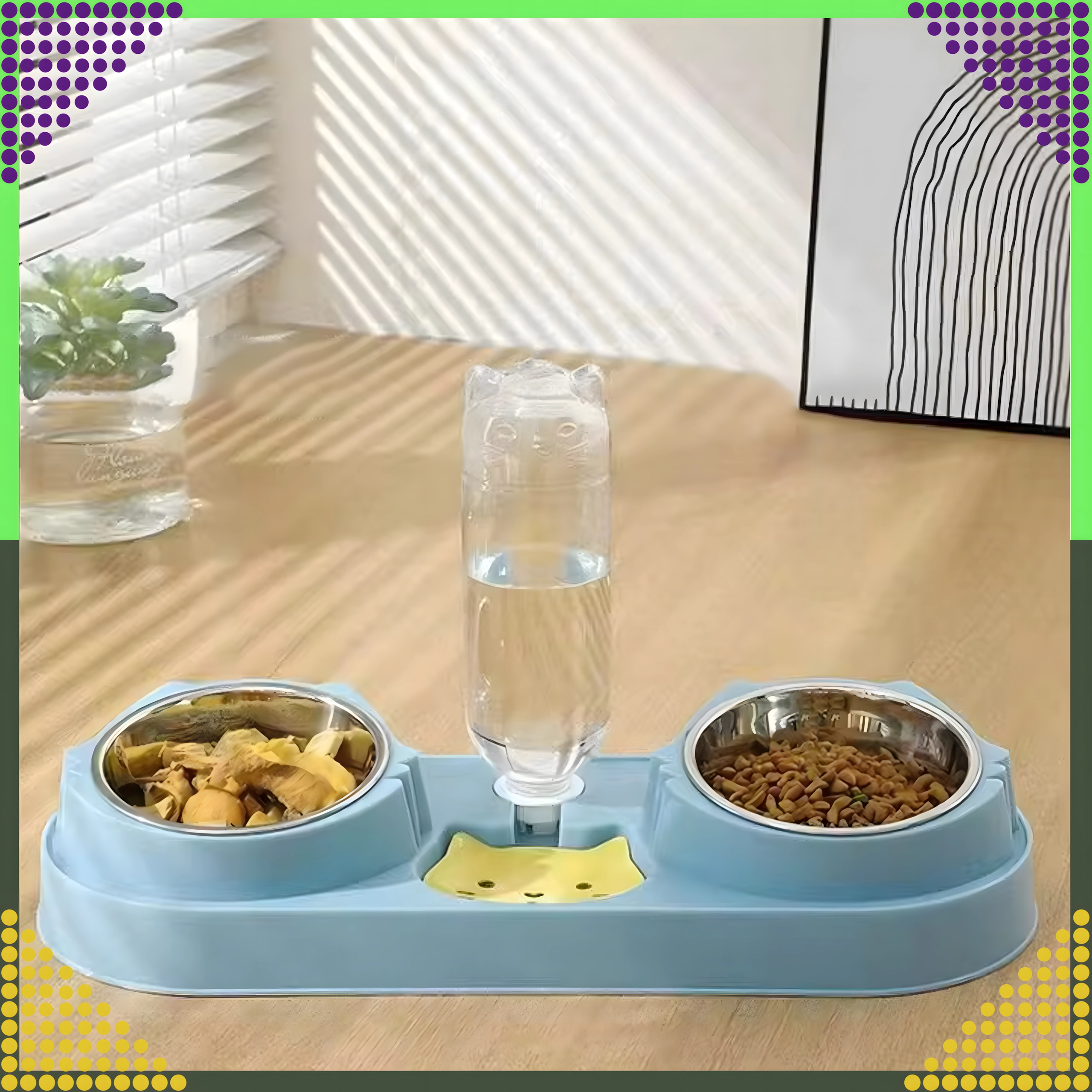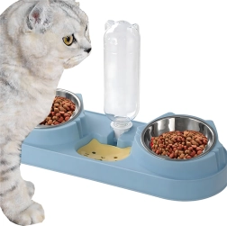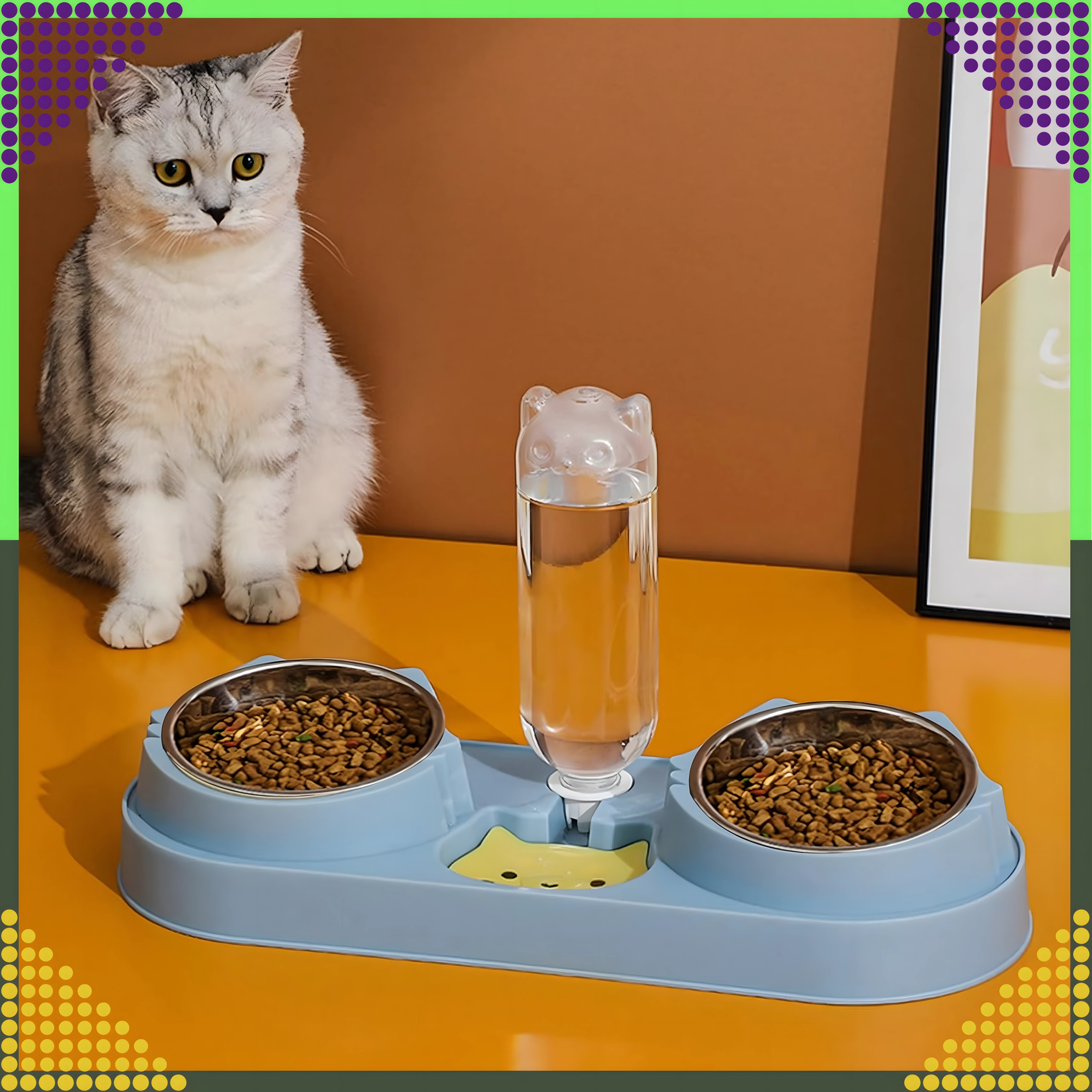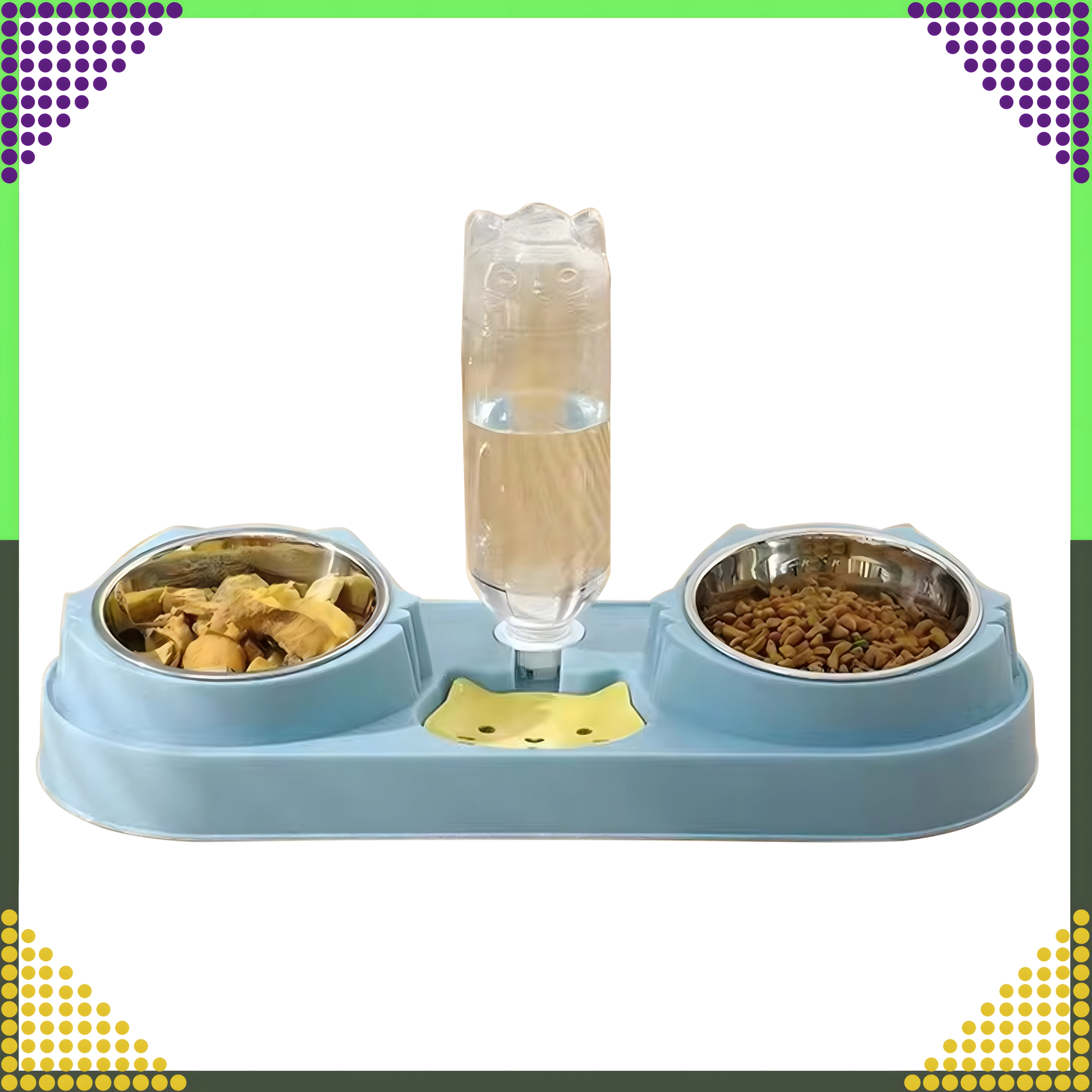 Практична двойна купа за домашни любимци с интегриран дозатор за вода осигурява едновременно подаване на храна и прясна вода. Подвижните купи от неръждаема стомана улесняват бързото почистване, стабилната основа предотвратява преобръщане, а гравитационното поило поддържа водата чиста и достъпна дори по време на вашето отсъствие.
