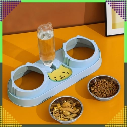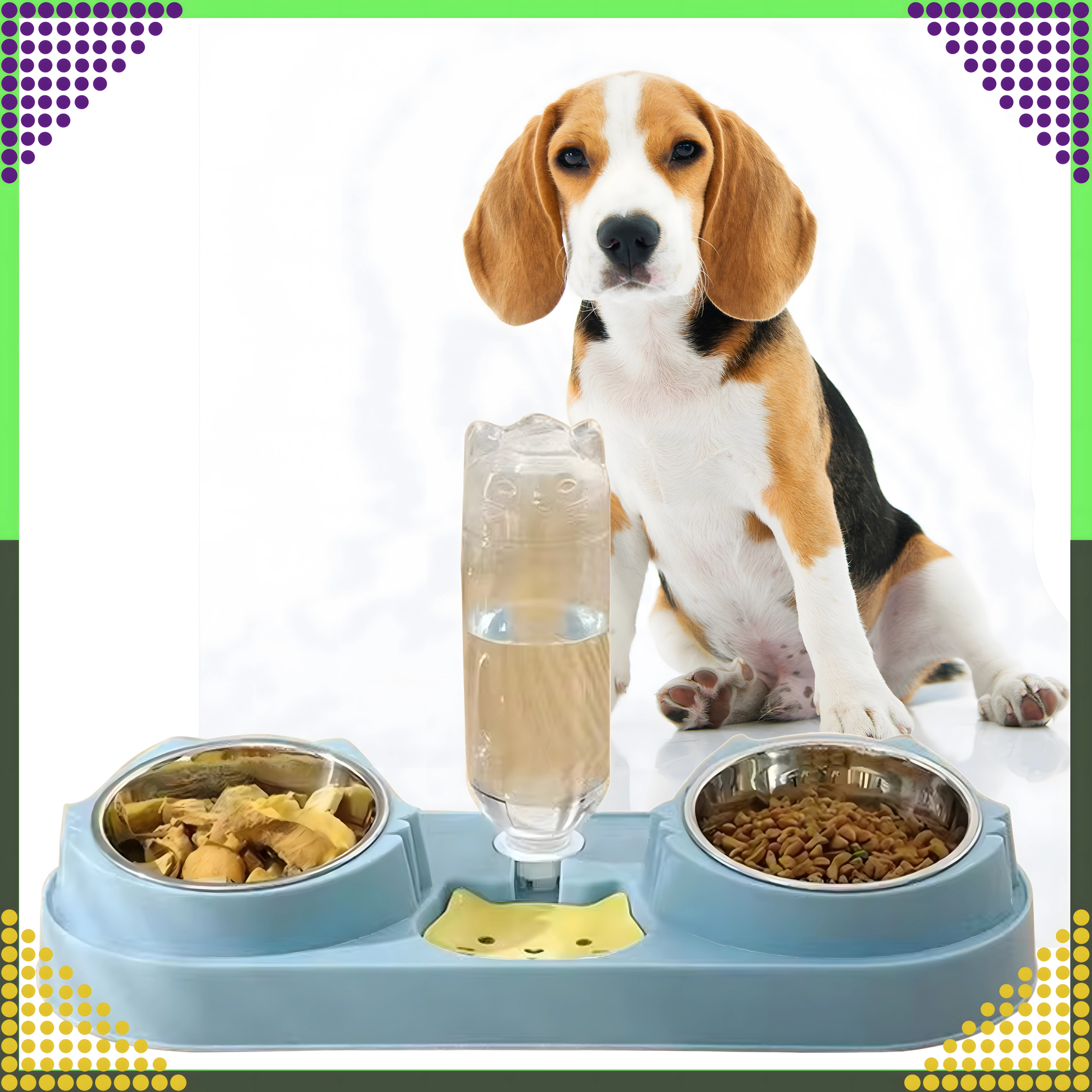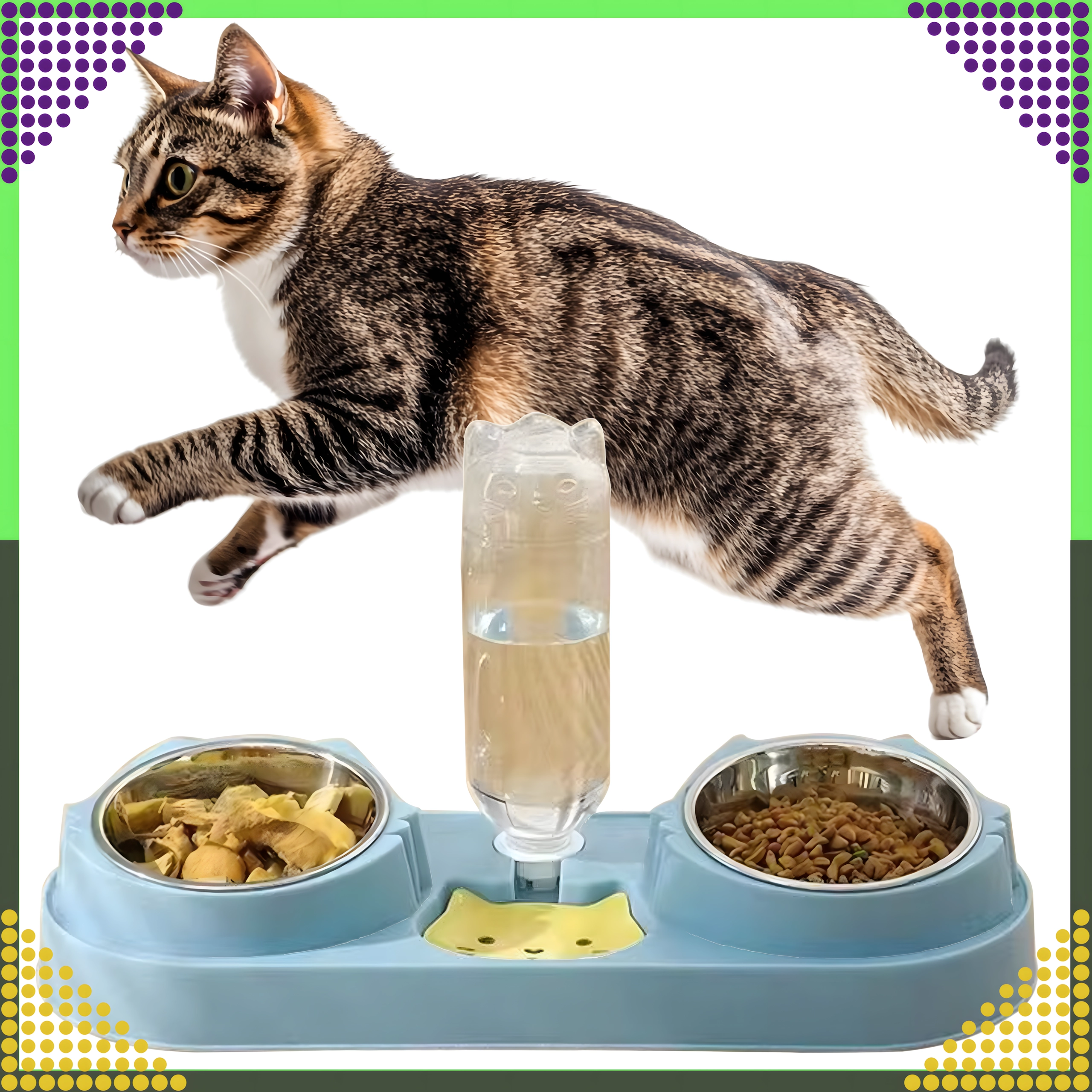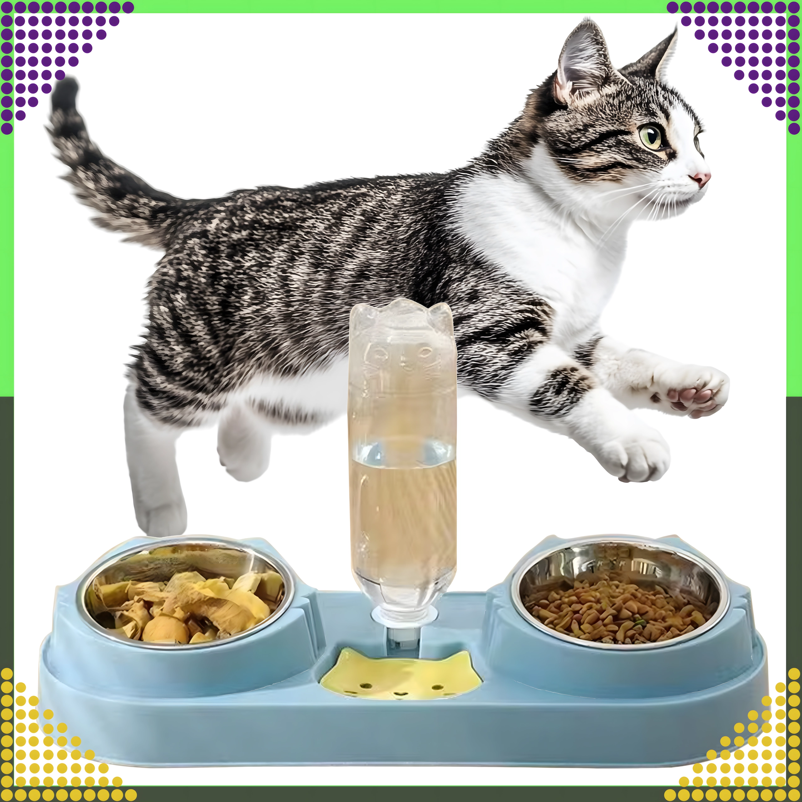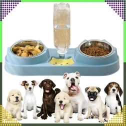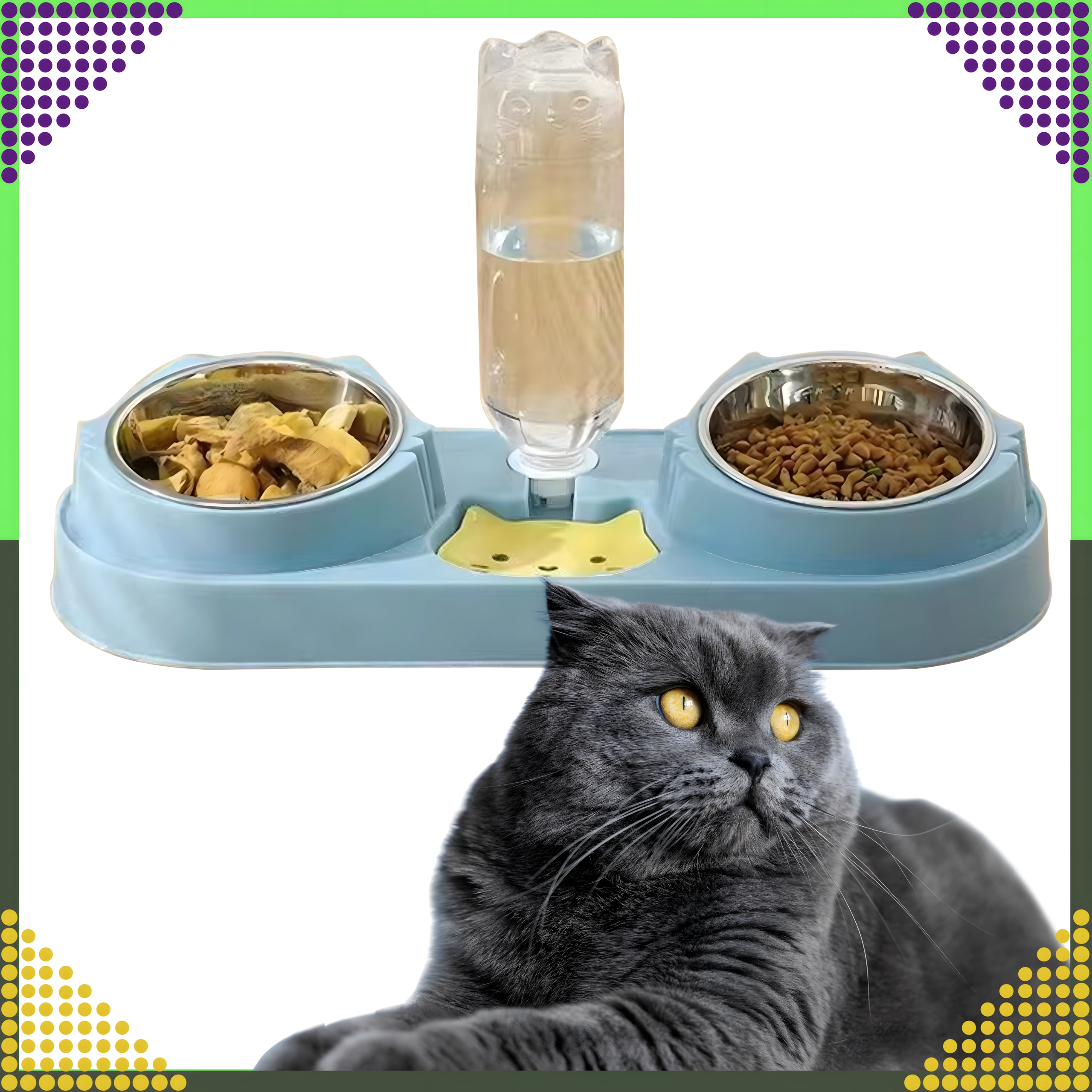 Практична двойна купа за домашни любимци с интегриран дозатор за вода осигурява едновременно подаване на храна и прясна вода. Подвижните купи от неръждаема стомана улесняват бързото почистване, стабилната основа предотвратява преобръщане, а гравитационното поило поддържа водата чиста и достъпна дори по време на вашето отсъствие.