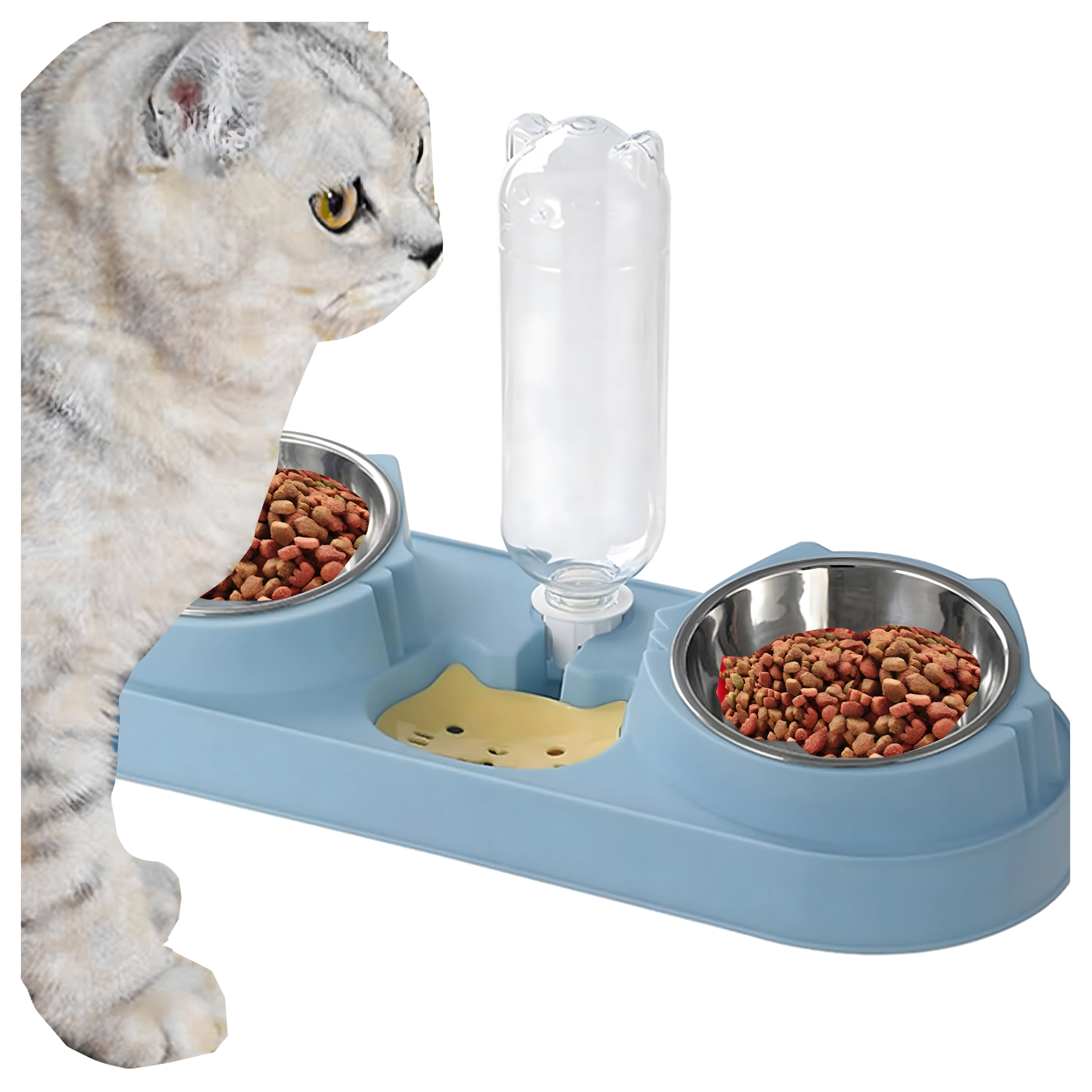 Тази двойна купа с автоматично поило е идеална за кучета и котки. Двете подвижни купи от неръждаема стомана (всяка с обем 220 ml) позволяват отделно сервиране на мокра и суха храна, а гравитационният дозатор непрекъснато допълва резервоара за вода. Здравата пластмасова основа в елегантен син цвят е стабилна и лесна за поддръжка.