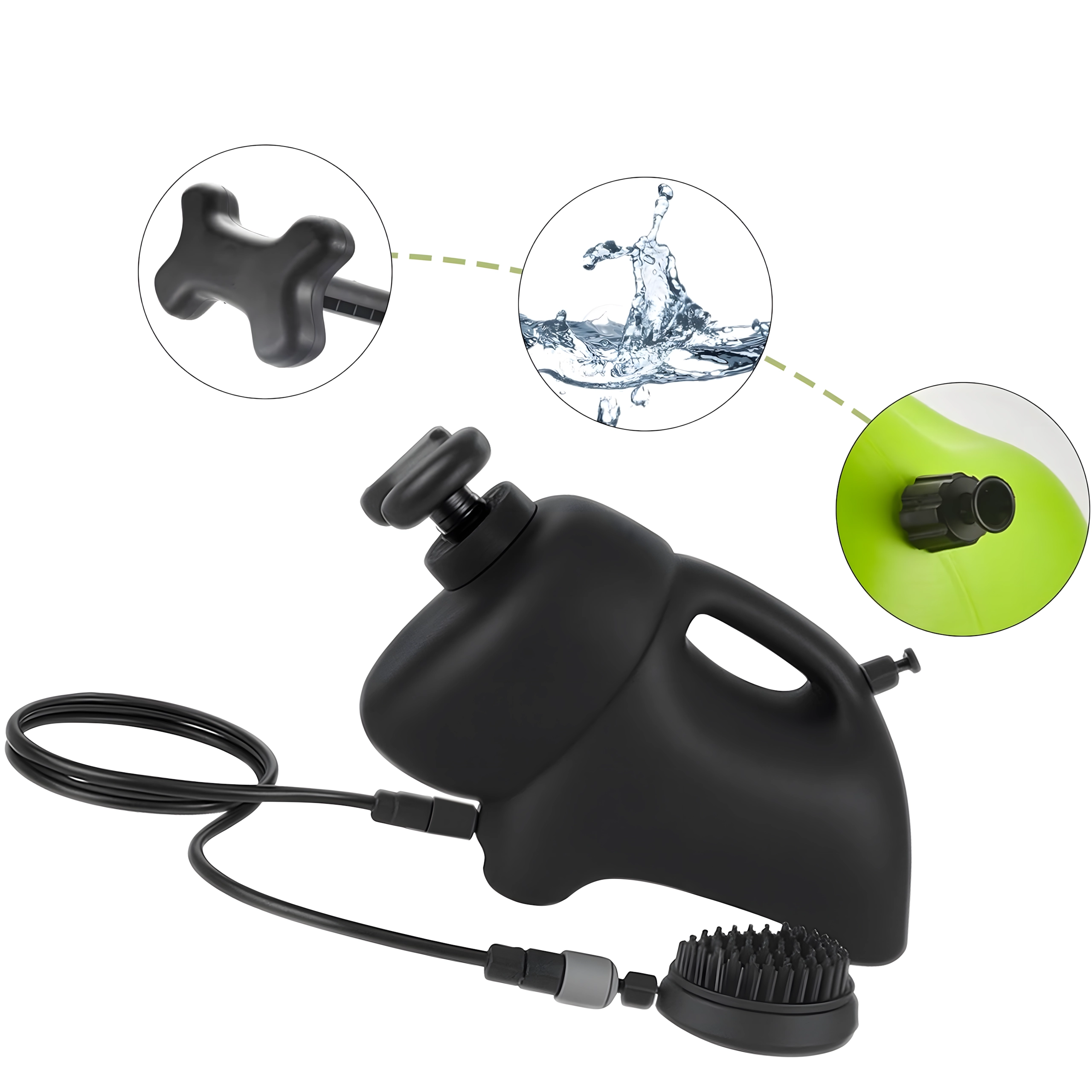 Лека конструкция с дръжка, дълъг маркуч и лесно управление на водния поток. Идеална за градината, пътуване и бързо измиване на лапи след разходка.