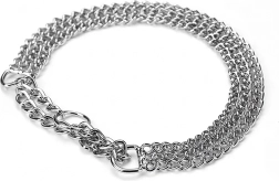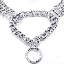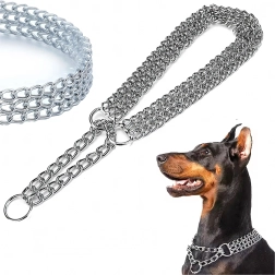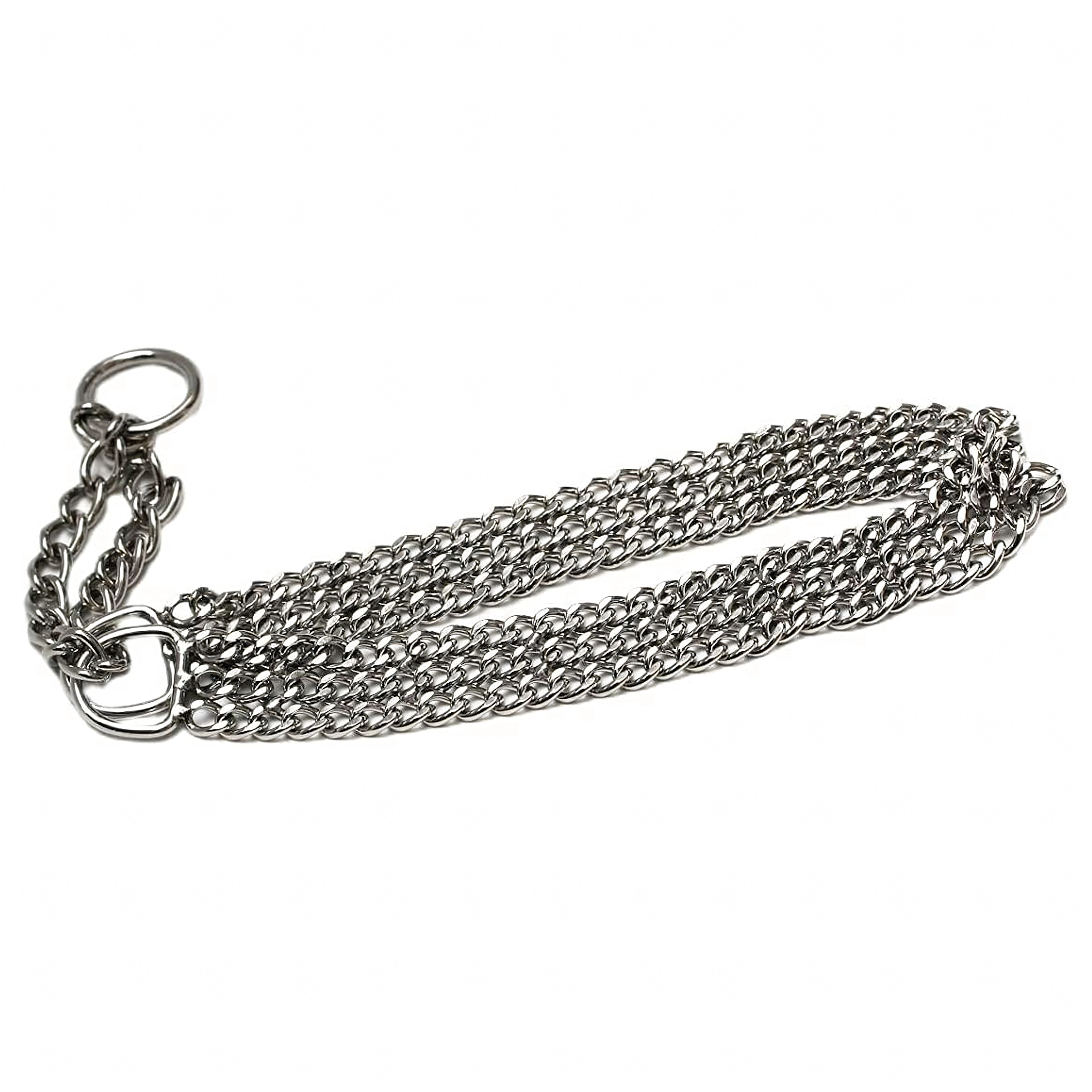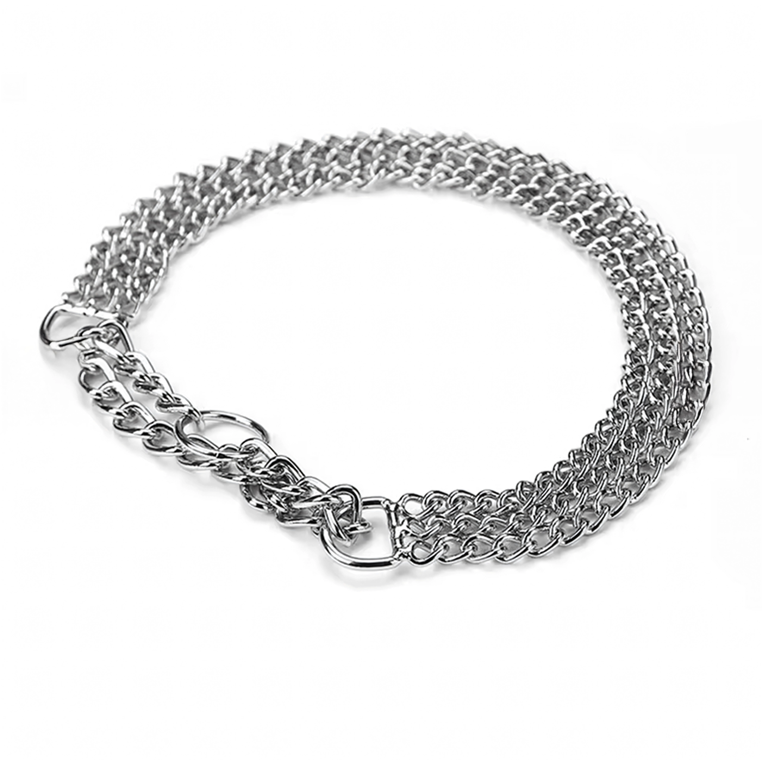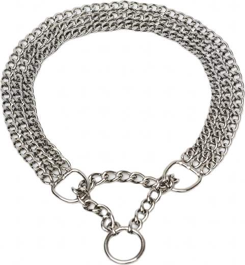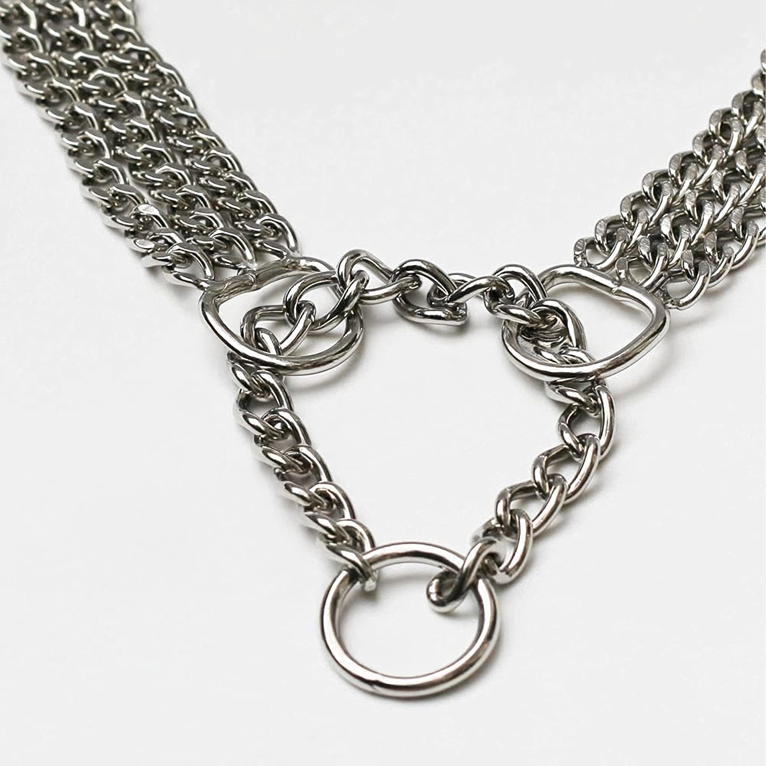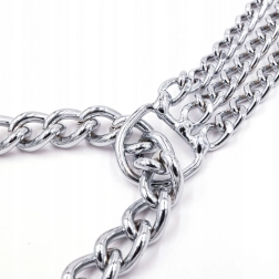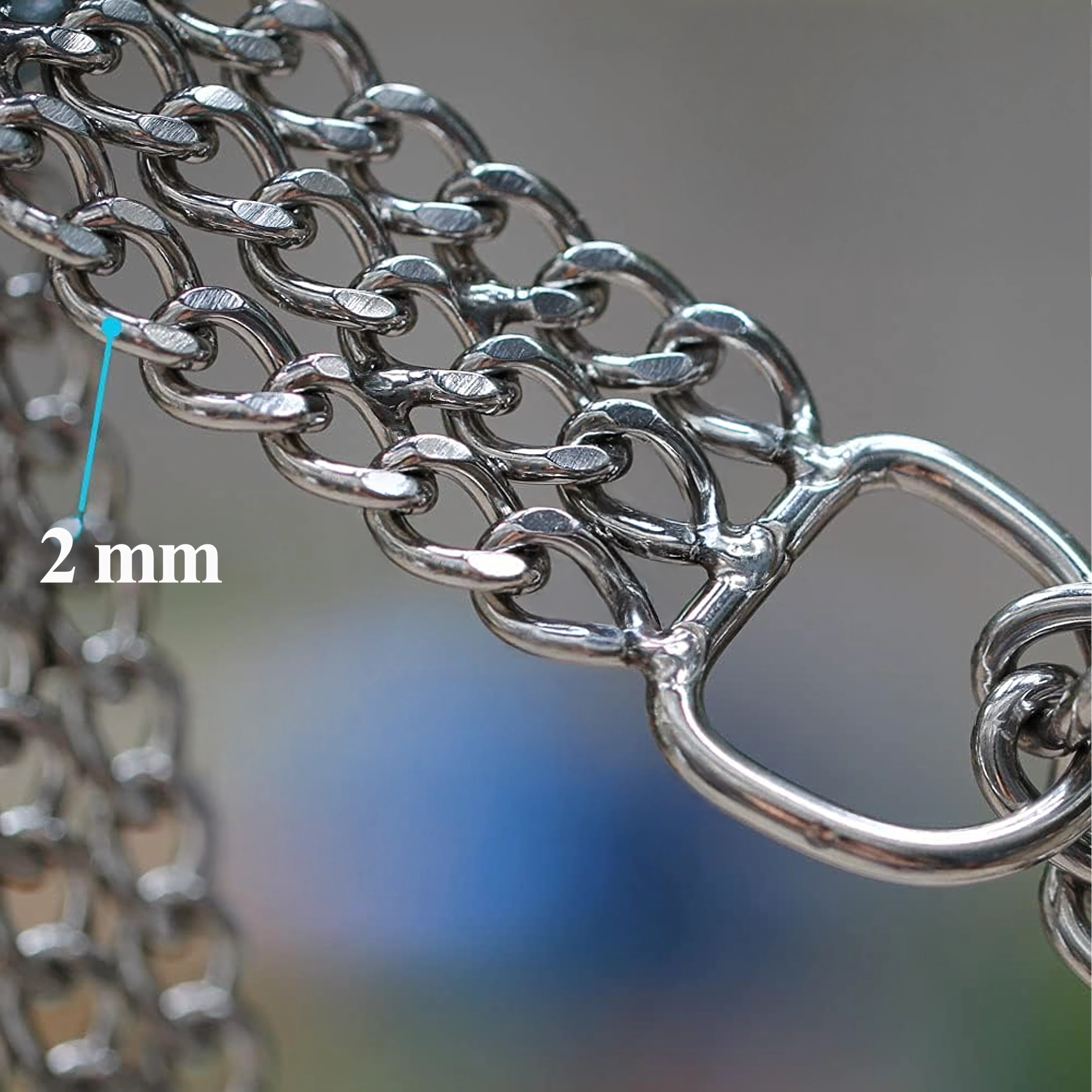 Този стягащ верижен нашийник е изработен от висококачествена хромирана стомана, която се отличава с висока здравина, устойчивост на корозия и гладка повърхност за комфорт на кучето. Тройната верига равномерно разпределя натиска и осигурява прецизен и чувствителен контрол по време на тренировка.