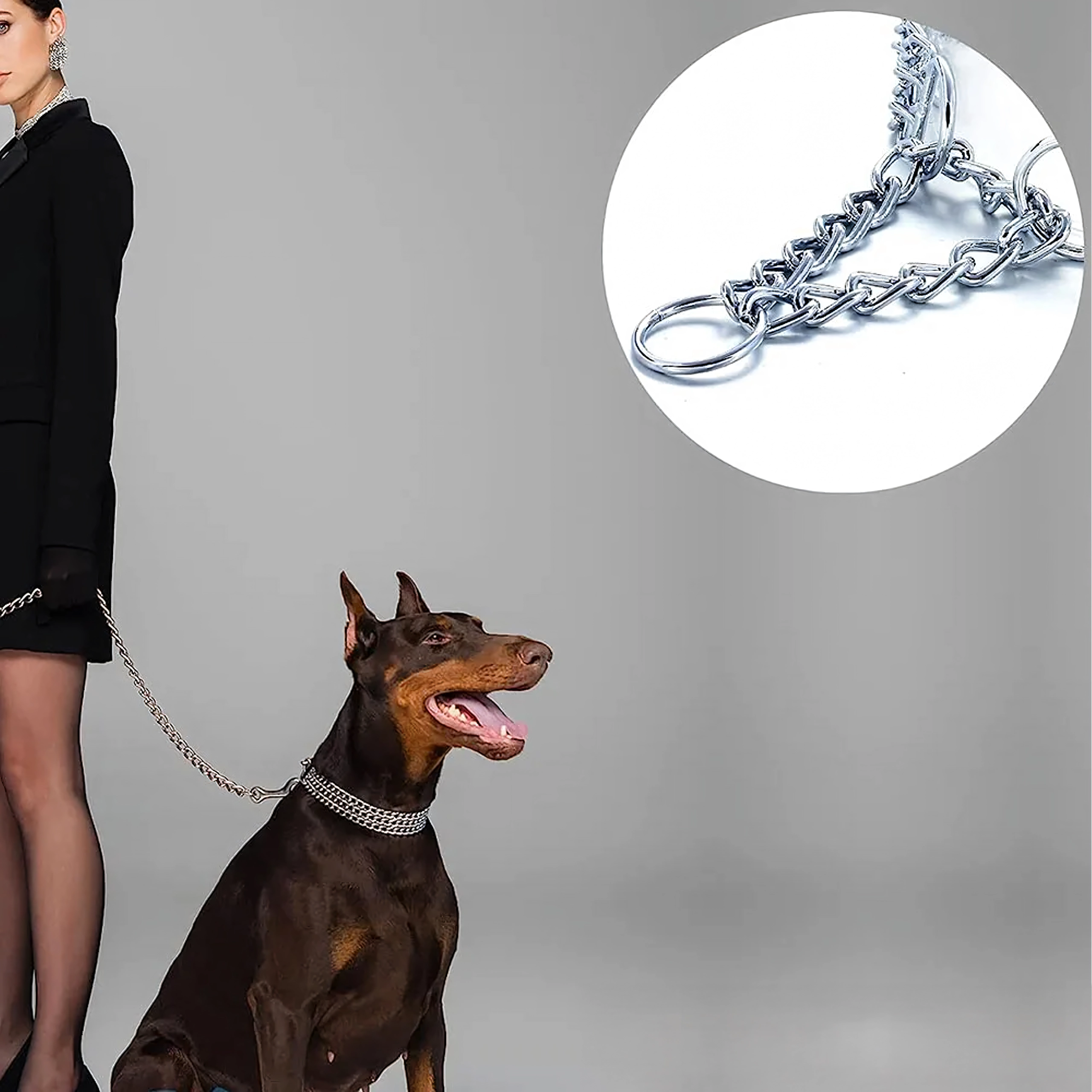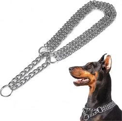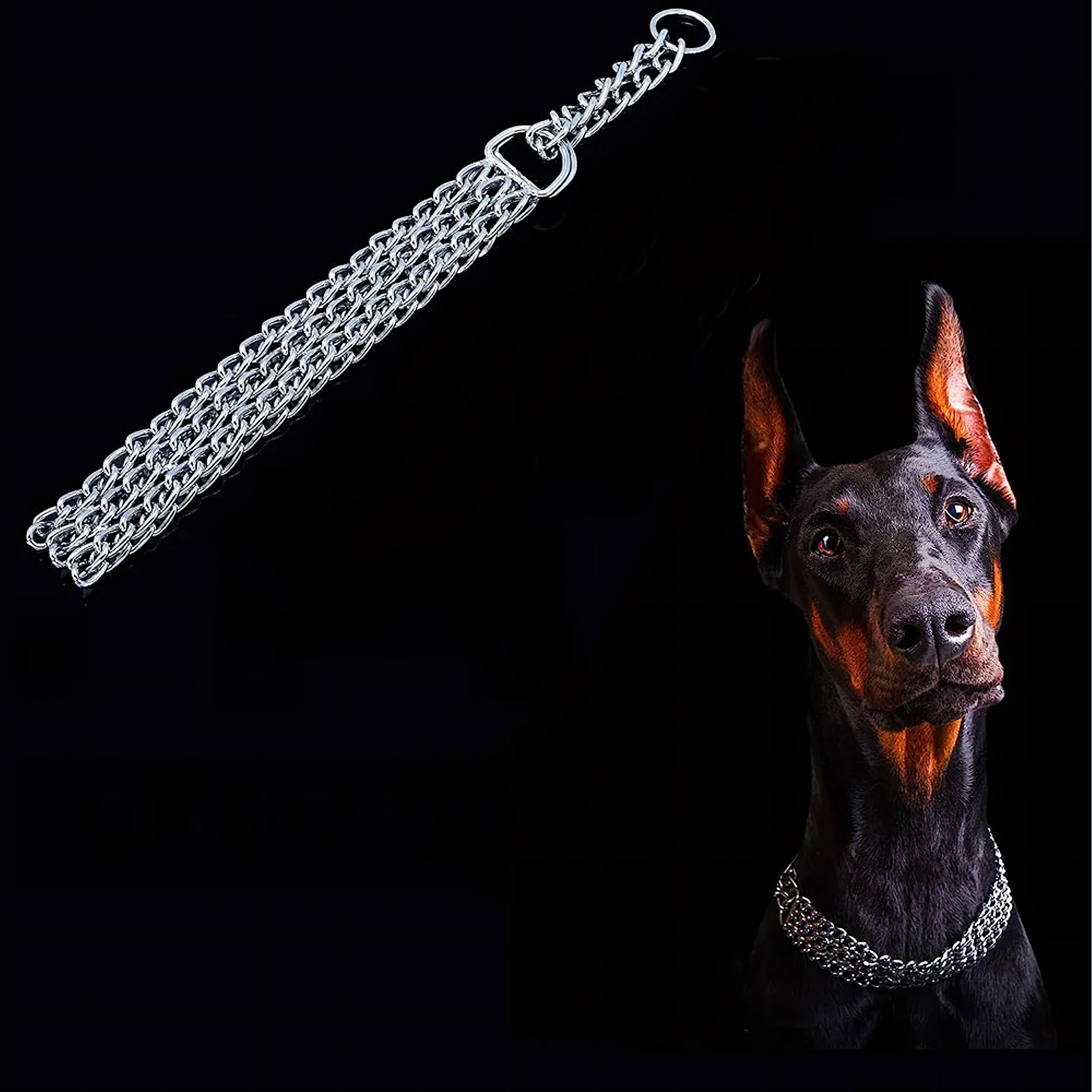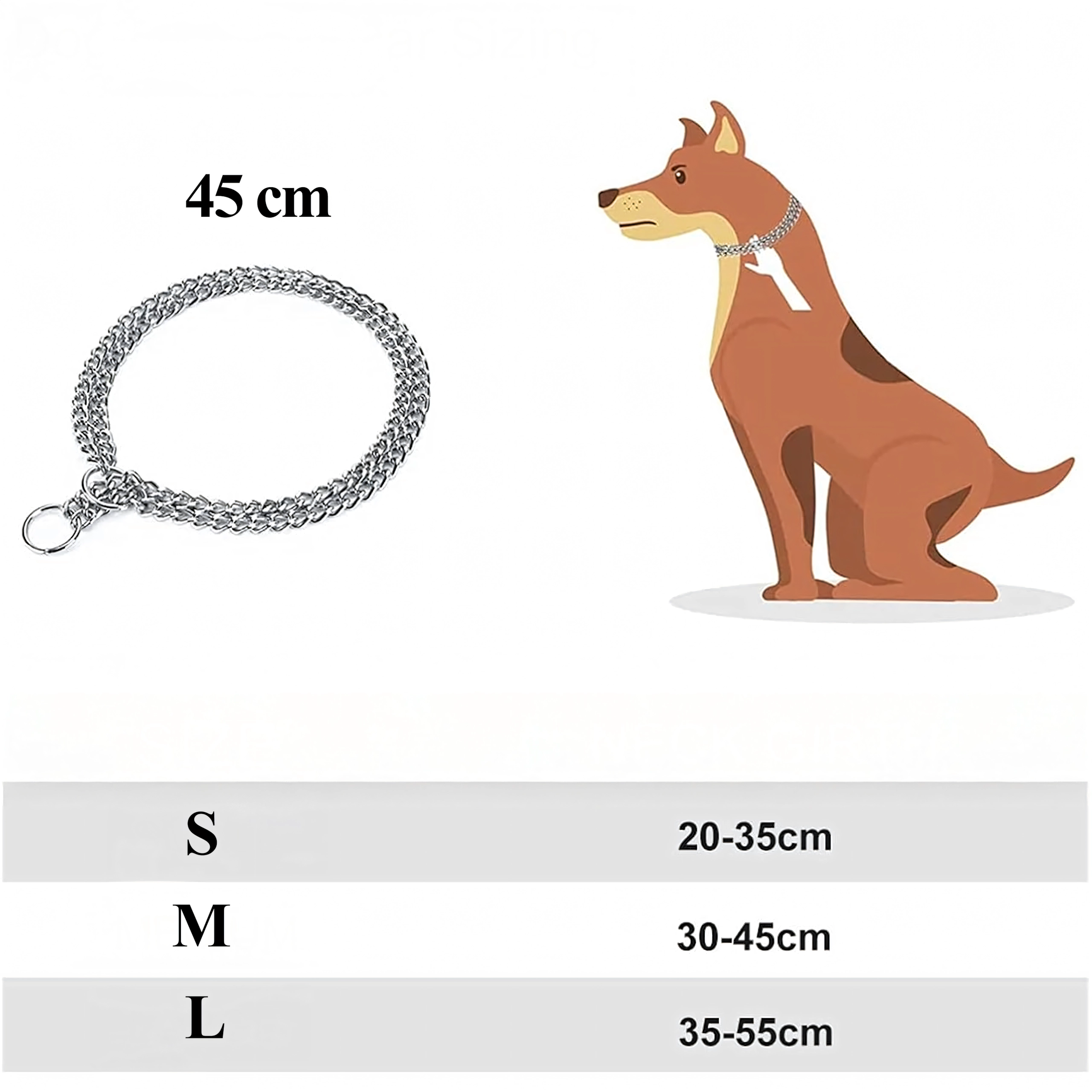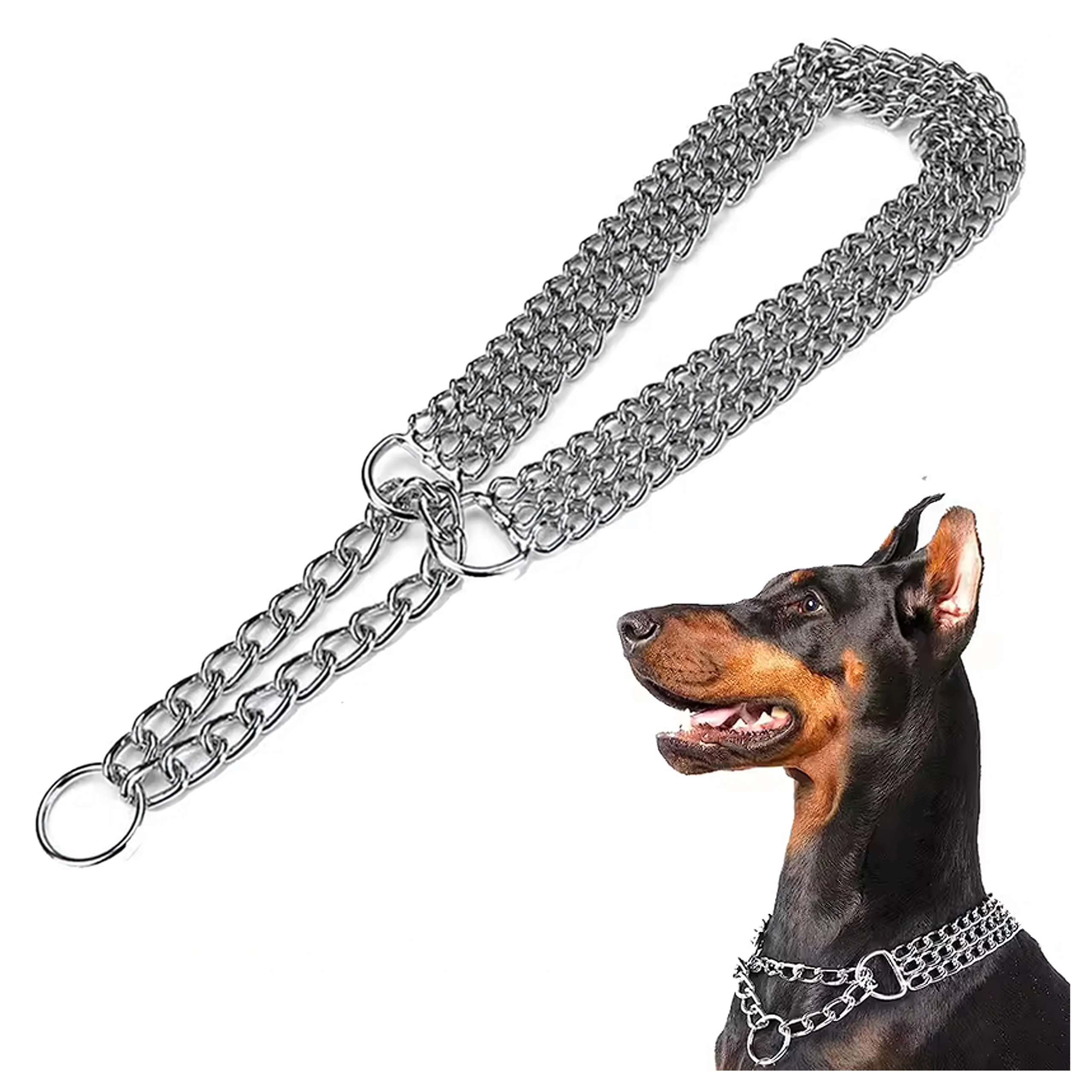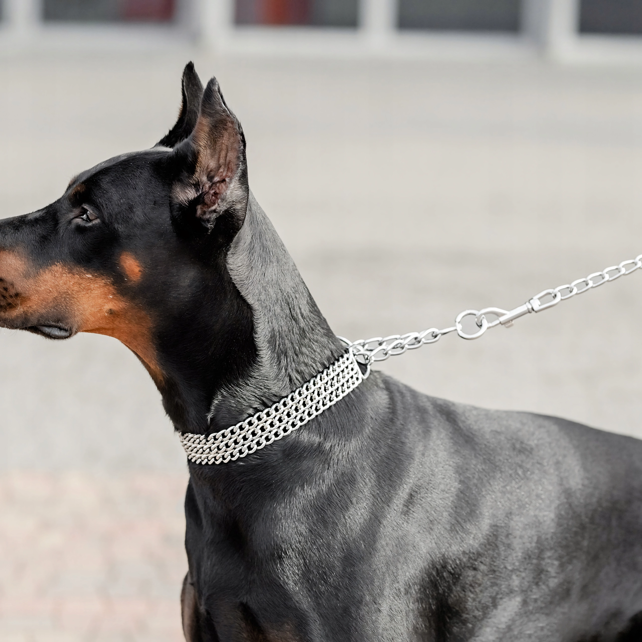 Този стягащ верижен нашийник е изработен от висококачествена хромирана стомана, която се отличава с висока здравина, устойчивост на корозия и гладка повърхност за комфорт на кучето. Тройната верига равномерно разпределя натиска и осигурява прецизен и чувствителен контрол по време на тренировка.