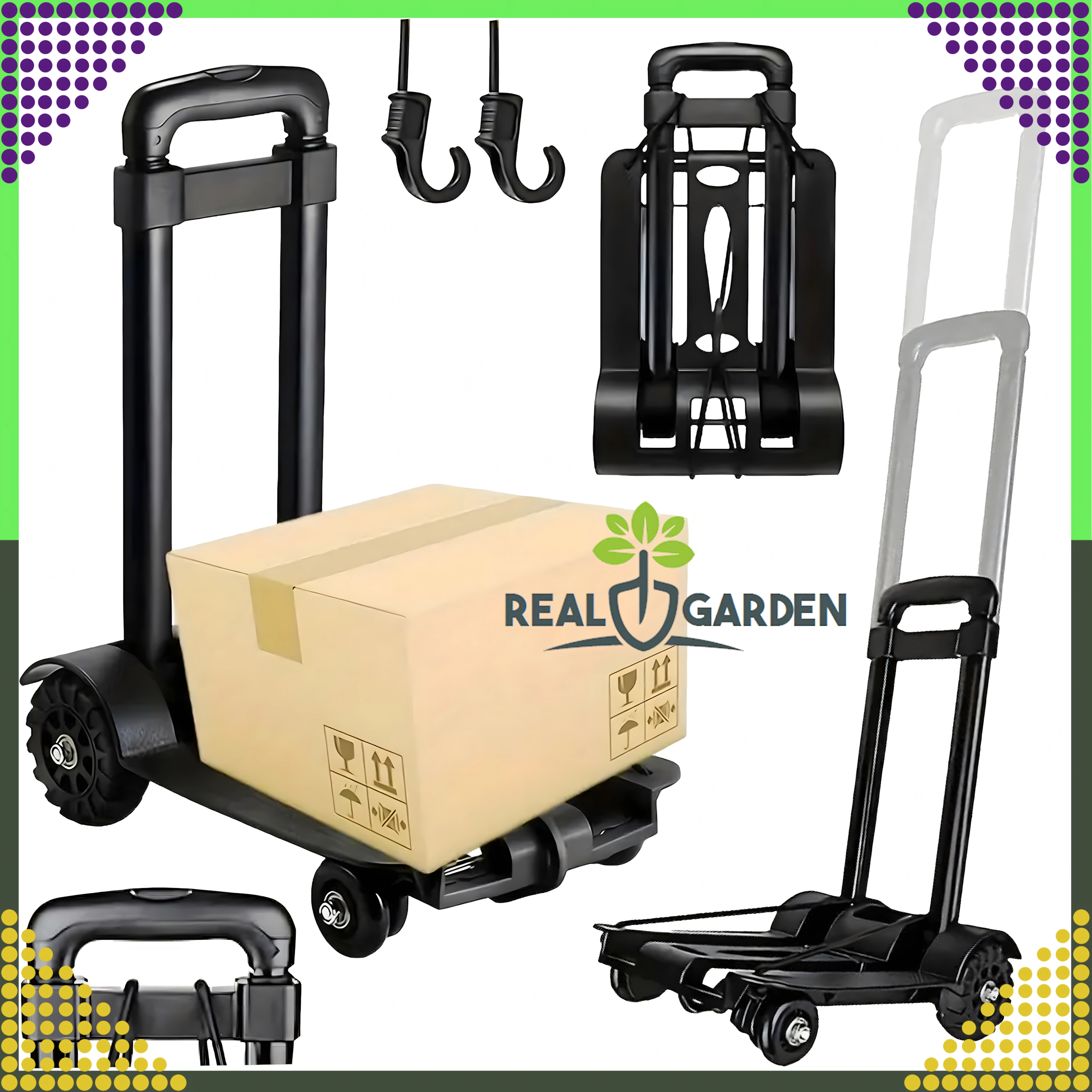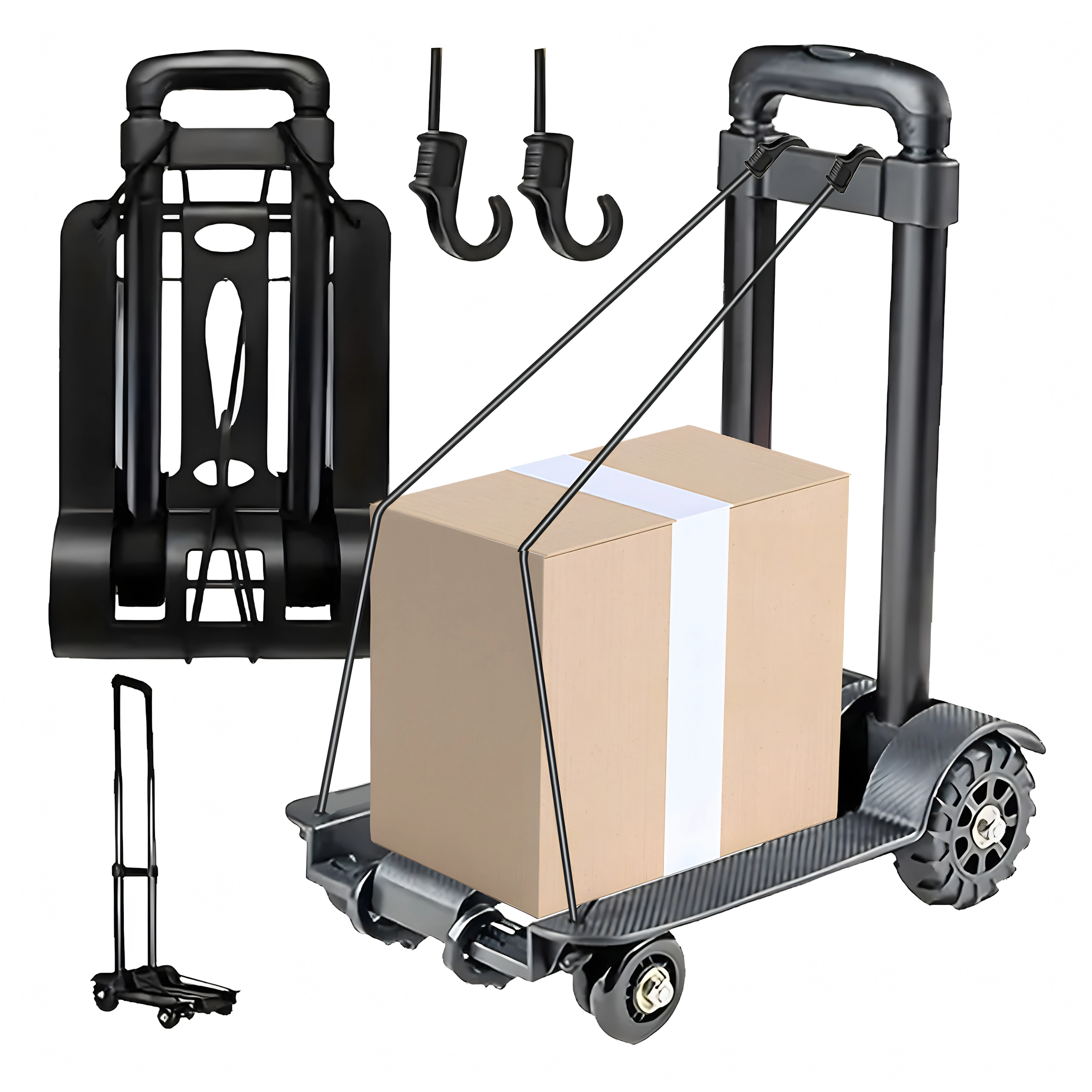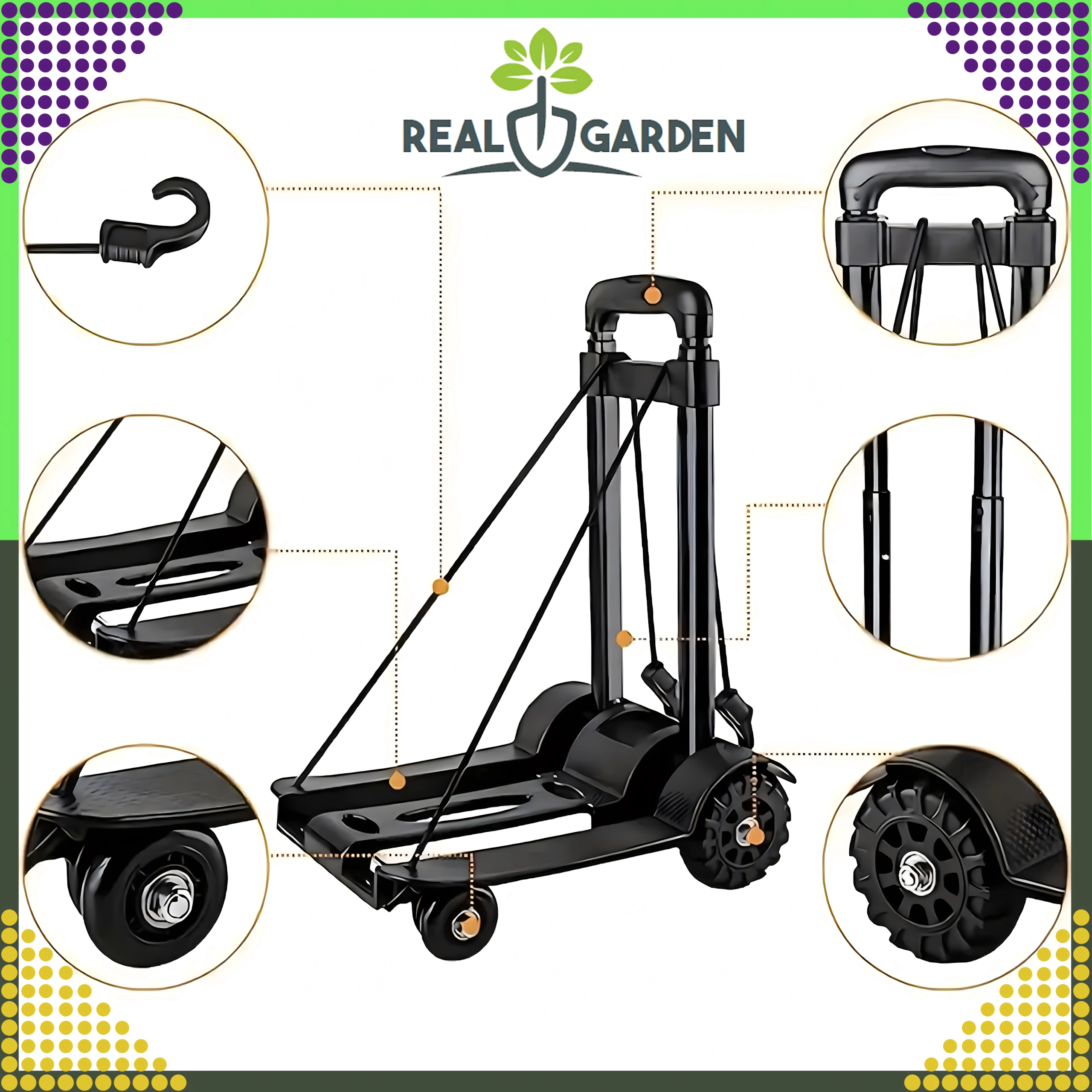 Количката е идеална за пазаруване, доставка на пратки, складове и работилници. В комплекта има гумени пристягащи въжета с куки, които държат пренасяния товар стабилно на място и повишават безопасността при работа.