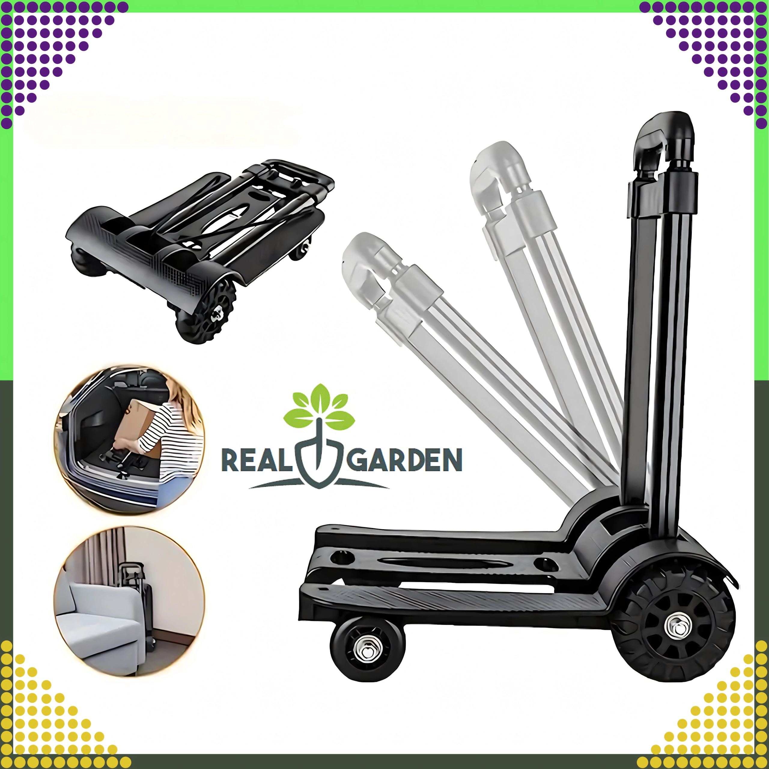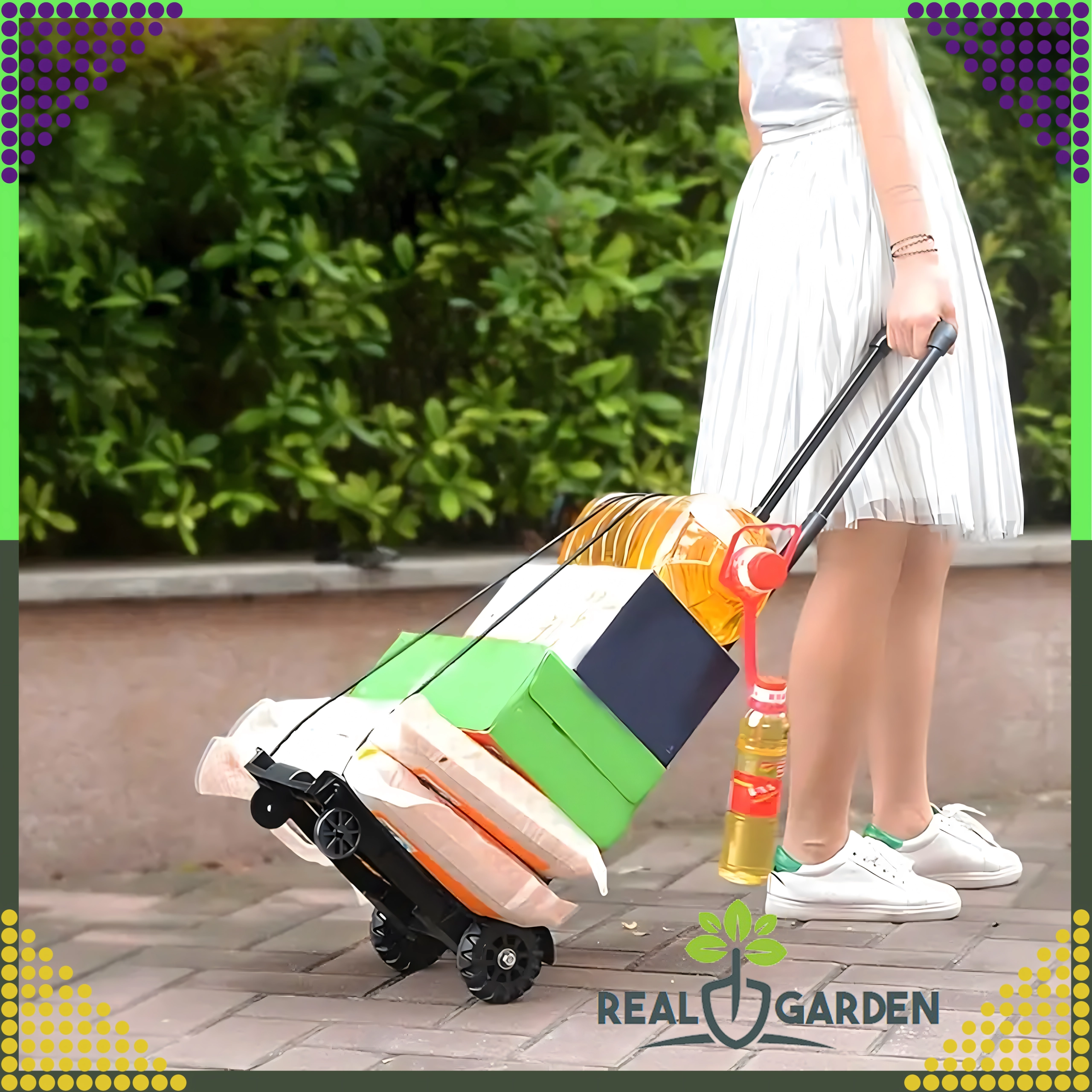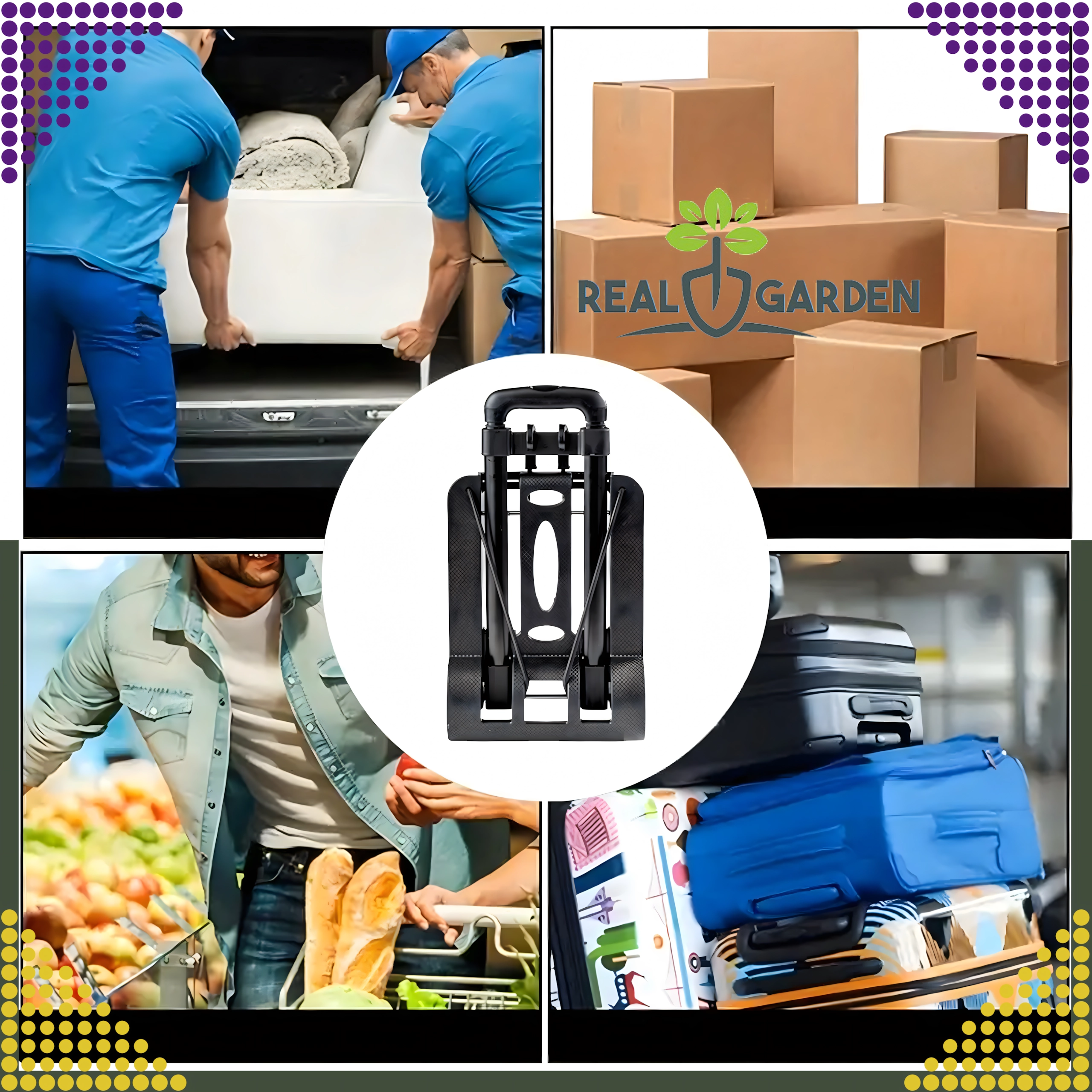 Количката е идеална за пазаруване, доставка на пратки, складове и работилници. В комплекта има гумени пристягащи въжета с куки, които държат пренасяния товар стабилно на място и повишават безопасността при работа.