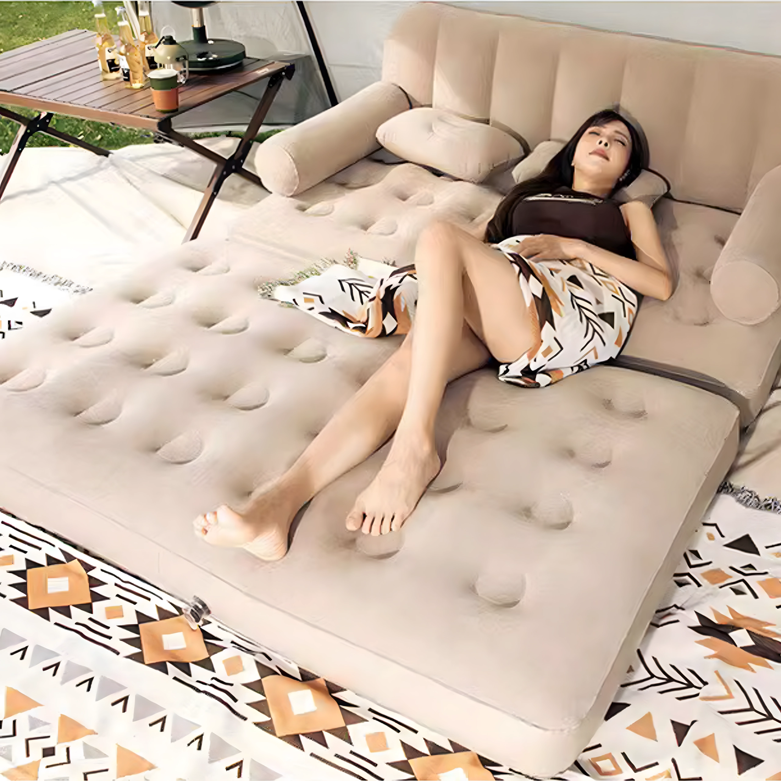 Удобно сядане в хола, релакс на терасата и комфортен сън на къмпинг. Бежовият дизайн пасва на всяка обстановка.