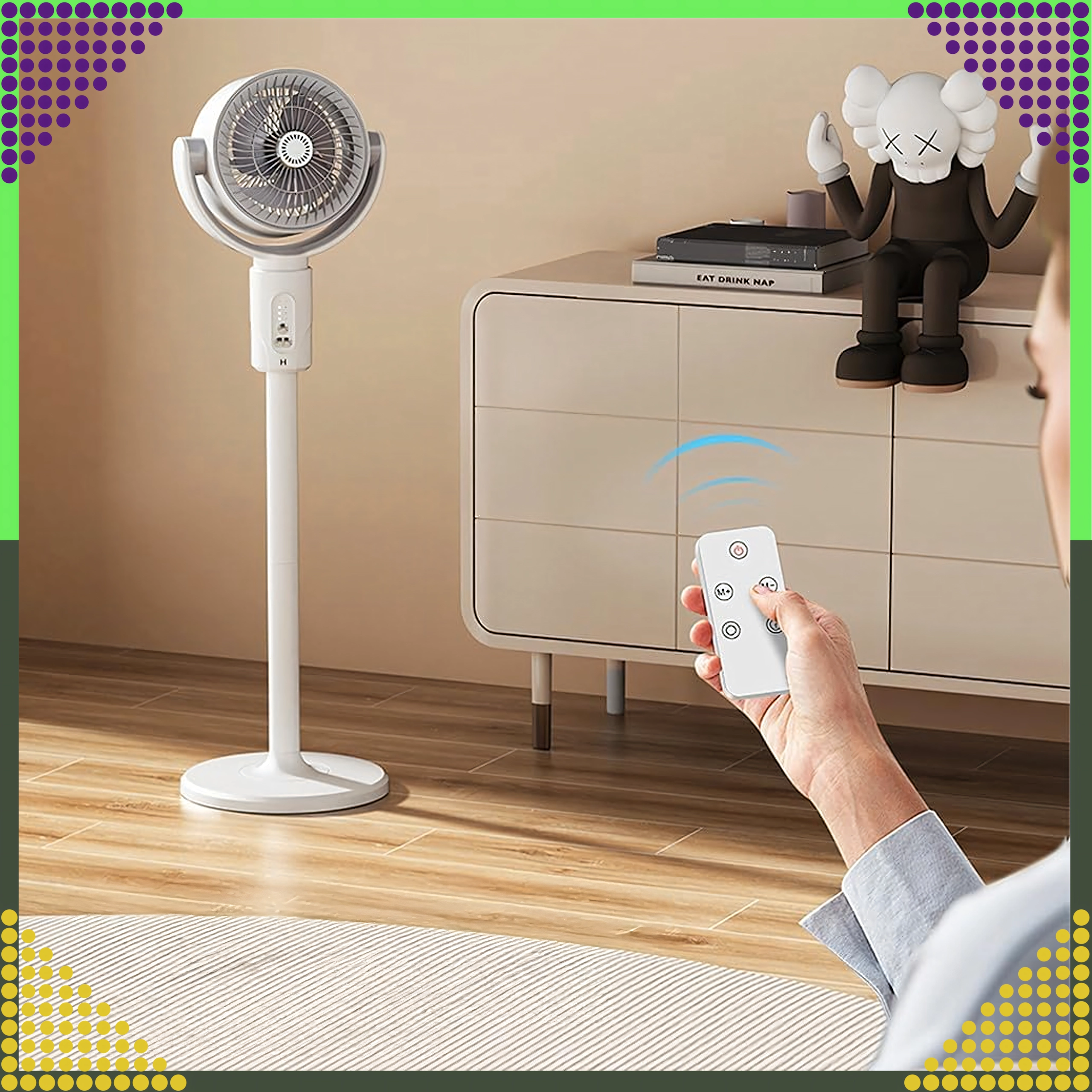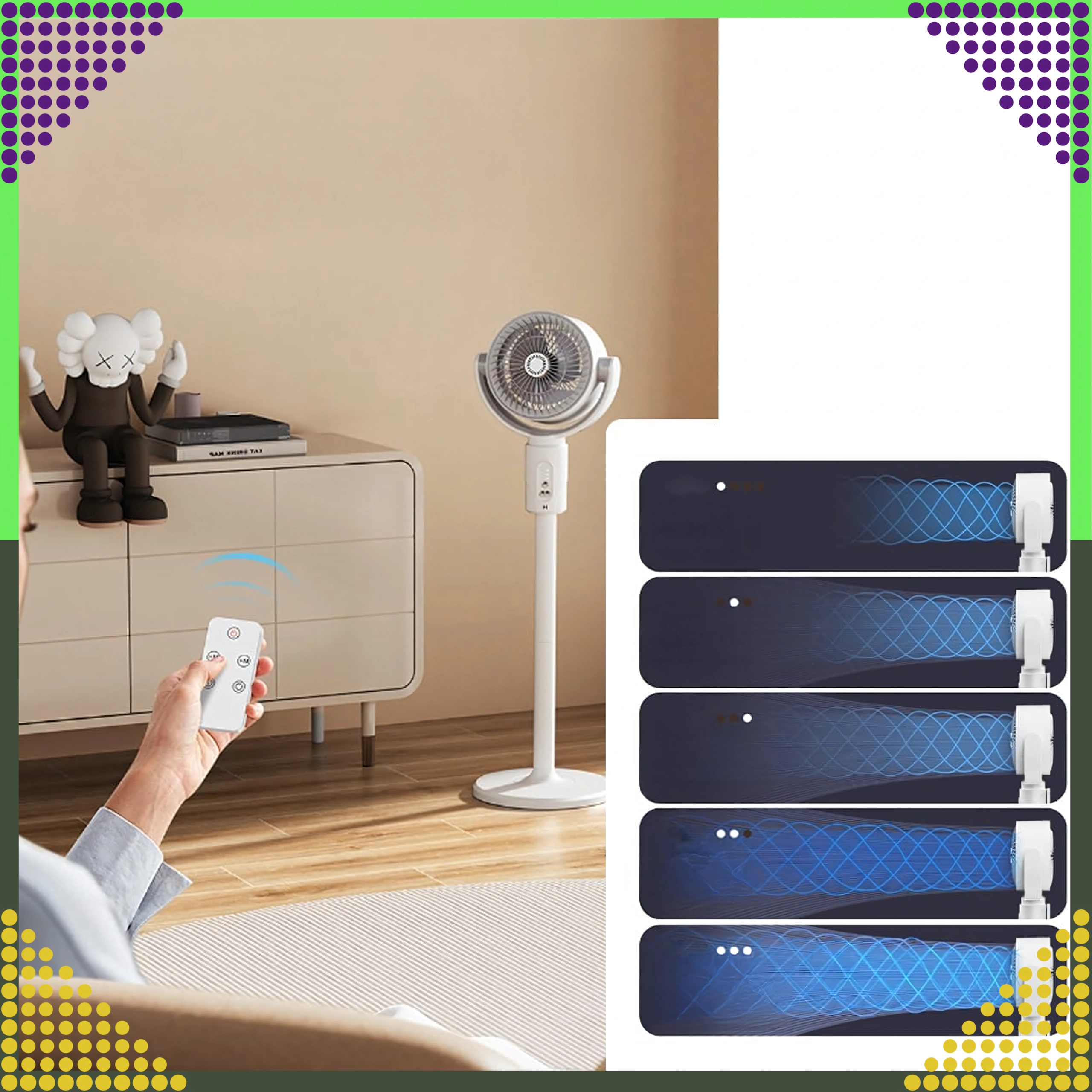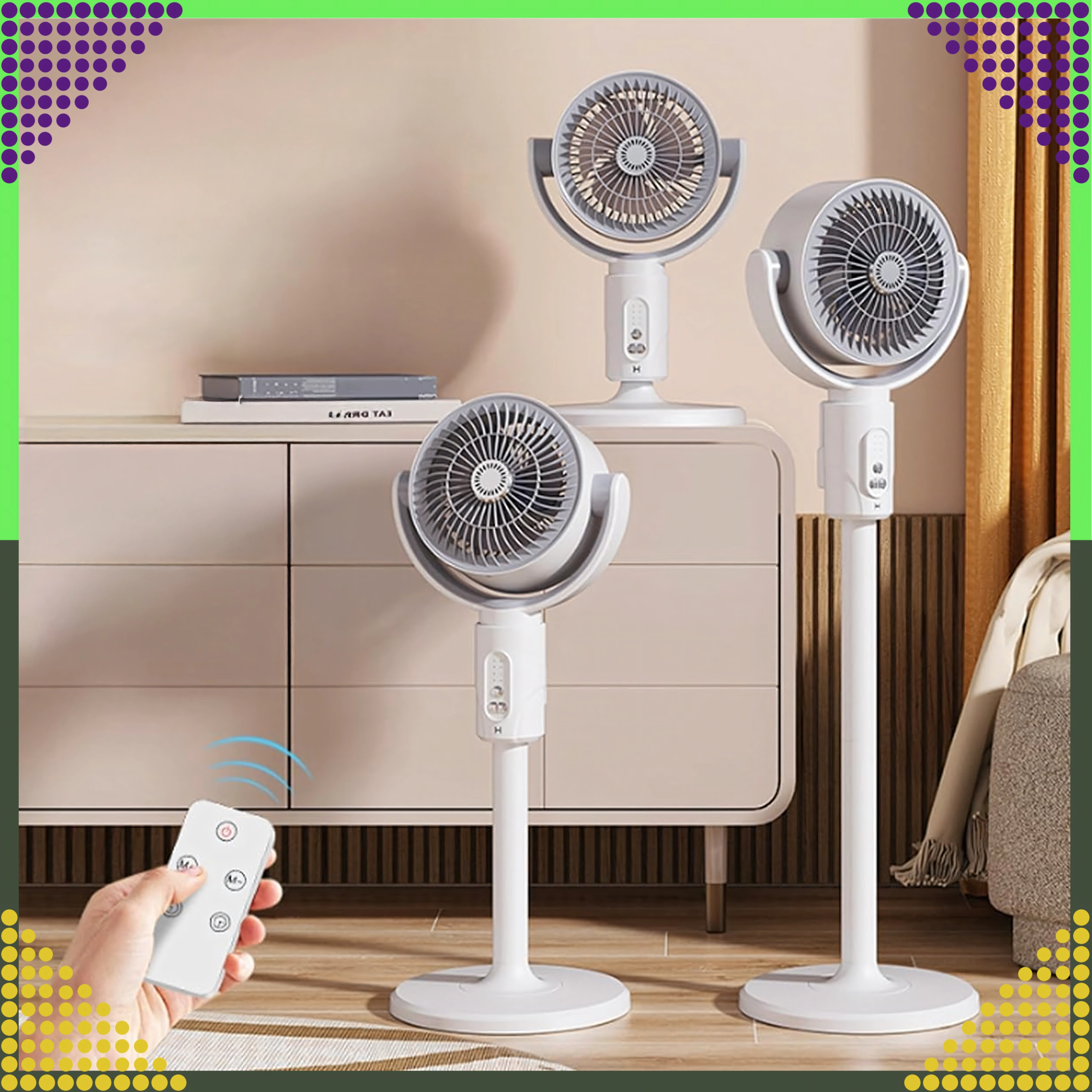 Управлявайте скоростта, таймера и осцилацията от удобството на дивана с включеното дистанционно. Идеален за всекидневна и спалня.