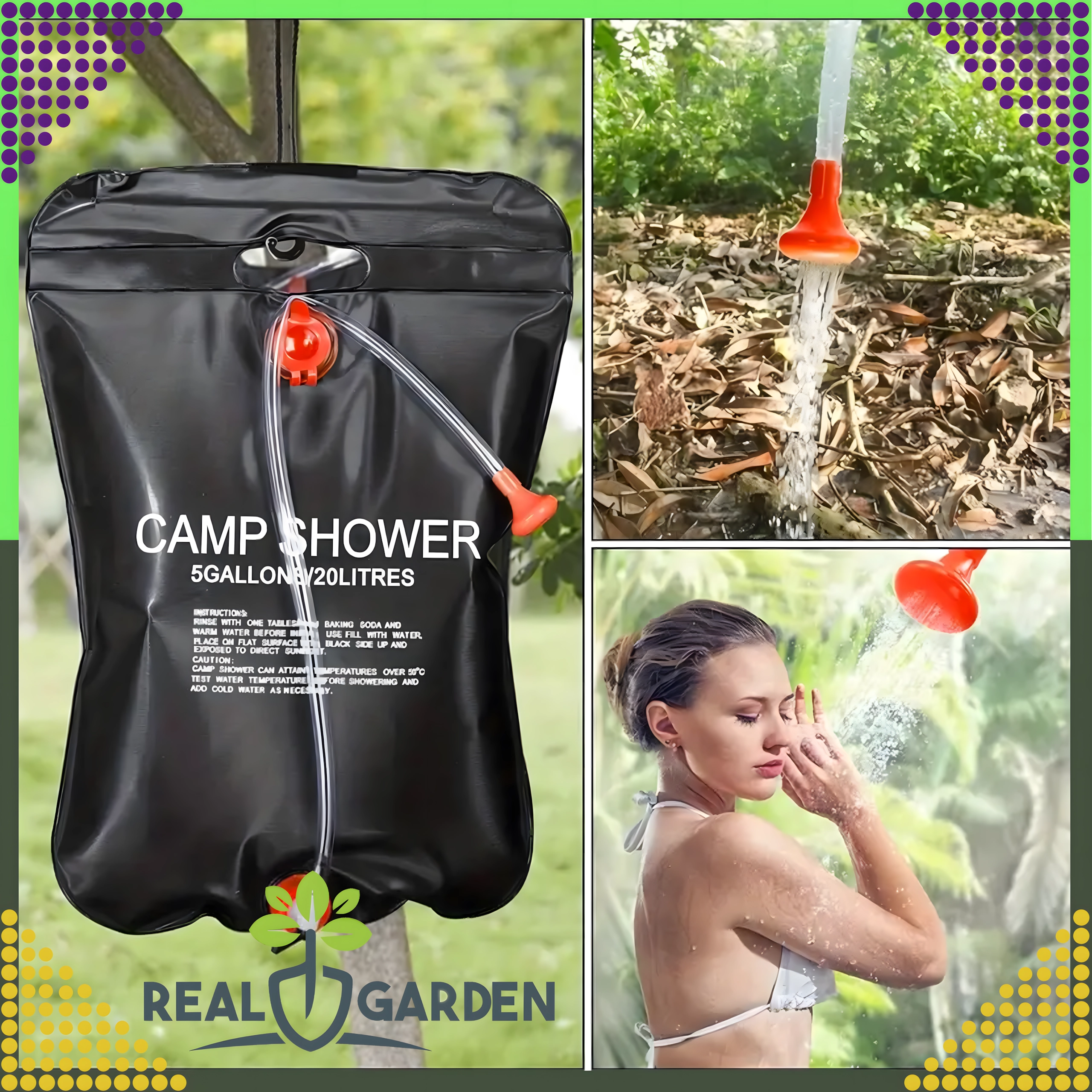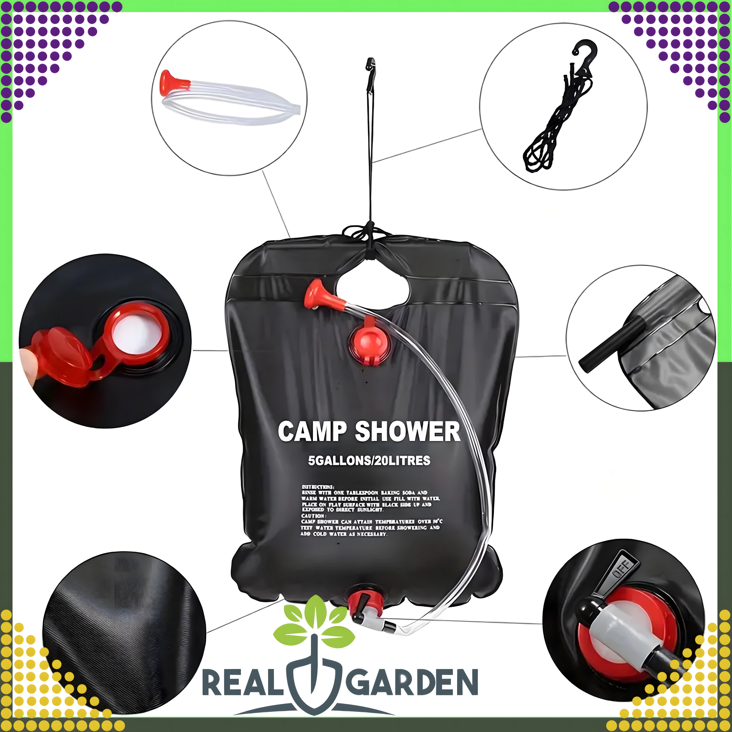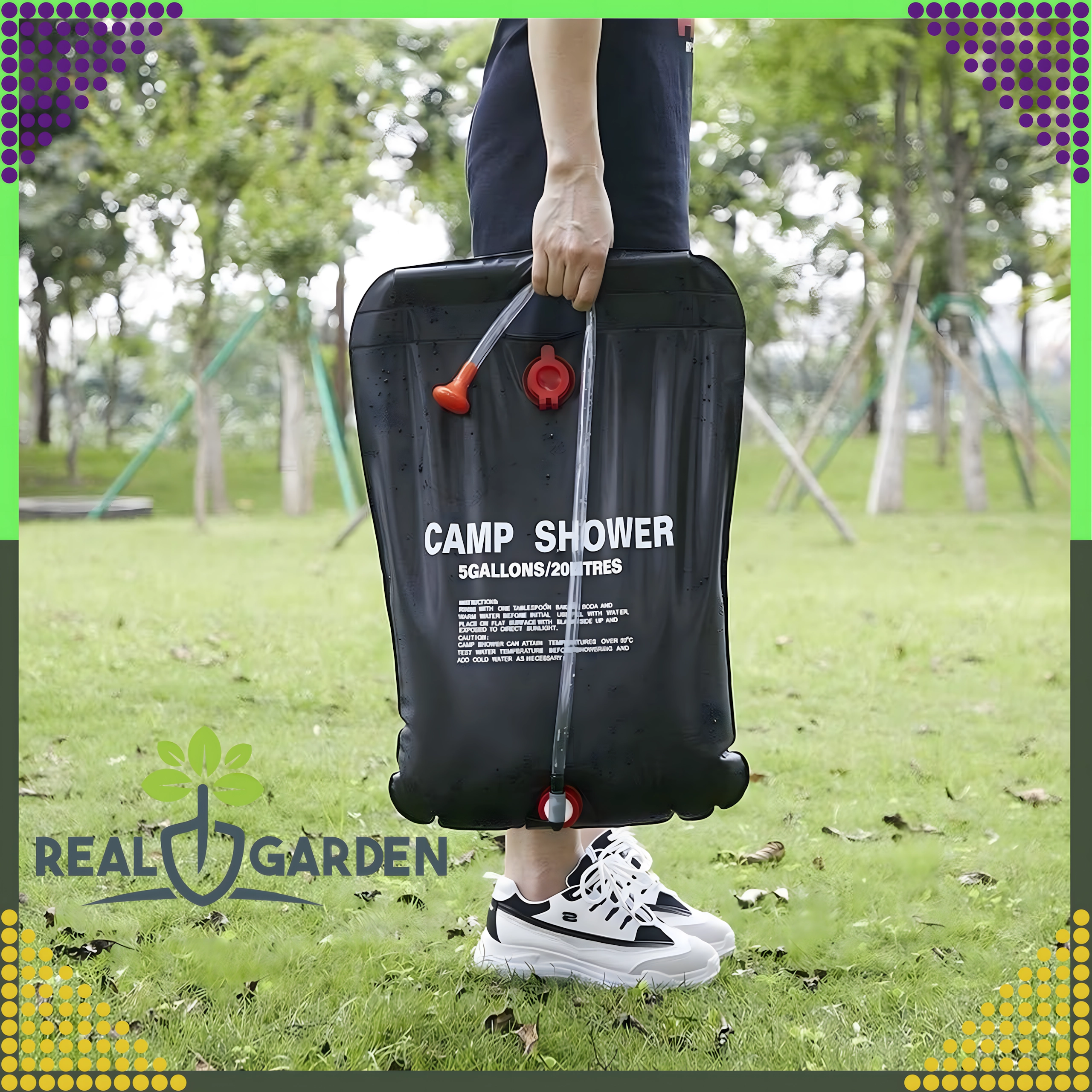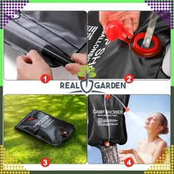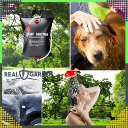 Душът е оборудван със здрав ухо за окачване и практична душ глава, което гарантира удобно ползване в къмпинг, край вода или в градината.