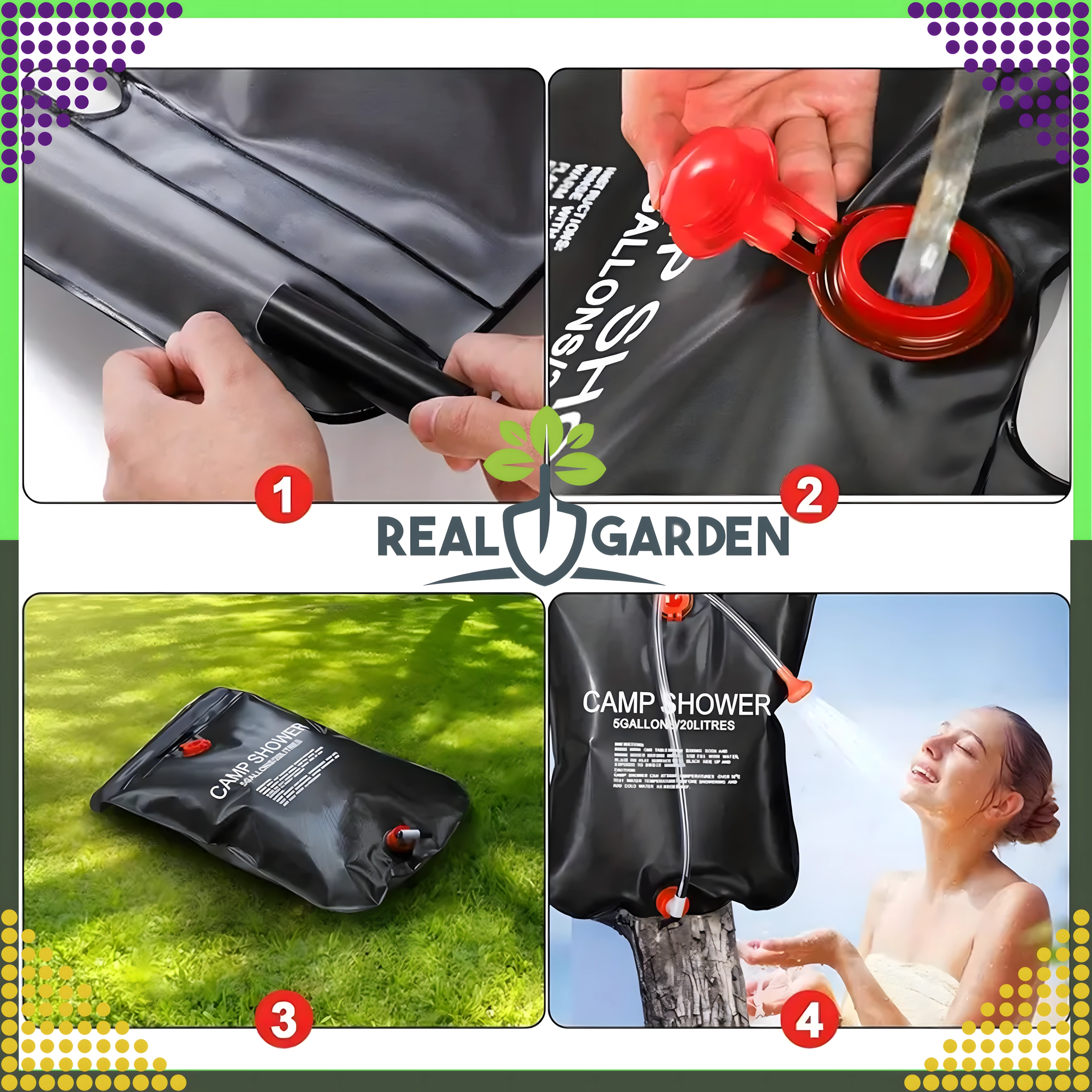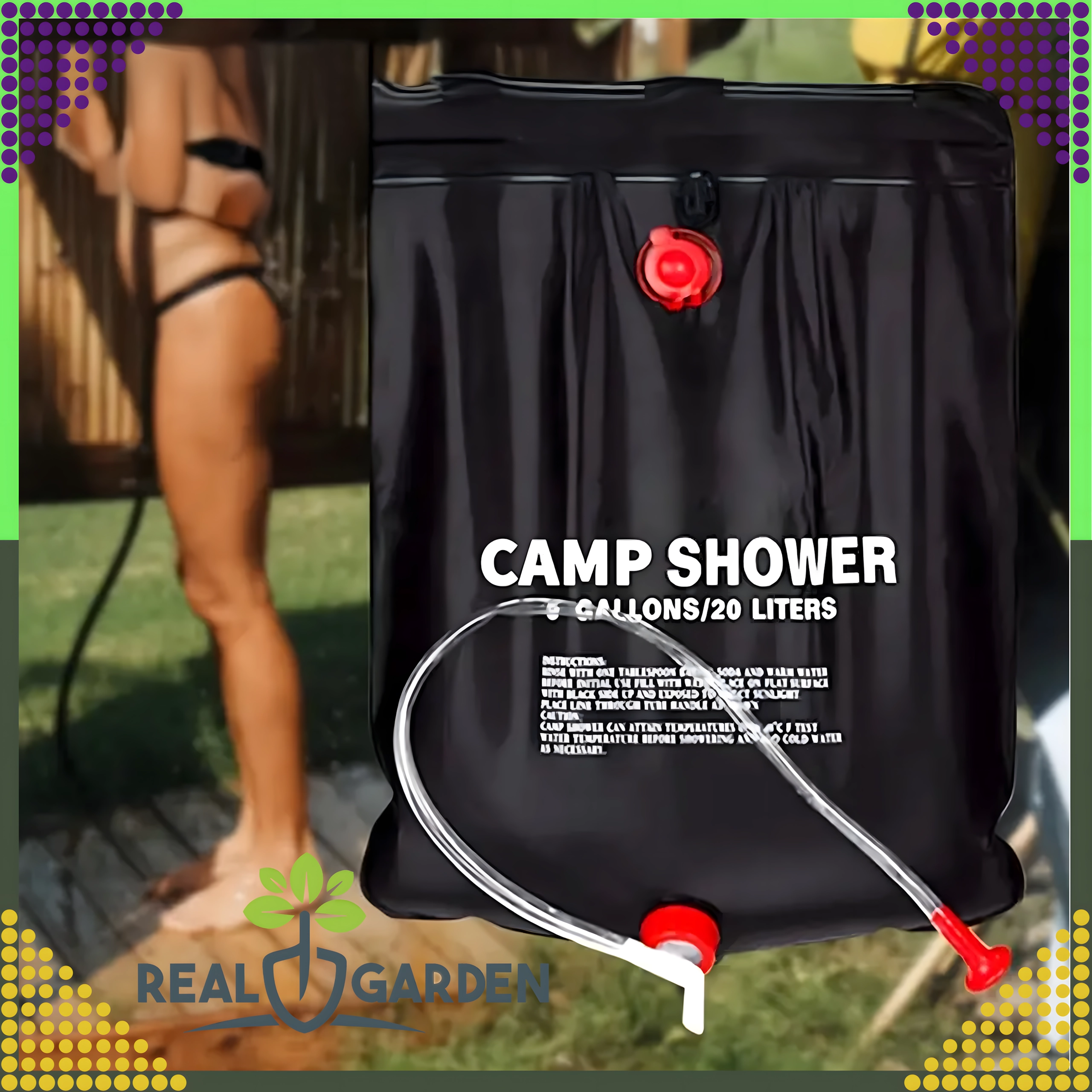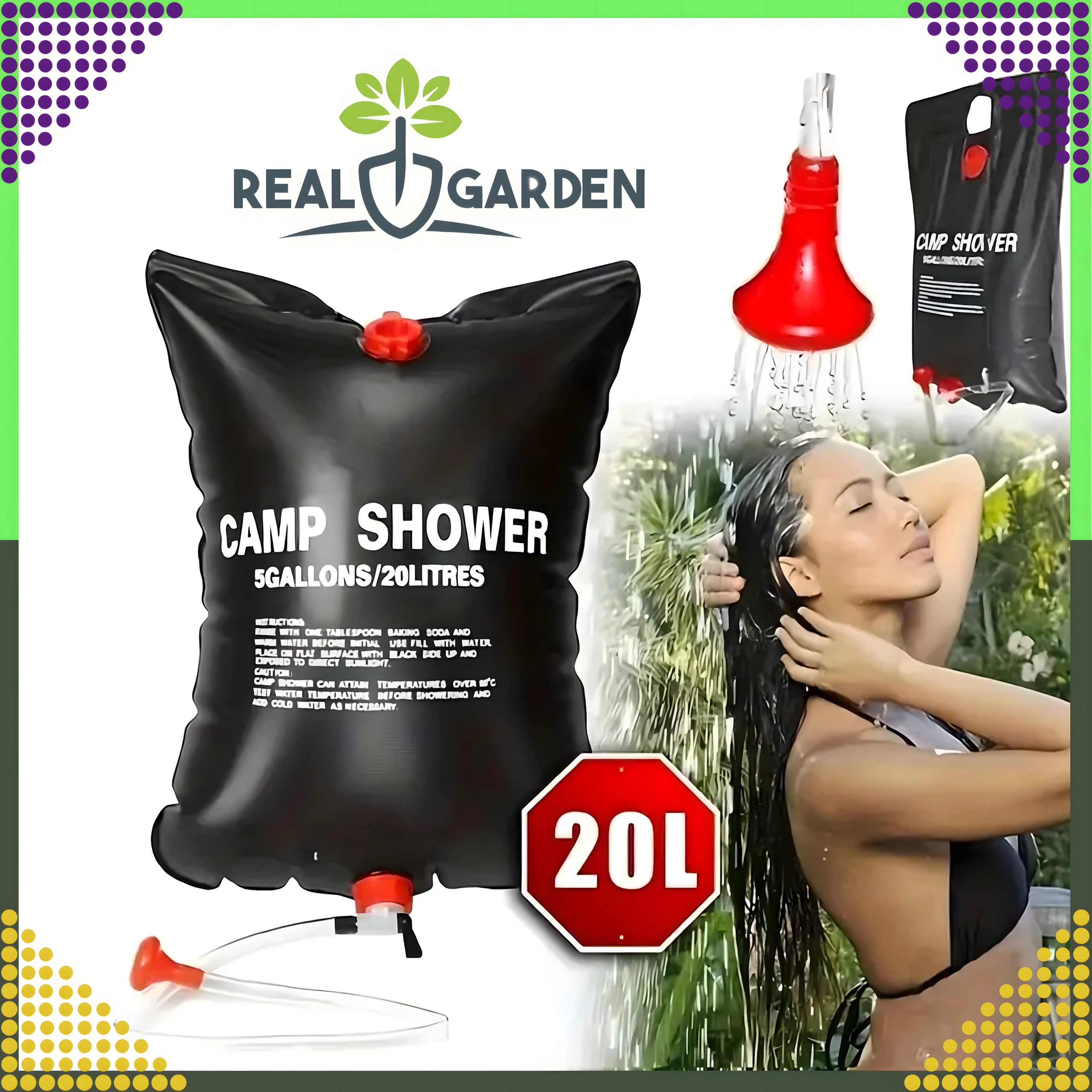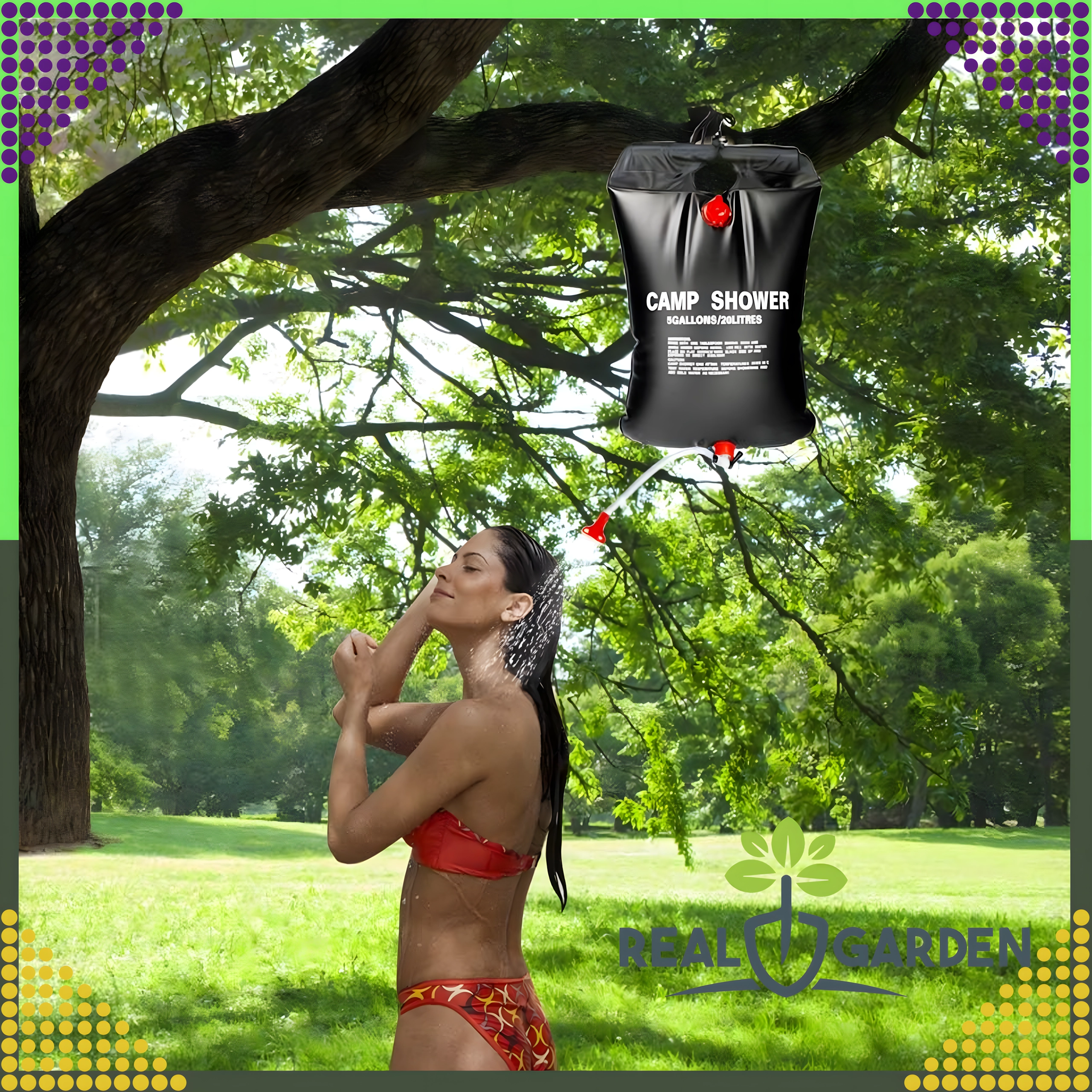 Душът е оборудван със здрав ухо за окачване и практична душ глава, което гарантира удобно ползване в къмпинг, край вода или в градината.