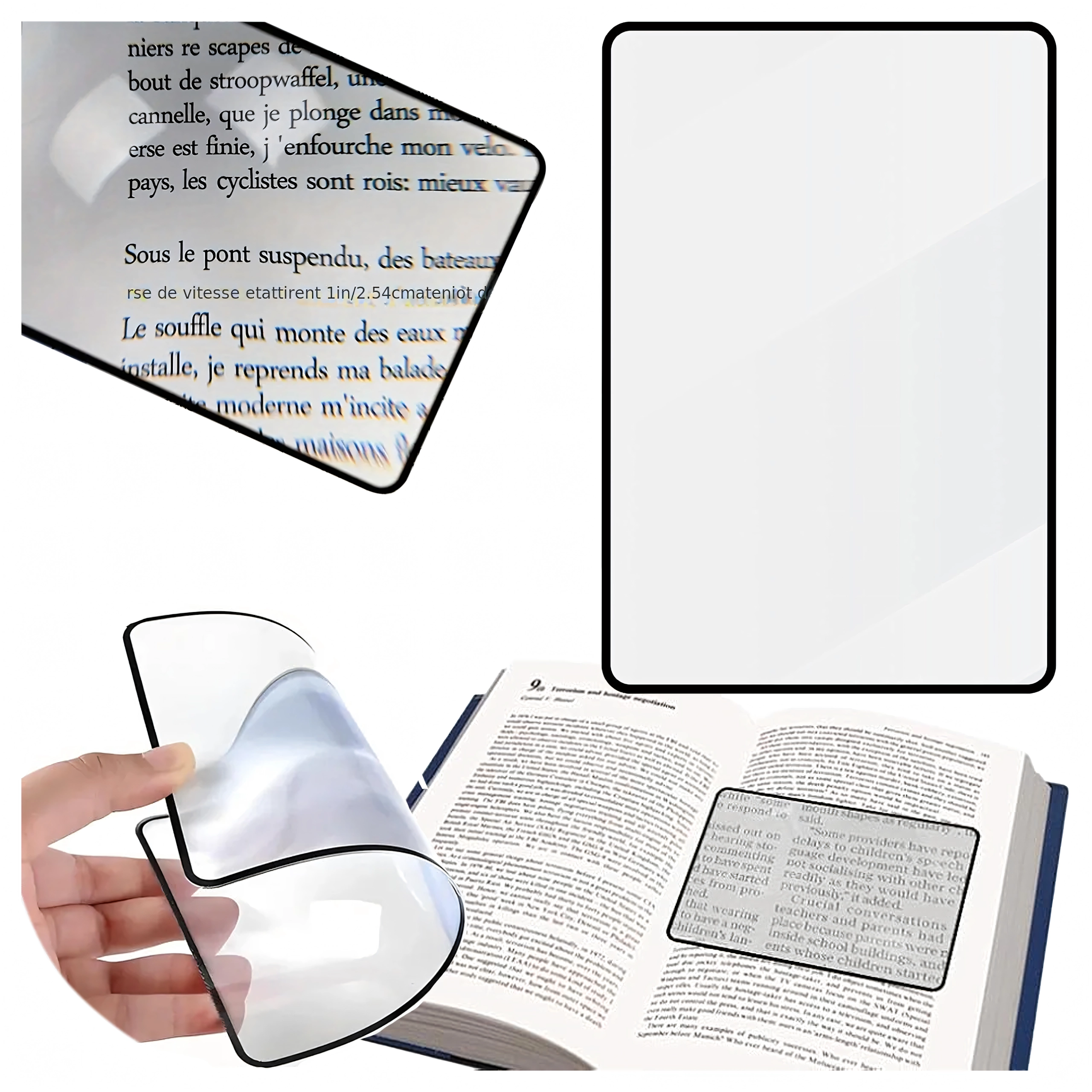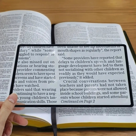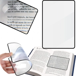 Практична странична лупа с гъвкава пластмасова леща увеличава текста и детайлите до 200%. Благодарение на тънката изработка с лек рамкиращ кант се държи удобно, можете да я поставите директно върху страницата и да четете без напрягане на очите.