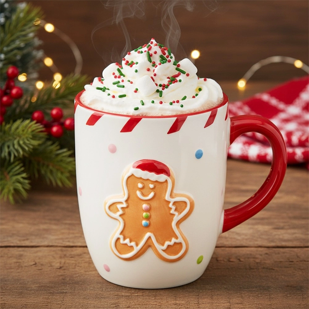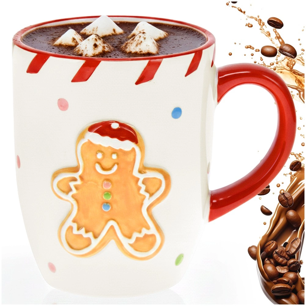 Сладка коледна чаша с мотив на джинджифилово човече и контрастна червена дръжка, идеална за всекидневно пиене на чай, кафе или какао. Има вместимост 330 мл, удобно оформена дръжка и качествена керамика, която добре задържа топлината. Благодарение на празничния дизайн е страхотен подарък за зимния сезон и стилен аксесоар за горещи напитки в хладните вечери.