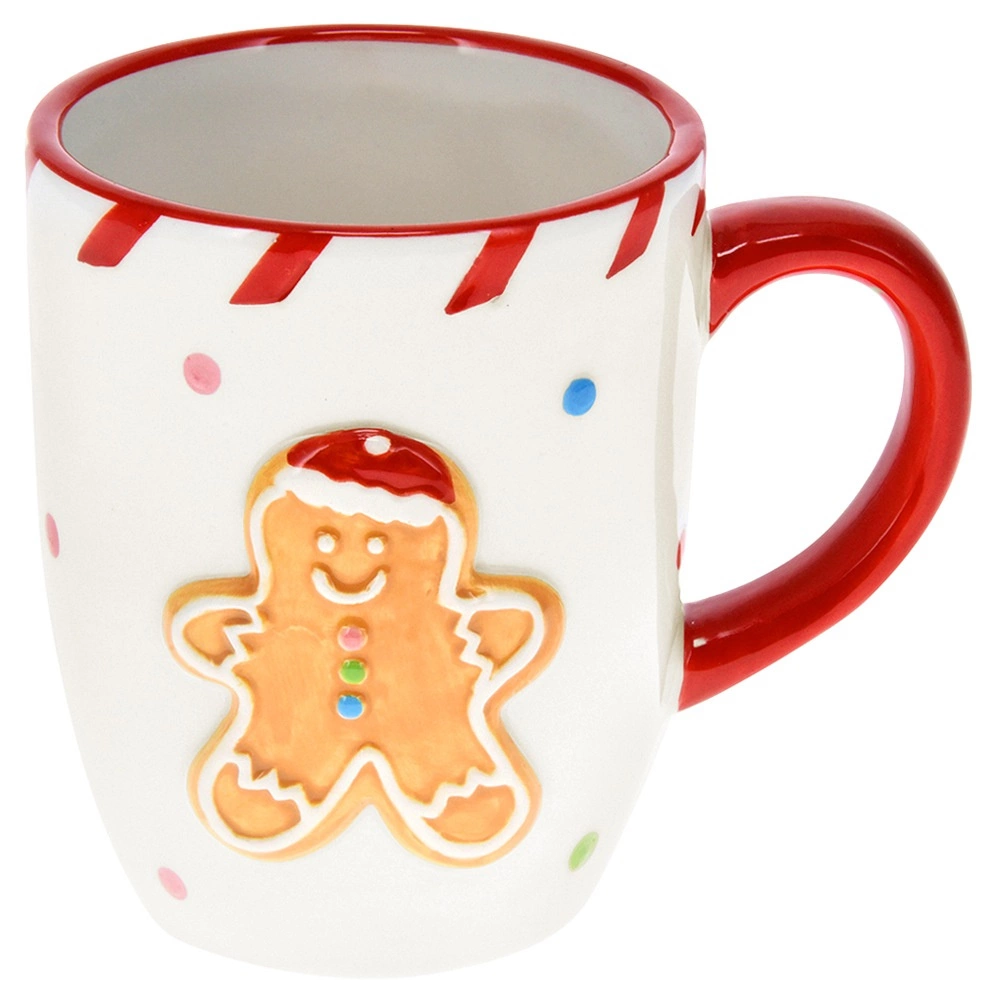 Коледната керамична чаша с релефен мотив на джинджифилово човече ще внесе празнична атмосфера във вашата кухня. Белият корпус е допълнен от червена дръжка, захарна райета по ръба и цветни точки, които ѝ придават игрив вид. Обемът от 330 мл е идеален за чай, кафе, капучино и горещ шоколад.