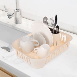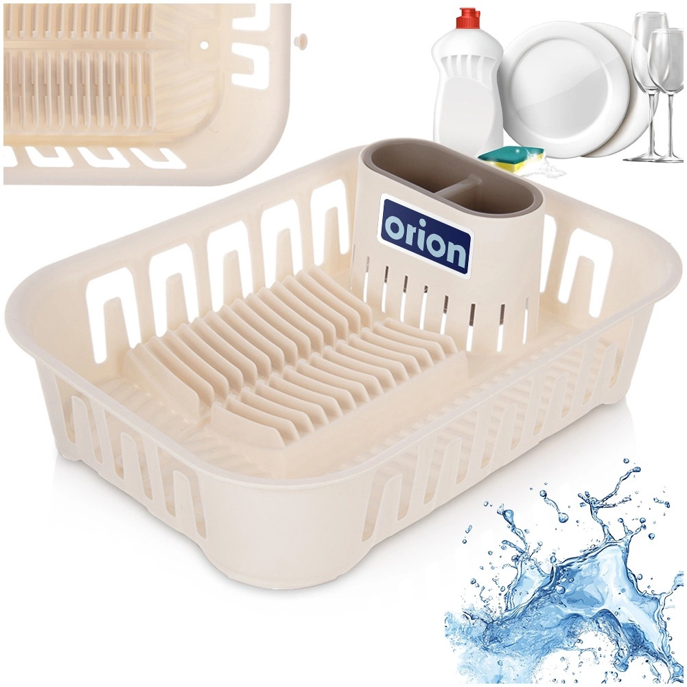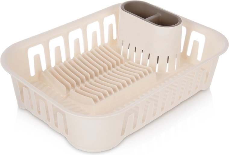 Практичен кремав сушилник за съдове / отцедник за съдове с подвижен контейнер за прибори и място за до 13 чинии. Има система за отвеждане на вода със затварящ се отток, стабилна неплъзгаща се основа и се почиства лесно – идеален за кухнята, вилата и караваната.