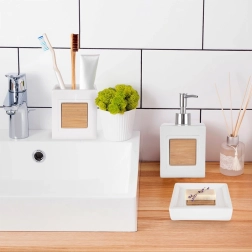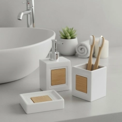 Елегантен 3-частен бански комплект в бял цвят, който комбинира издръжлив доломит и естествен бамбук. Включва диспенсър за сапун 350 ml, чаша за баня 330 ml и сапунерка. Минималистичен дизайн, лесна поддръжка и универсален стил за модерни и класически бани.