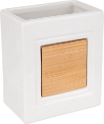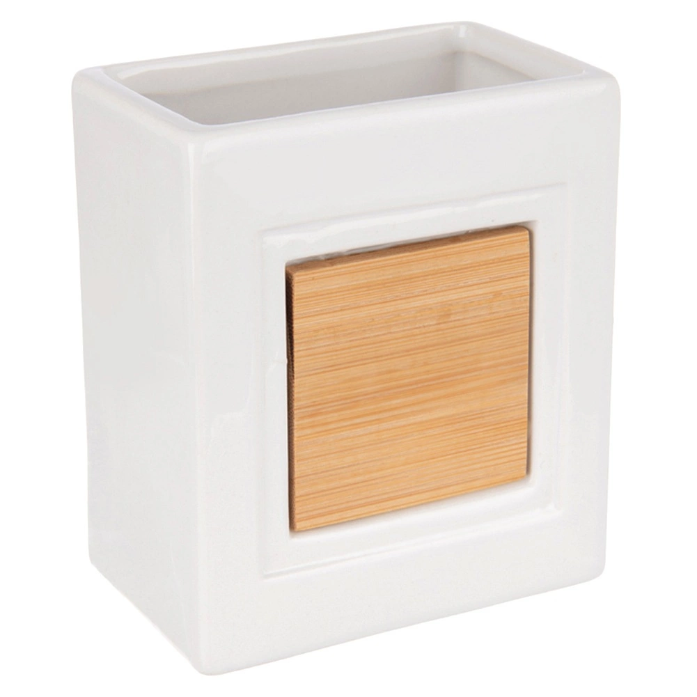 Лъскава бяла повърхност с бамбуков панел изглежда елегантно и държи четките и дребните вещи под ръка.
