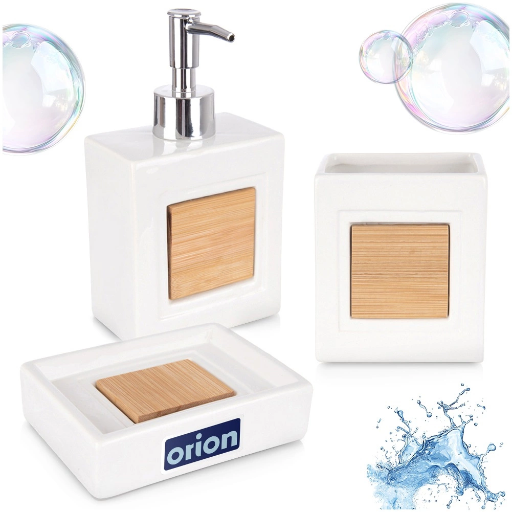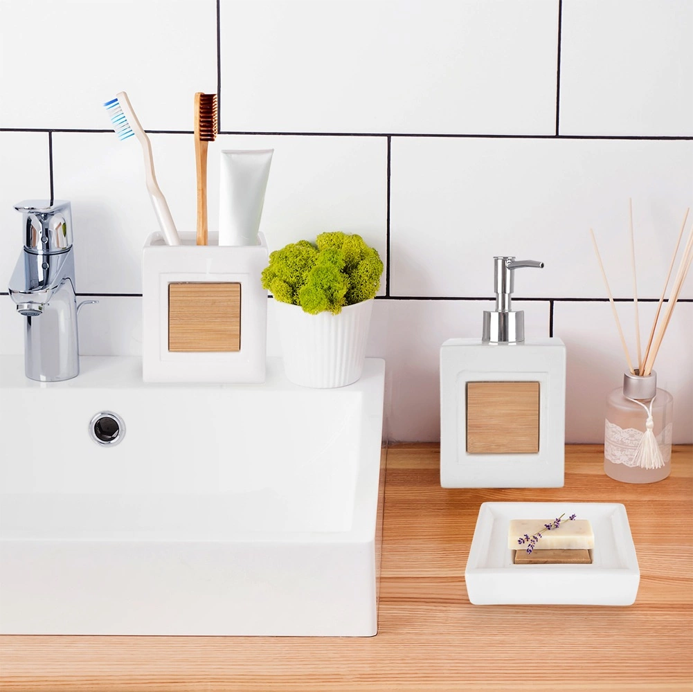 Комплектът включва диспенсър за течен сапун с прецизно дозиране, чаша за четки за зъби или козметични аксесоари и сапунерка за хигиенично оставяне на твърд сапун. Идеален за баня и тоалетна – помага да поддържате ред и елегантен външен вид.