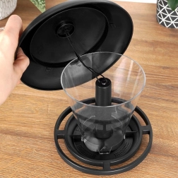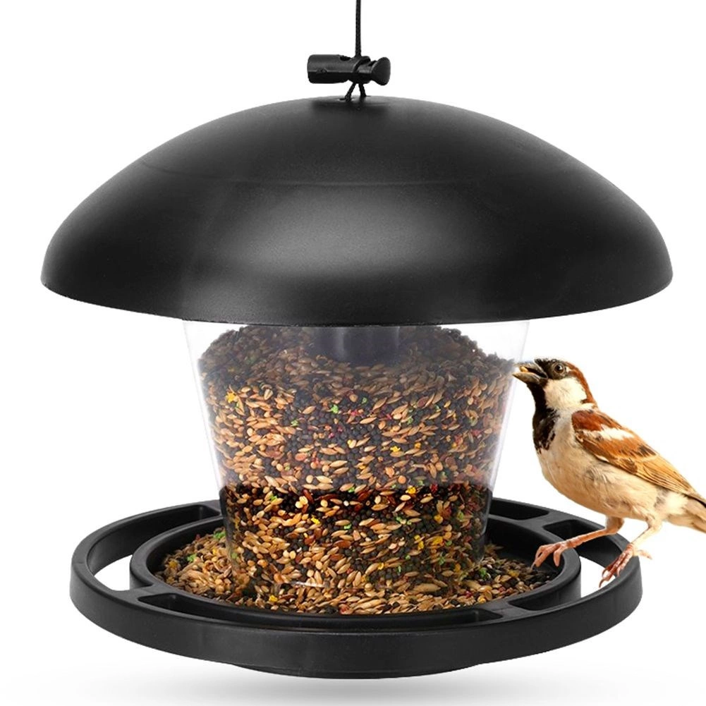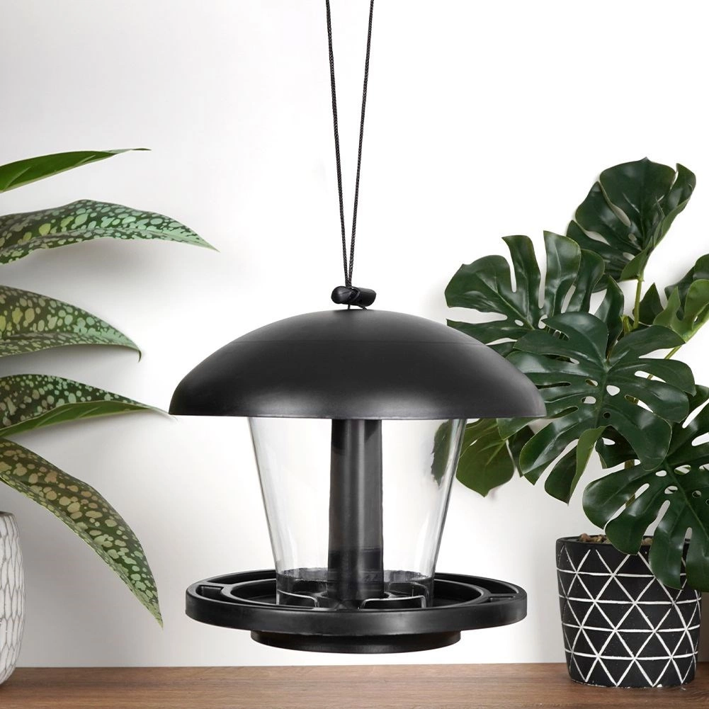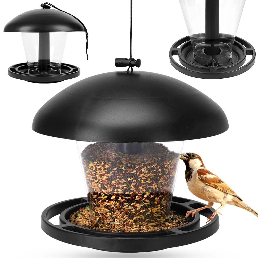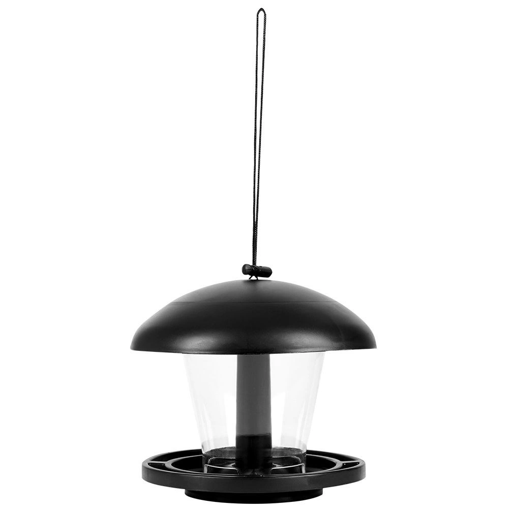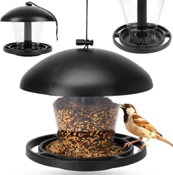 Стилна висяща хранилка за птици с размери 19 × 19 × 16,5 cm с прозрачен резервоар и черен покрив, която осигурява надеждна защита от дъжд, лесен контрол на количеството храна и удобно кацане за птиците. Благодарение на здравото въже лесно я окачвате на дърво или кука на балкона.