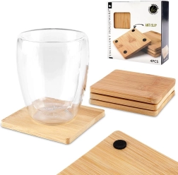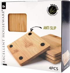 Стилен комплект от четири квадратни подложки от бамбукова дървесина, които предпазват масата ви от топлина, влага и надрасквания. Подложките са с размер 9,7 × 10 × 0,7 см, издръжливи са, екологични и благодарение на незплъзгащите подложки стоят стабилно на място. Отлични за топли и студени напитки и като елегантна декорация за масата.