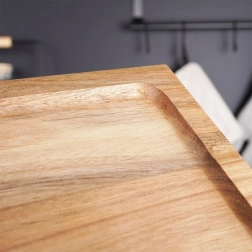 Елегантна дървена дъска от акациево дърво на стабилни крачета за стилно сервиране и рязане. Предлага повдигната конструкция за лесно загребване, защитен повдигнат ръб срещу плъзгане на храната и естествен, издръжлив материал, който не поема миризми и съхне бързо.
