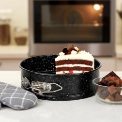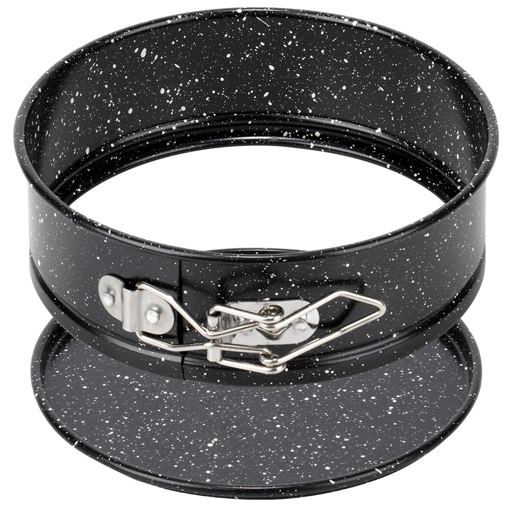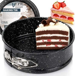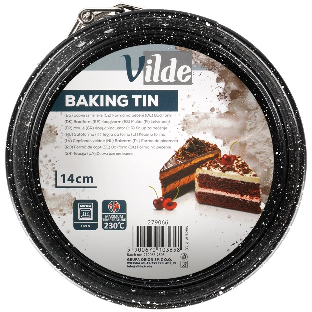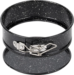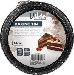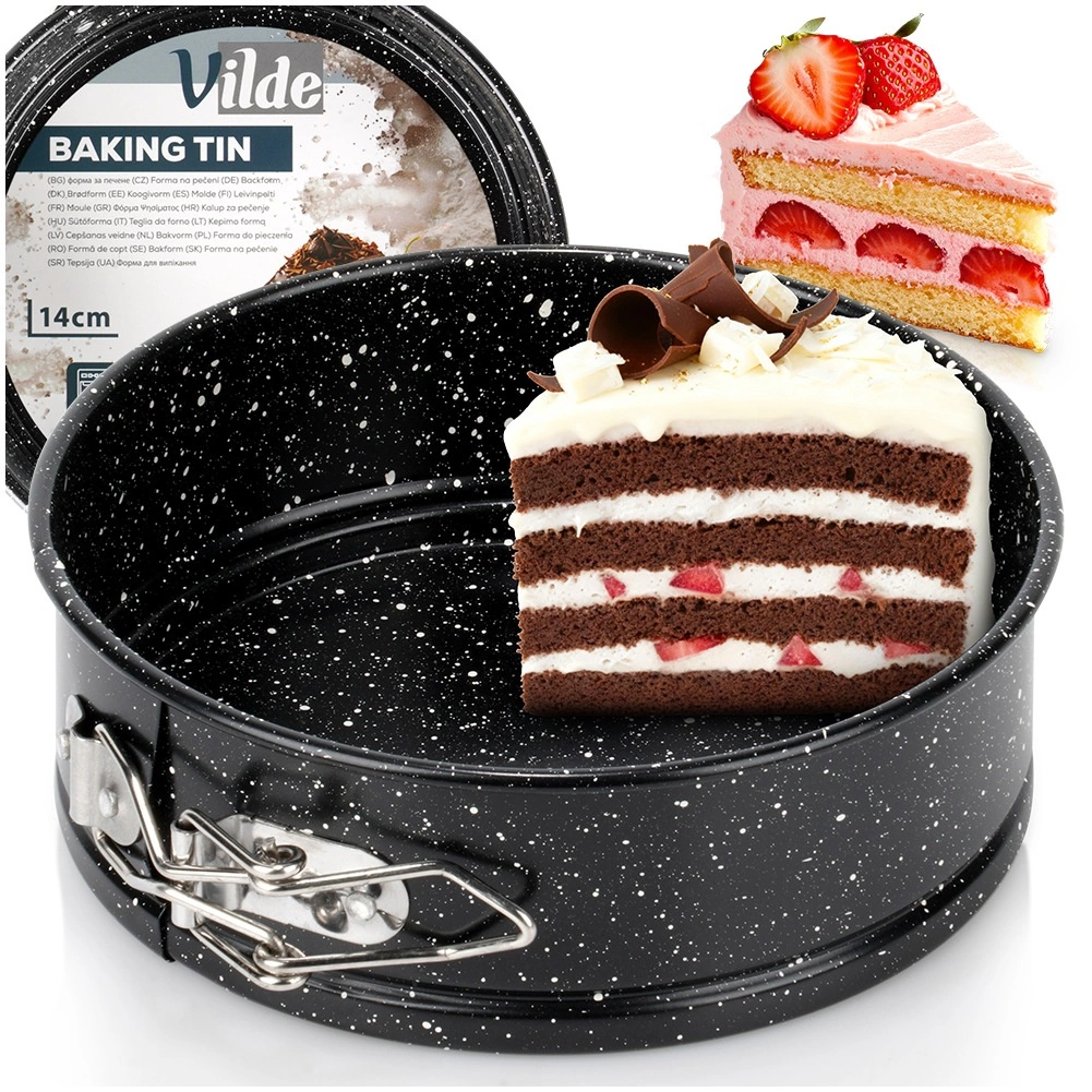 Компактна кръгла форма за торта с диаметър 14 см с разкопчаващ се ръб и подвижно дъно за лесно изваждане на десерти. Изработена от здрава въглеродна стомана с нелепливо гранитно покритие, осигурява равномерно изпичане до 230 °C. Идеална за мини торти, чийзкейкове, бисквитени блатове и студени десерти за всекидневно печене.