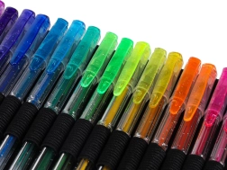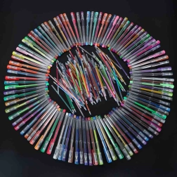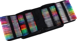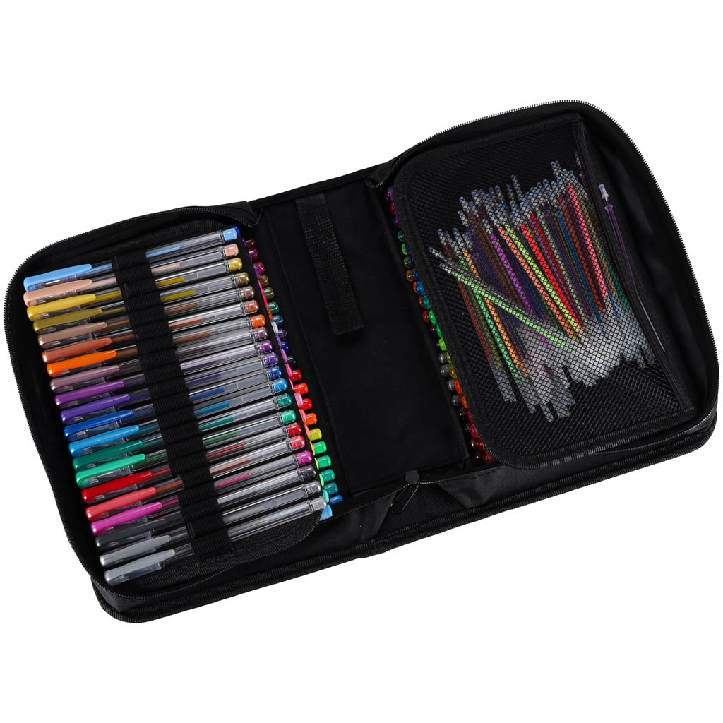 Открийте универсален сет за училище, офис и свободно време: 100 гел химикалки в богата палитра от цветове и ефекти, плюс 100 резервни пълнителя. Прегледният разгъваем несесер с цип държи всяка химикалка на мястото ѝ, така че всички цветове са винаги под ръка и безопасно съхранени.